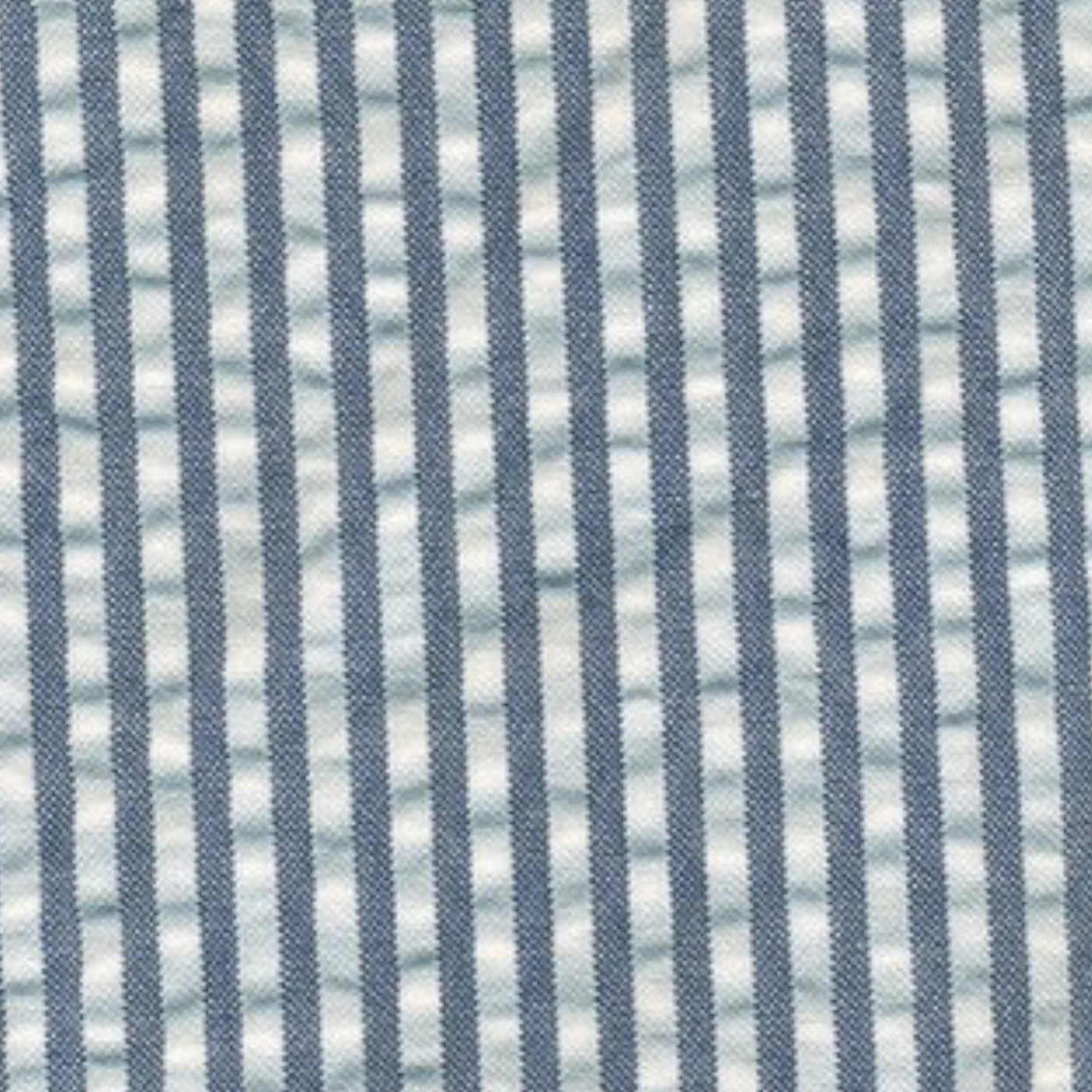 Seersucker-stof is licht, duurzaam en ongelooflijk ademend. Het is zo geweven dat de draden samenklonteren, waardoor de stof een gerimpeld uiterlijk krijgt met opvallende strepen, zoals je hieronder kunt zien. Om als seersucker te worden beschouwd, moet een stof gerimpeld zijn, waardoor de stof een gekreukelde textuur krijgt.