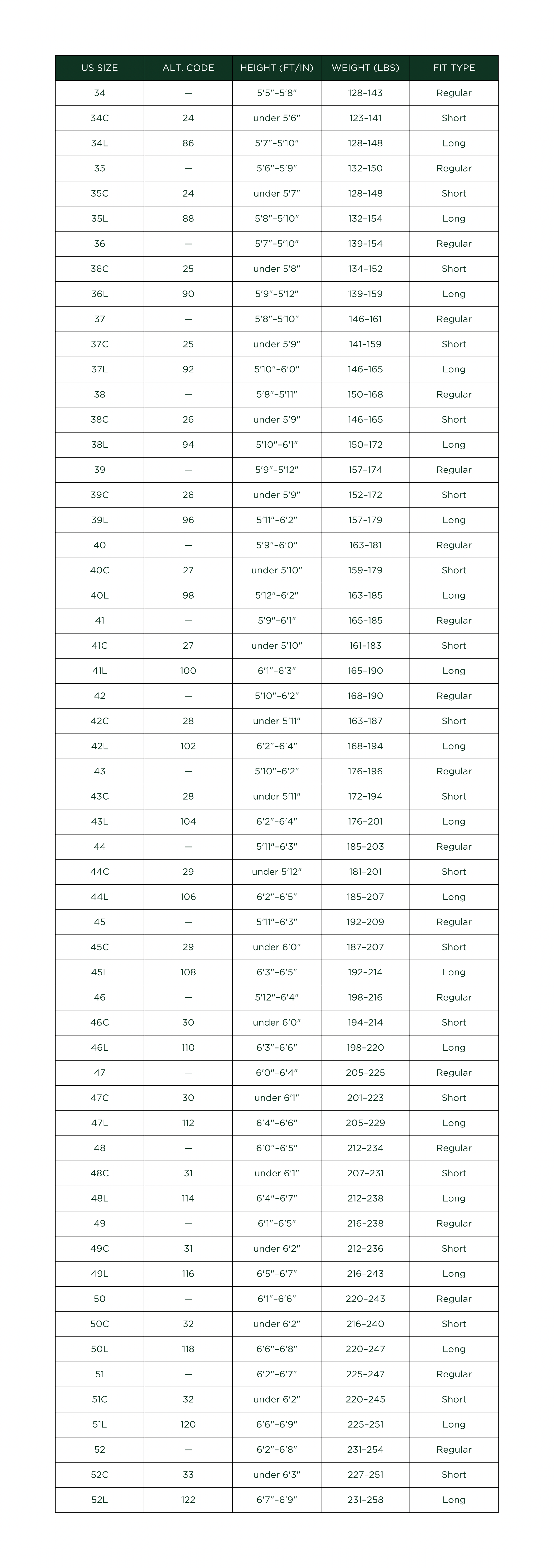 This guide is designed to help you navigate sizing, but it remains an overview. Most items we offer are in standard sizes such as 48, 50, or 52. Lungo (long) and Corto (short) sizes do exist but are less common and are always clearly marked when available.