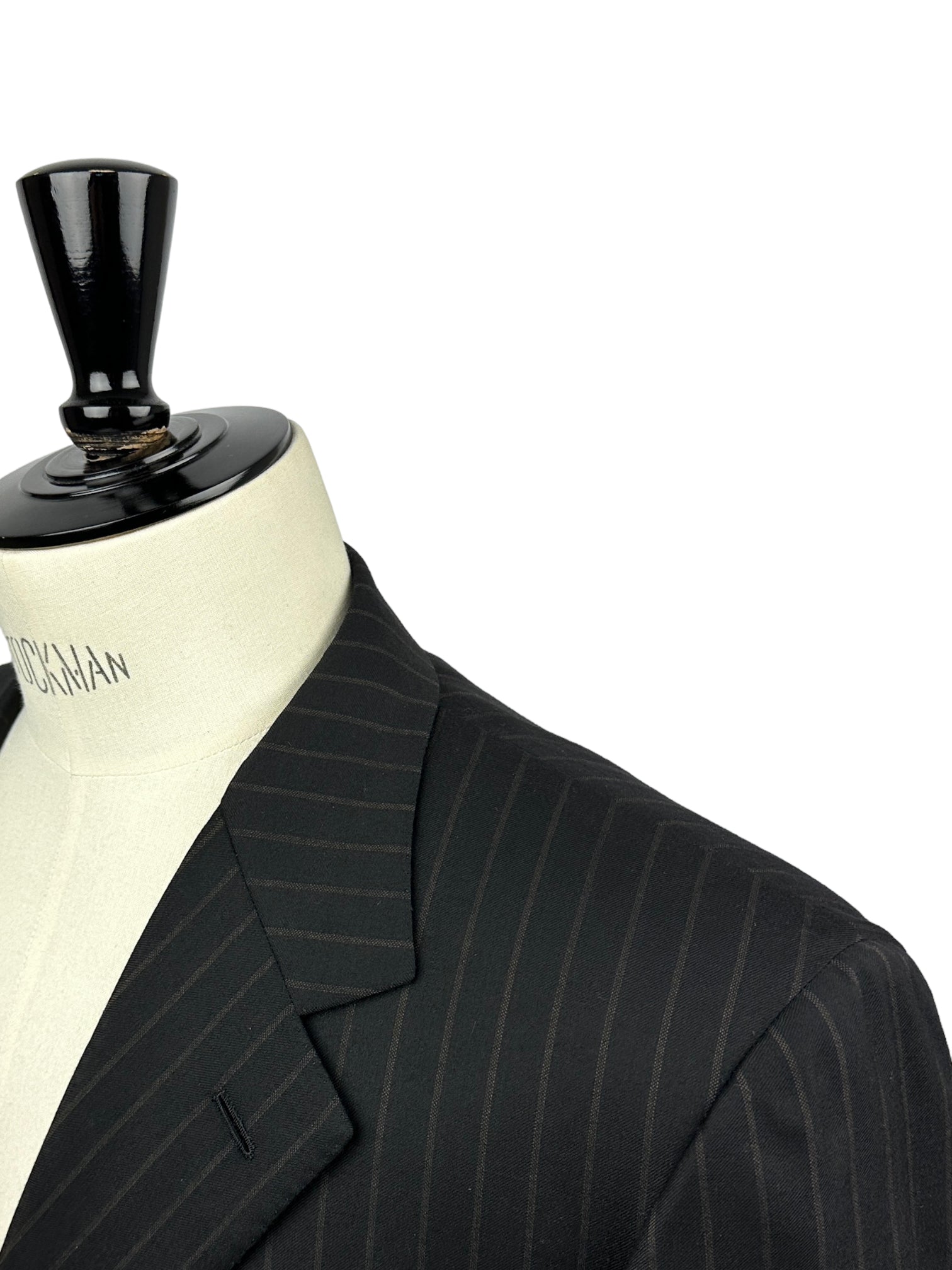 Zwart handgemaakt Brioni Palatino pak. Revers met inkeping, volledig gevoerd, vakkundig vervaardigd uit luxe wol met dubbele zijsplitten aan de achterkant en sluiting met drie knopen om het profiel netjes te houden. De ingekeepte revers en de paspelzak op de borst zijn onmiskenbaar klassiek. Ontdek hieronder de uitgebreide kleermakersdetails.