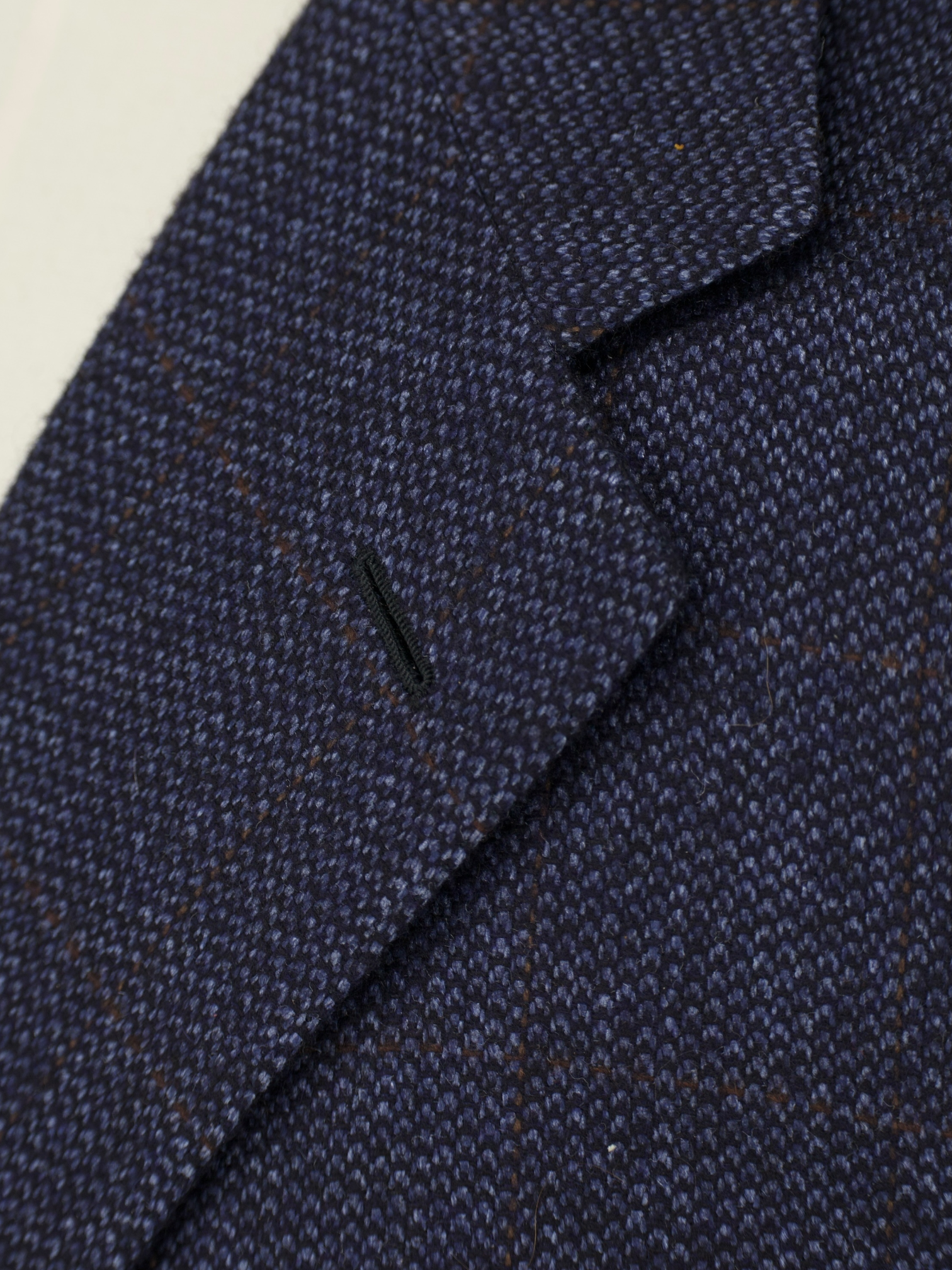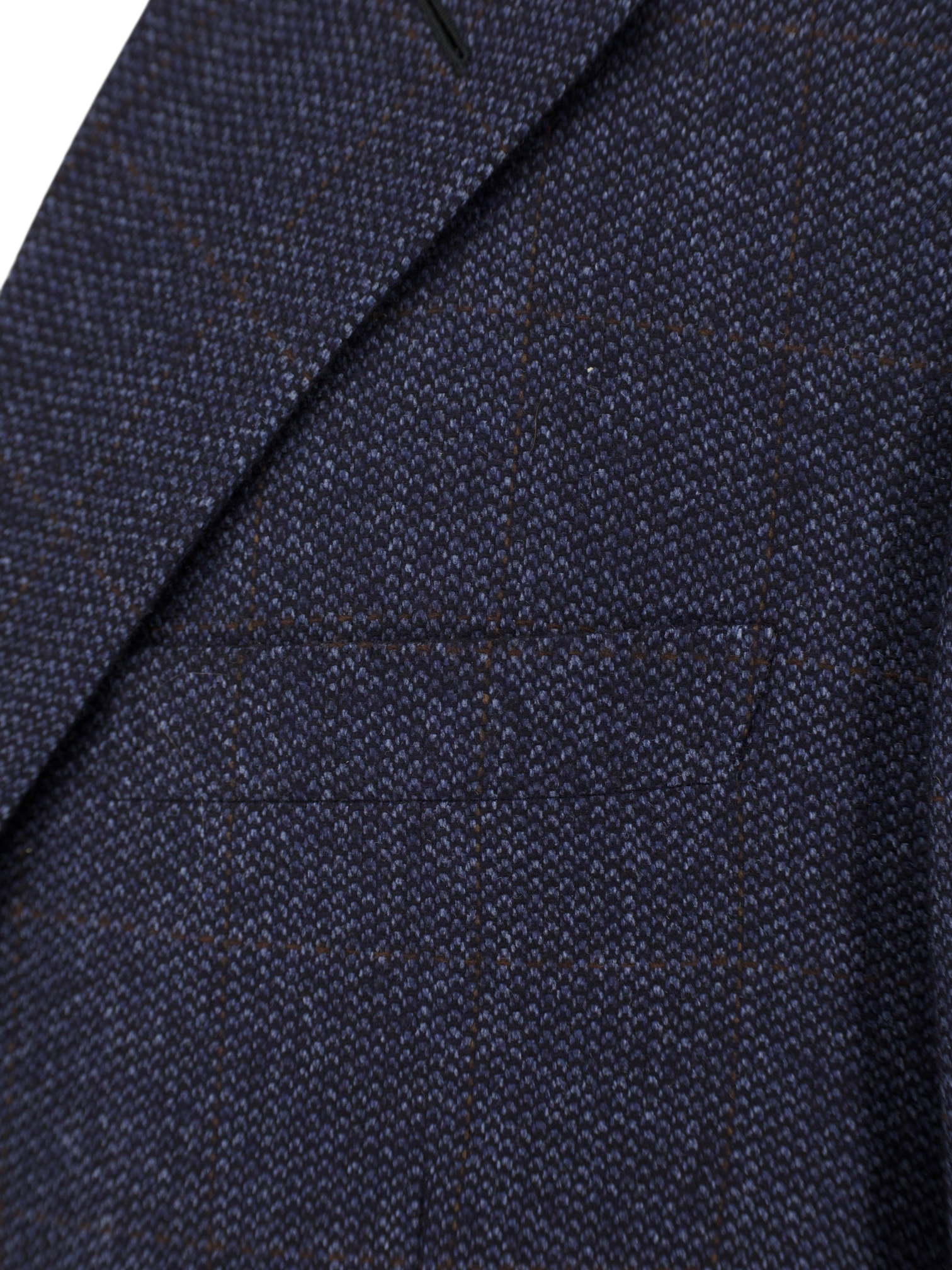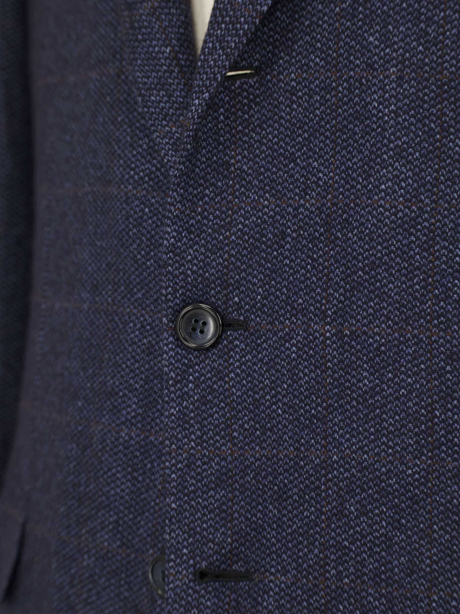 Discover the layered sophistication of this Brioni Senato jacket, tailored in a silk and cashmere blend woven in a rich blue and brown windowpane. The fabric is lightweight with a refined texture, offering a soft drape and a gentle sheen that catches the light without overwhelming. The windowpane check adds structure and visual rhythm, making this an elegant yet quietly expressive choice. Classic details include notch lapels, flap pockets, horn buttons and a full lining for a polished finish.