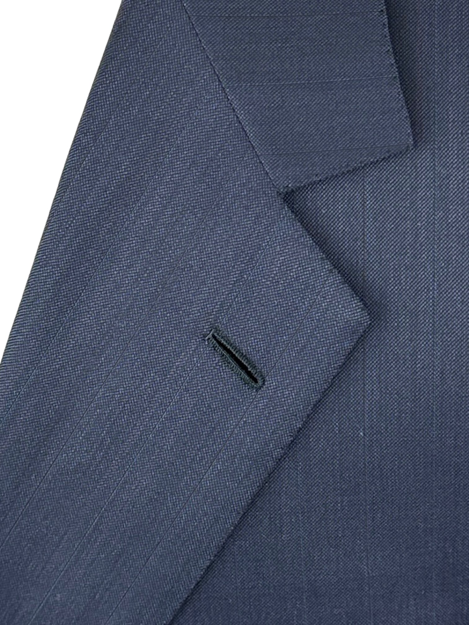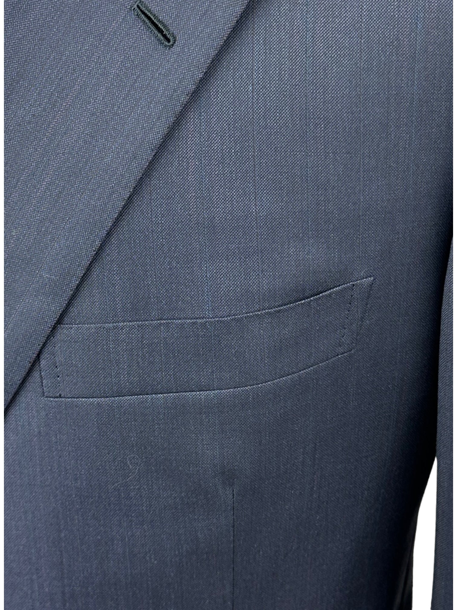 Blauw handgemaakt Brioni pak. Revers met inkeping, volledig gevoerd, vakkundig vervaardigd uit luxe wol met dubbele zijsplitten aan de achterkant en sluiting met twee knopen om het profiel netjes te houden. De ingekeepte revers en de paspelzak op de borst zijn onmiskenbaar klassiek. Ontdek hieronder de uitgebreide kleermakersdetails.