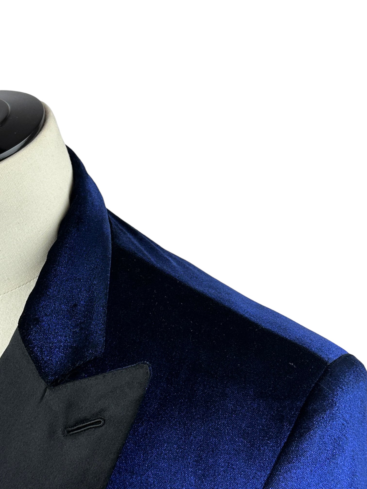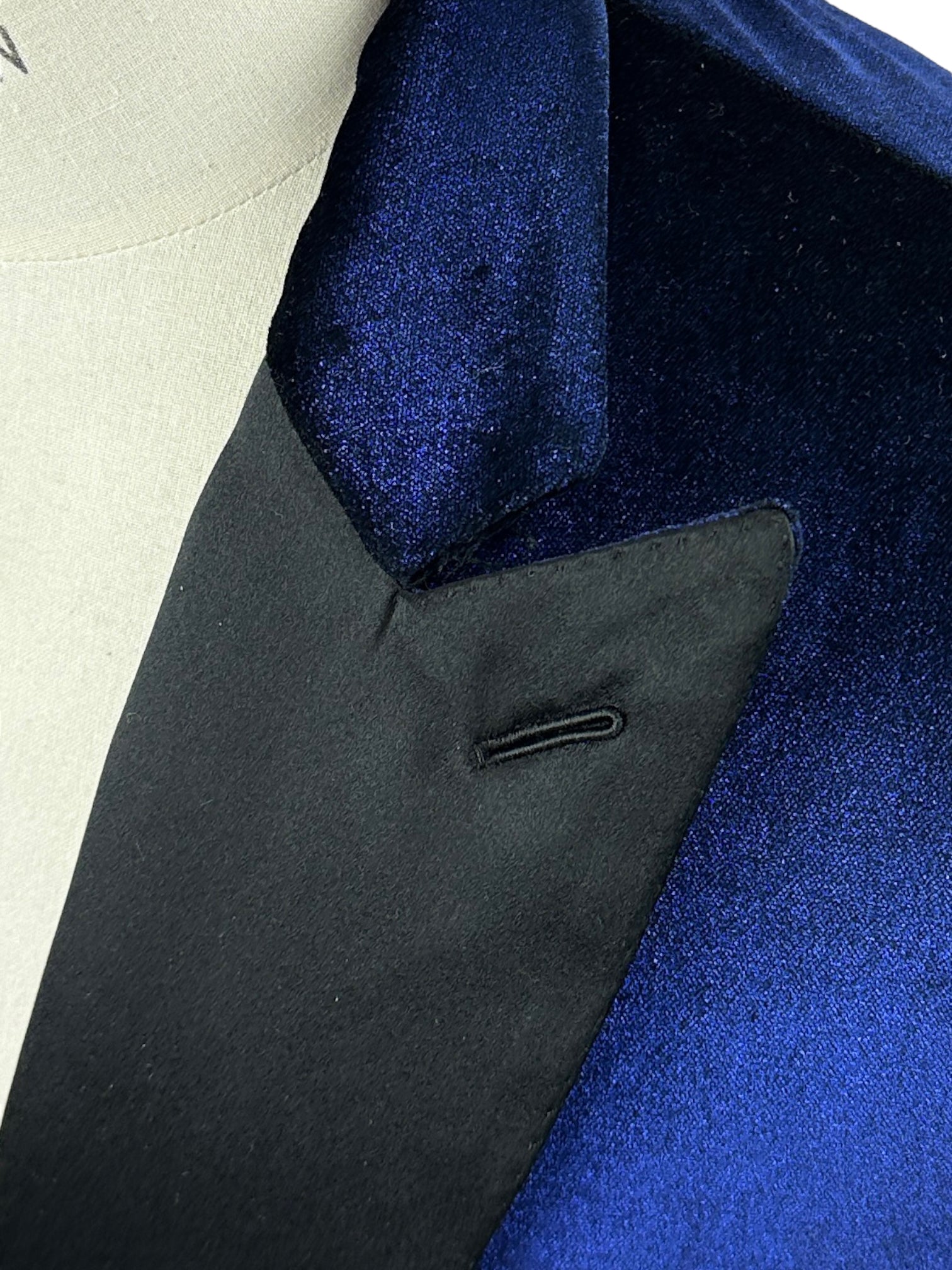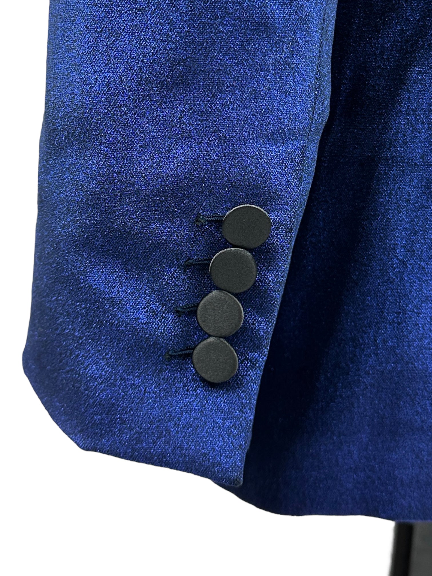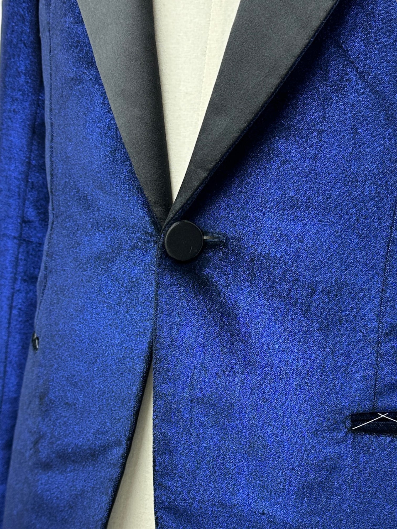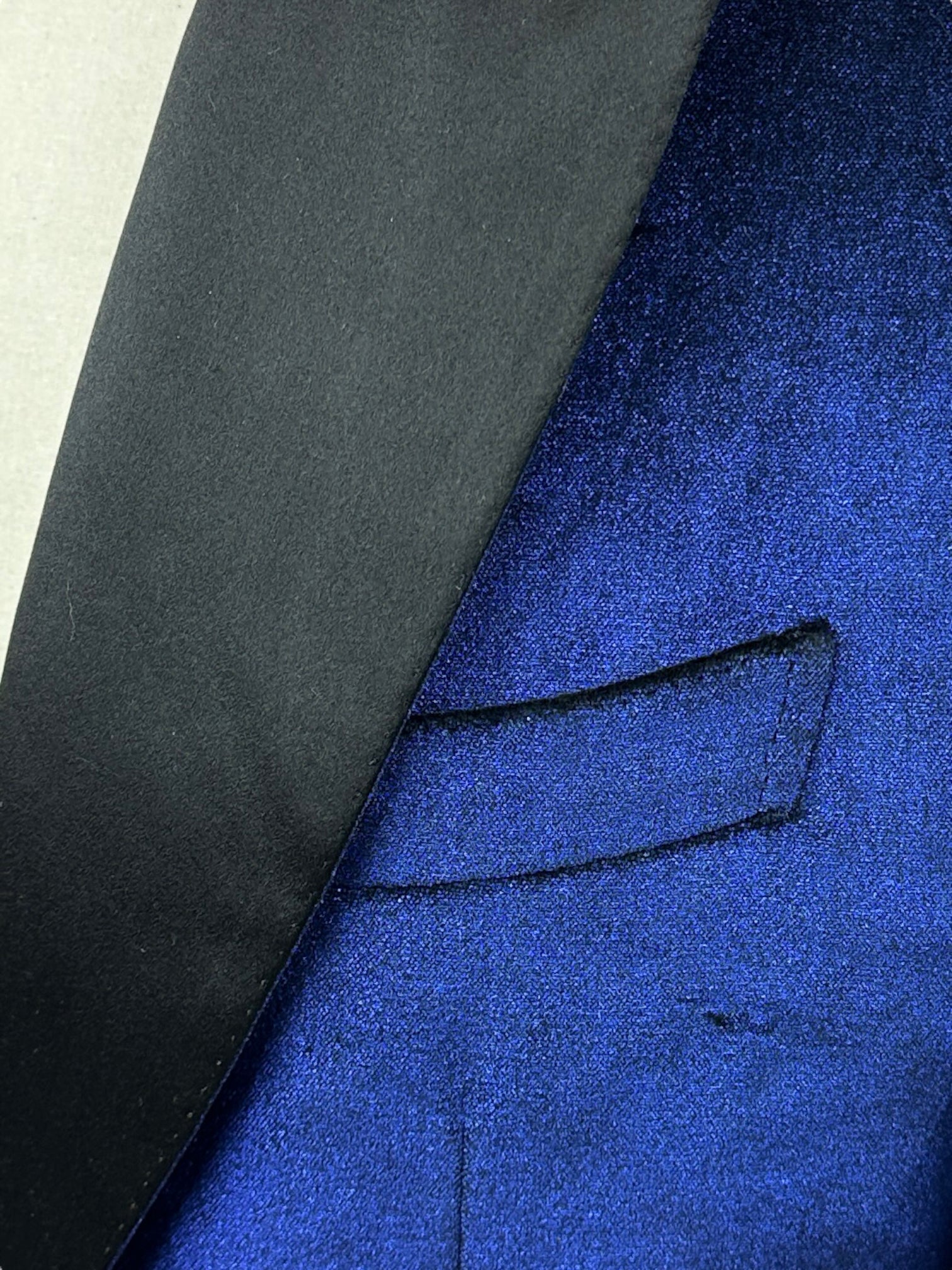 Het smokingjasje heeft peak-revers en is gemaakt van 100% katoen. Het is ontworpen met een enkele knoopsluiting en paspelzakken, die bijdragen aan het strakke en elegante uiterlijk. Deze combinatie van kenmerken, waaronder de piek-revers en katoenen stof, geeft het jasje een onderscheidende kleermakerselegantie. Ontdek hieronder de uitgebreide kleermakersdetails.