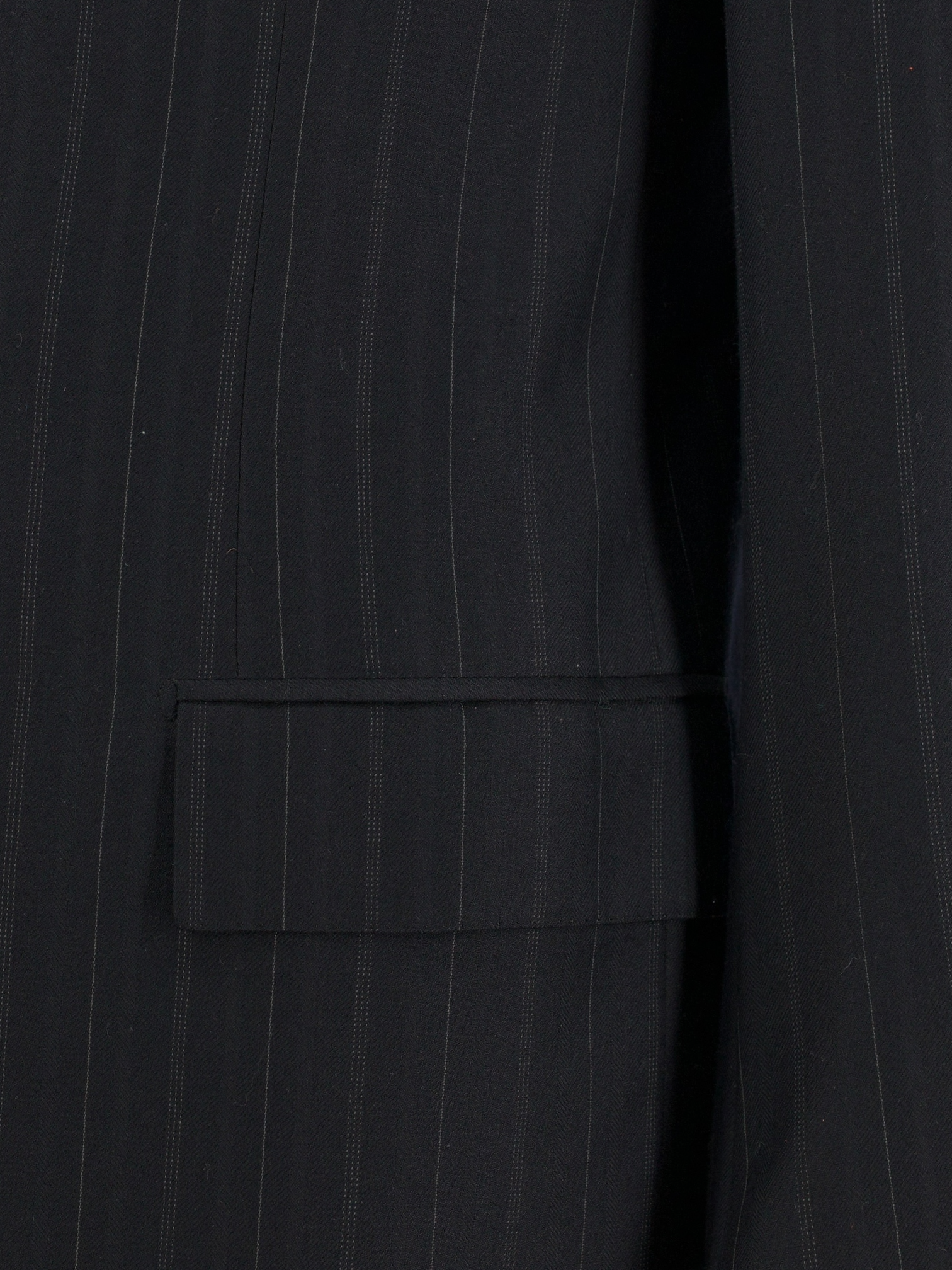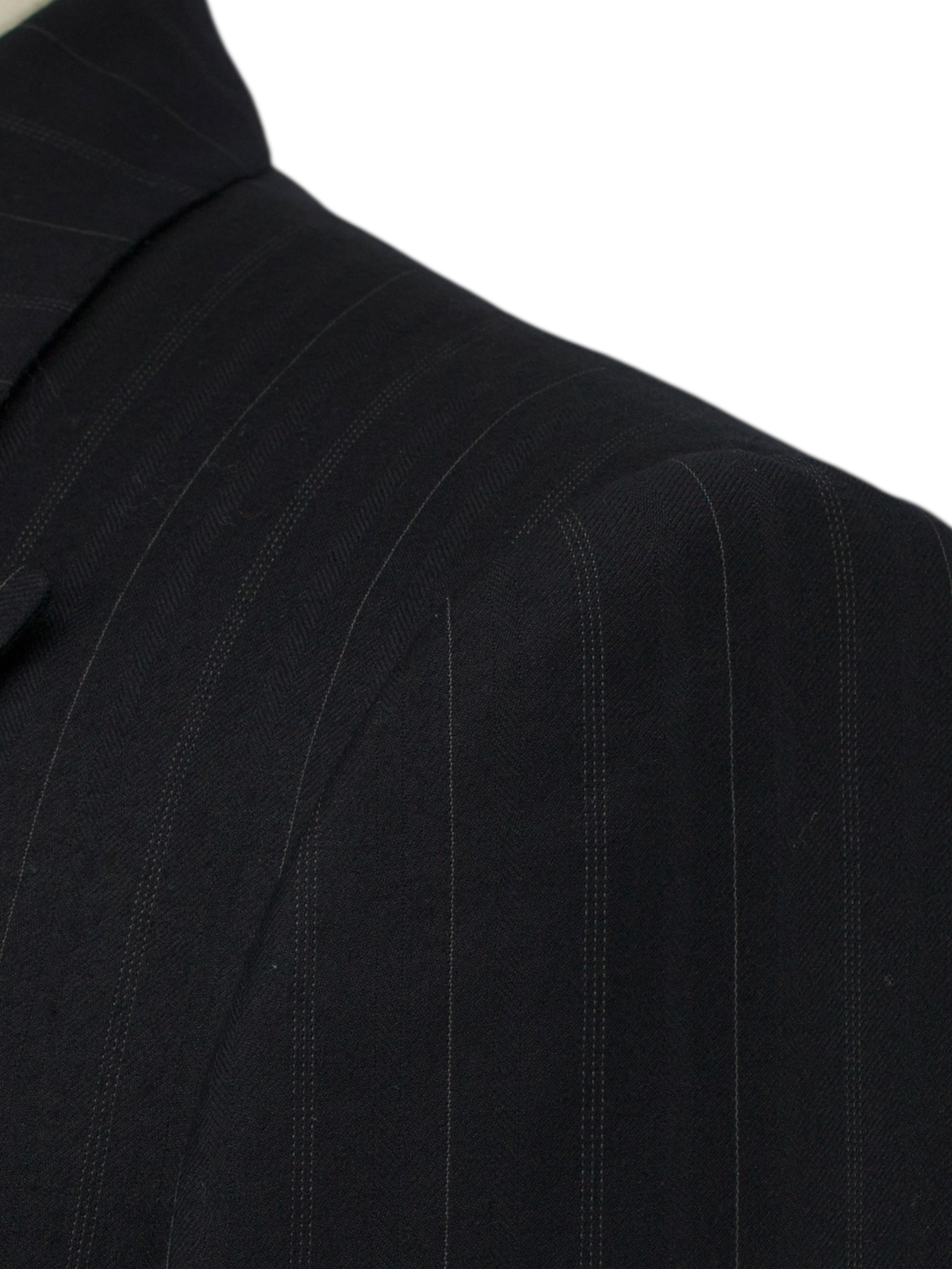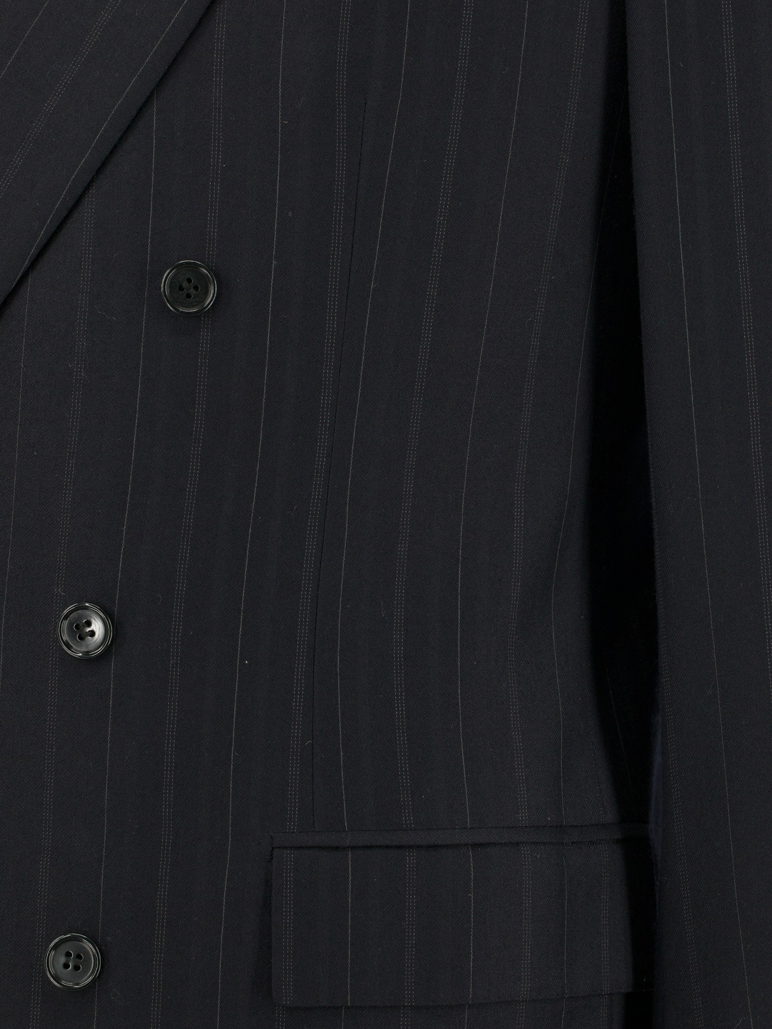 Discover the Brioni navy vintage wool double-breasted pinstripe suit, a striking expression of Roman tailoring with unmistakable presence. The cloth is a rich navy wool woven with multiple fine pinstripes, creating a subtle rhythm across the surface that feels sharp but not overpowering. The jacket features strong, structured shoulders and a full lining for a clean, commanding silhouette, with wide peak lapels that frame the chest in classic Brioni fashion. Its six-button front sits confidently without being bulky, while flap pockets anchor the design in traditional elegance. The overall impression is bold yet timeless, echoing the glamour of mid-century Italian tailoring.