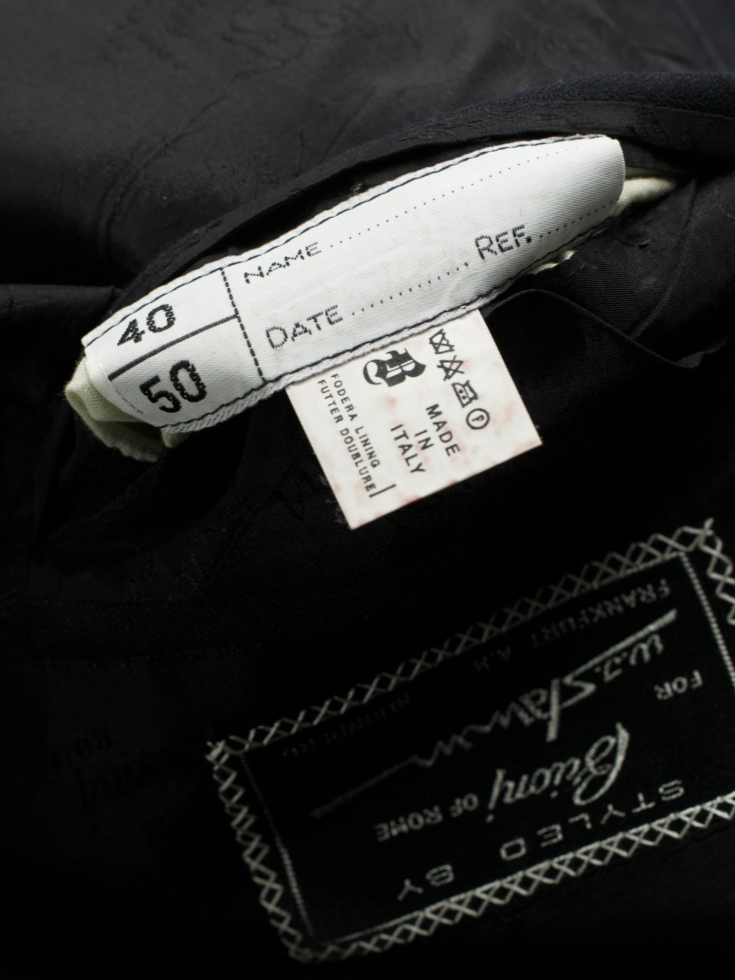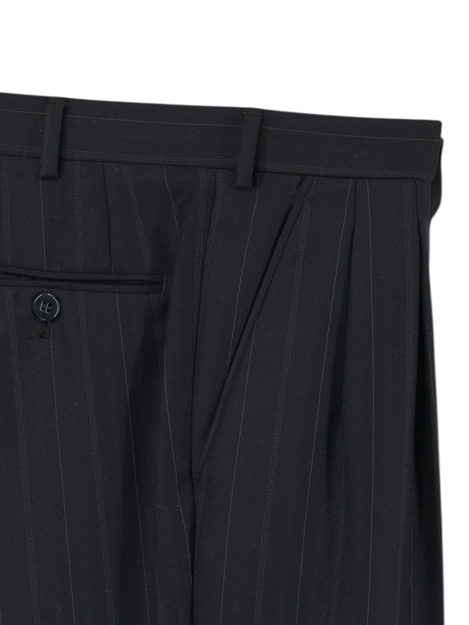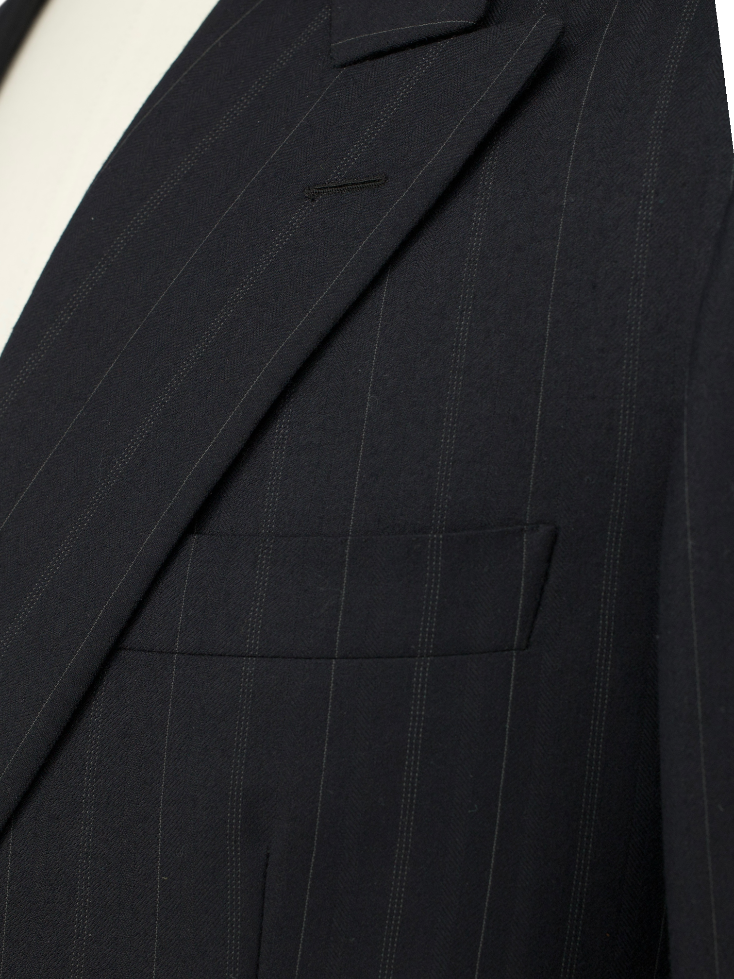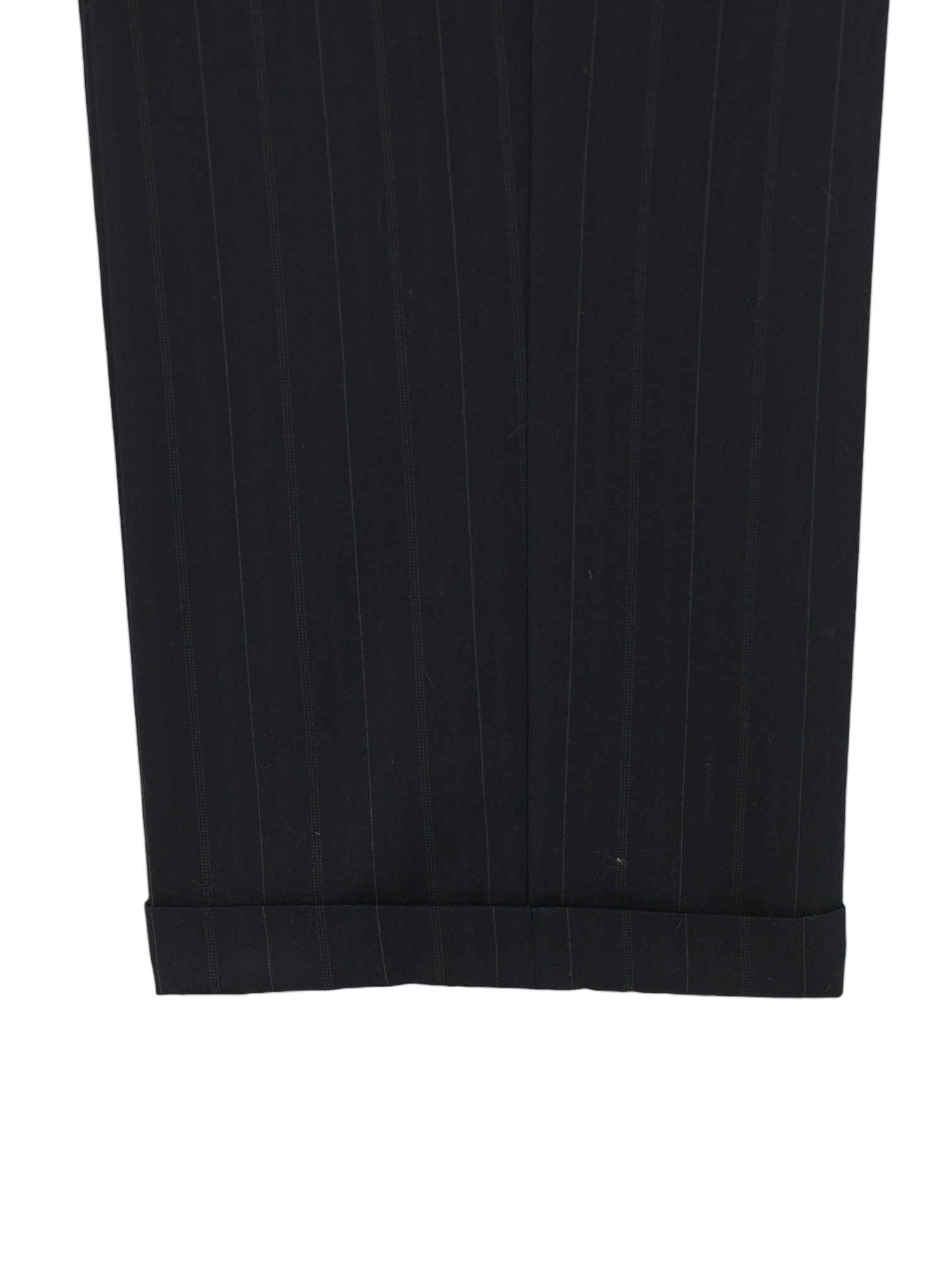 Discover the Brioni navy vintage wool double-breasted pinstripe suit, a striking expression of Roman tailoring with unmistakable presence. The cloth is a rich navy wool woven with multiple fine pinstripes, creating a subtle rhythm across the surface that feels sharp but not overpowering. The jacket features strong, structured shoulders and a full lining for a clean, commanding silhouette, with wide peak lapels that frame the chest in classic Brioni fashion. Its six-button front sits confidently without being bulky, while flap pockets anchor the design in traditional elegance. The overall impression is bold yet timeless, echoing the glamour of mid-century Italian tailoring.