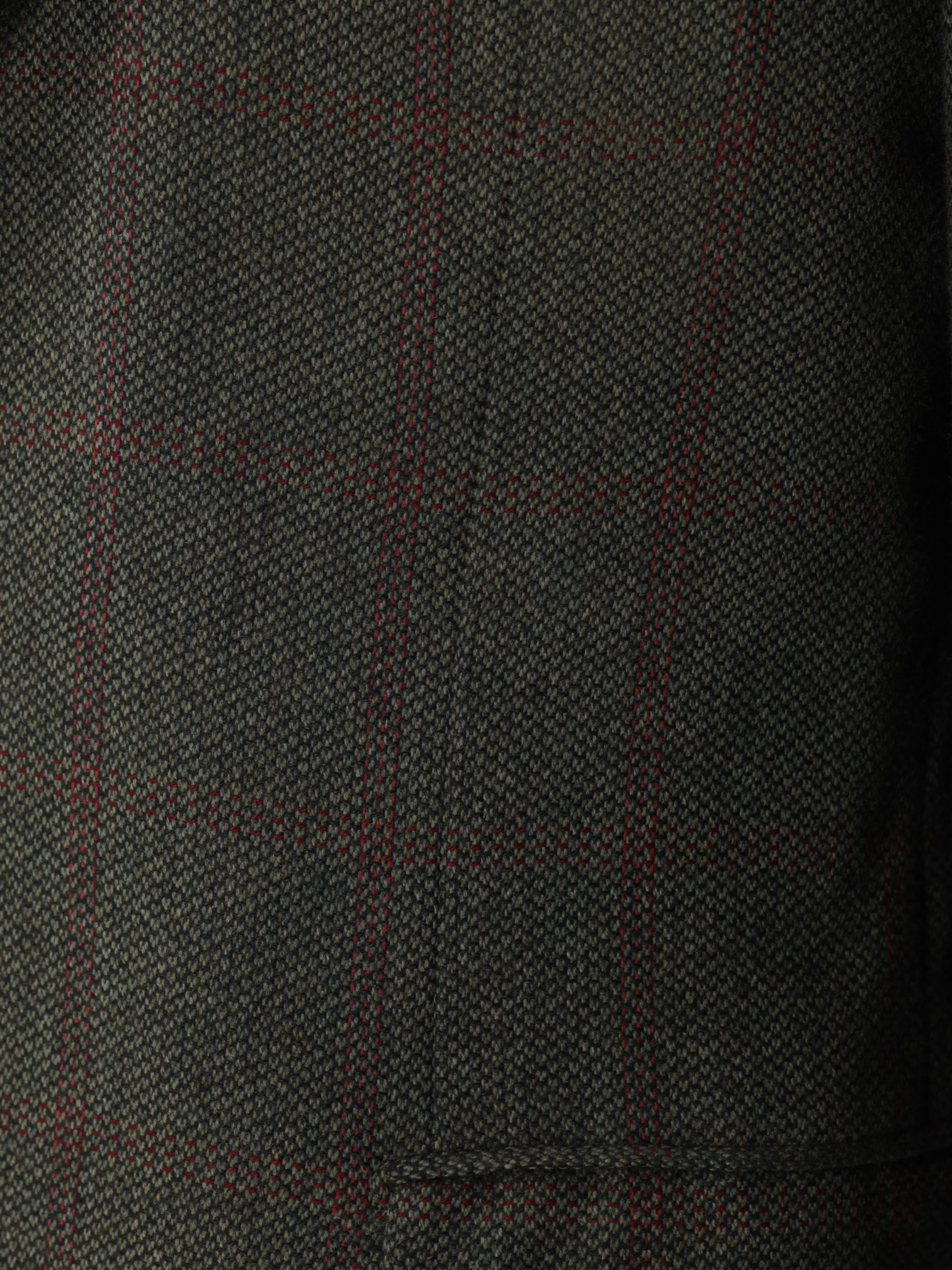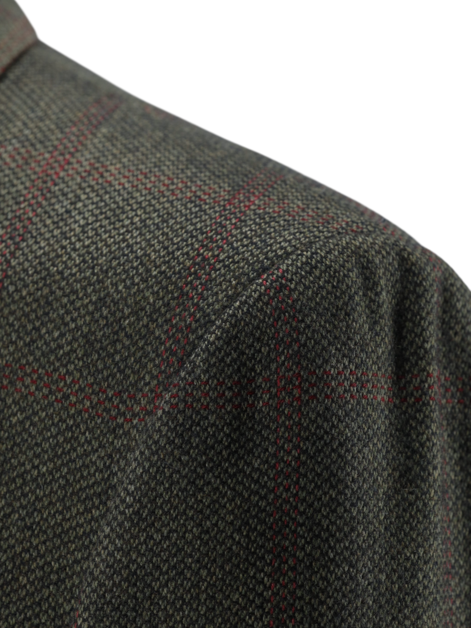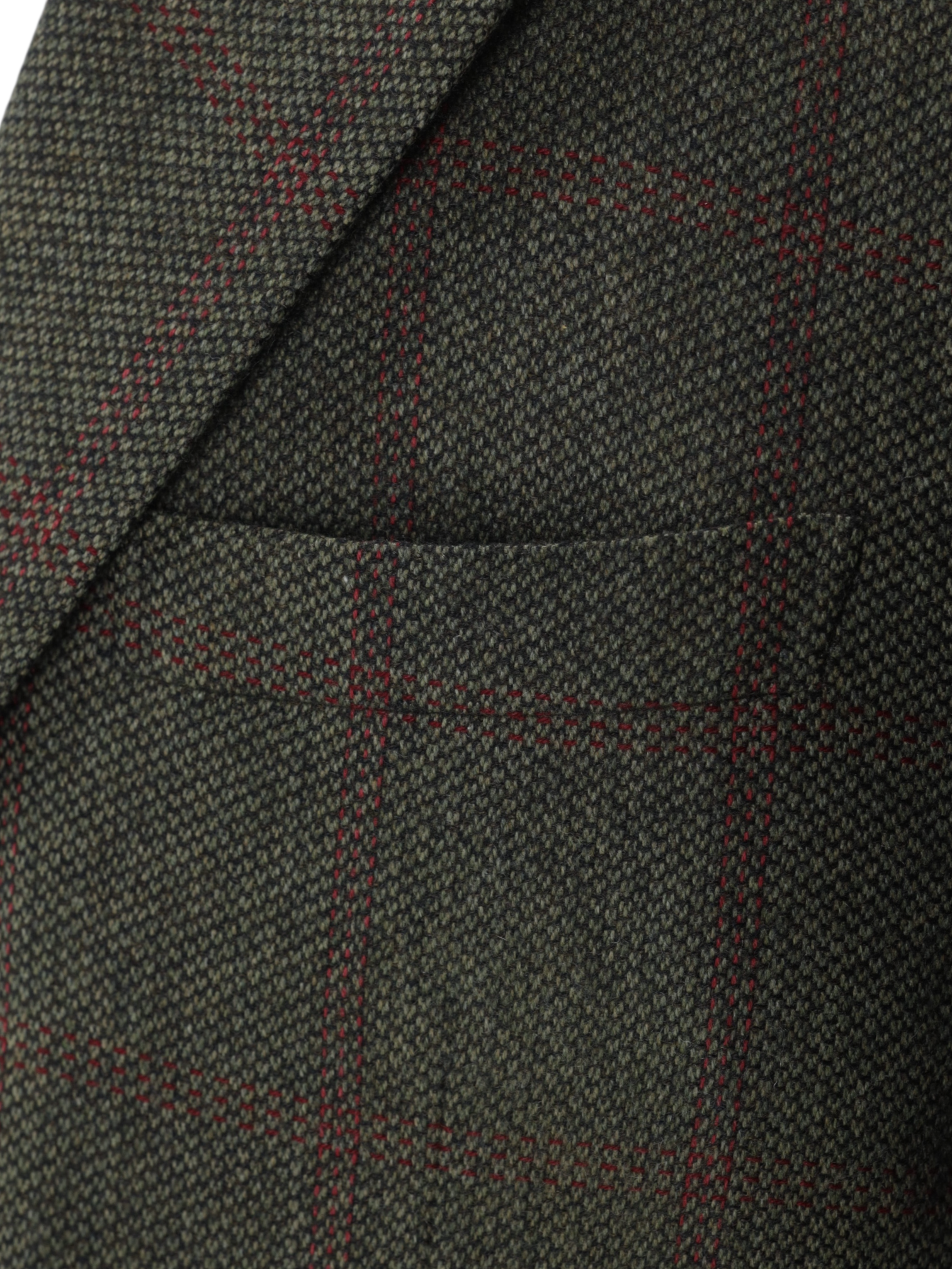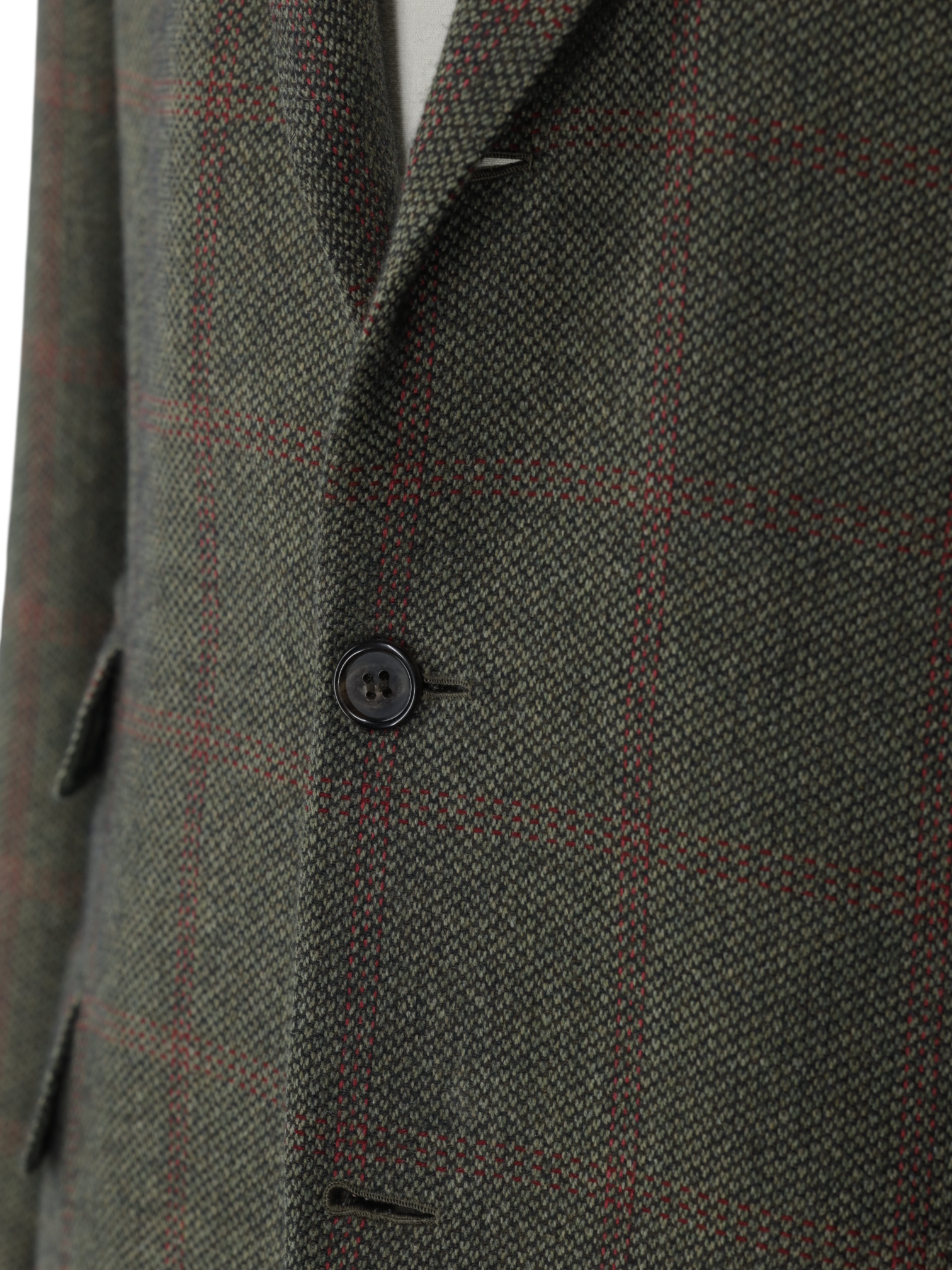 Discover the Brioni olive green and red windowpane jacket, tailored from pure cashmere with a subtle micro-pattern that adds texture beneath the bold check. The olive tone is rich and understated, lifted by fine red windowpane lines that echo the jacket’s striking red lining. Cut with notch lapels placed at a low gorge and Roman-style shoulders, the silhouette is sharp yet composed. A 2.5 button front, flap pockets with a ticket pocket, and two horn buttons at each cuff complete the look with quiet individuality.