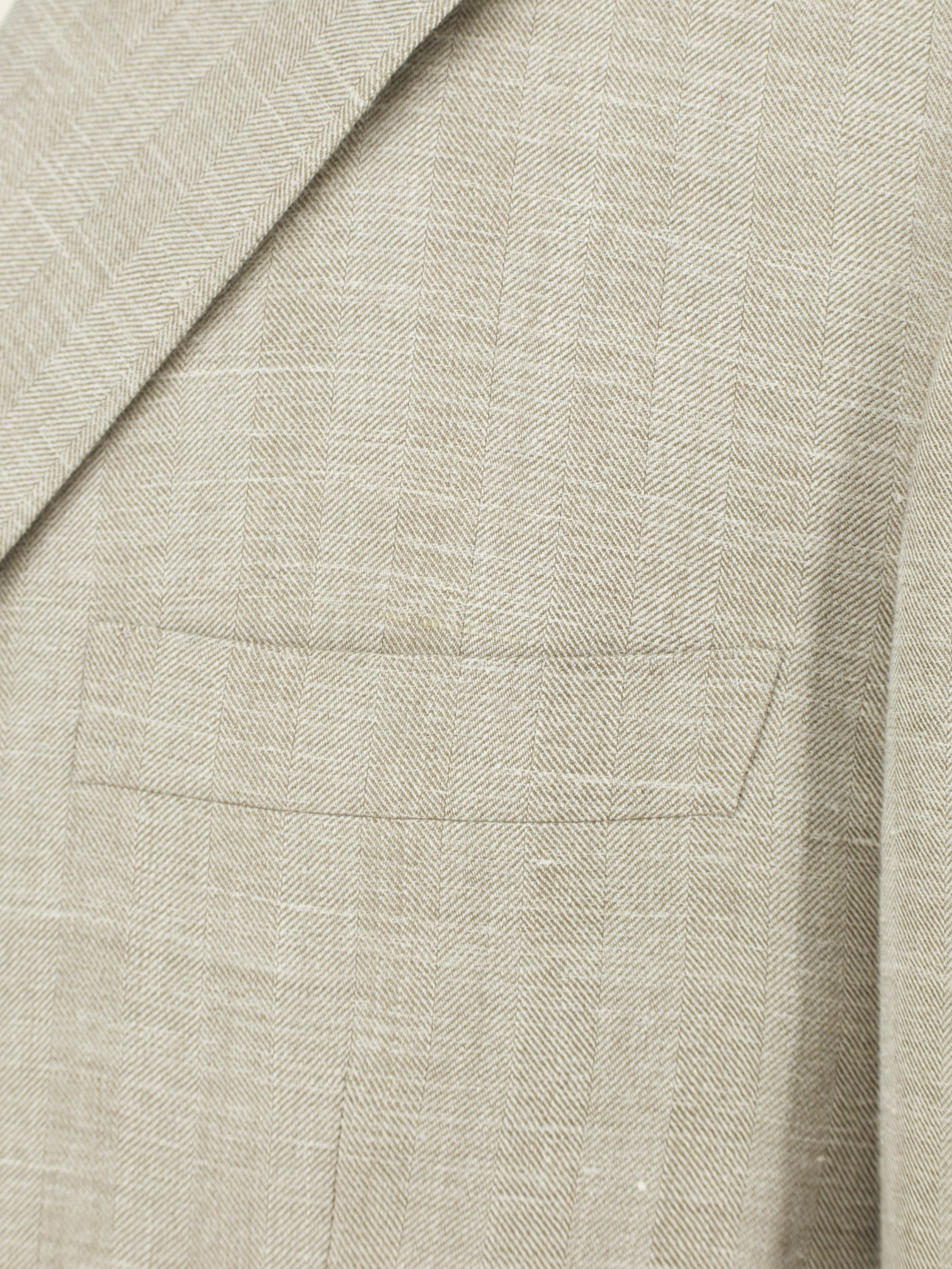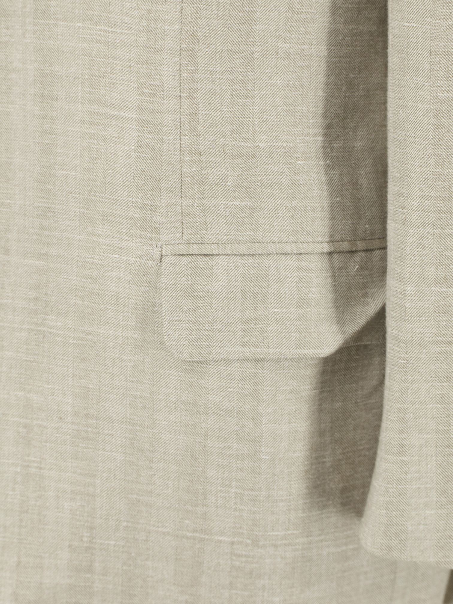 Discover the nuanced texture of this Brioni Palatino jacket, tailored from a refined blend of cashmere, silk and linen in an understated taupe herringbone. The fabric offers a dry, breathable feel with a soft hand and gentle lustre, while the herringbone weave adds depth without excess formality. With notch lapels, flap pockets, horn buttons and a full lining, the jacket reflects Brioni’s commitment to elegant restraint and impeccable finish.