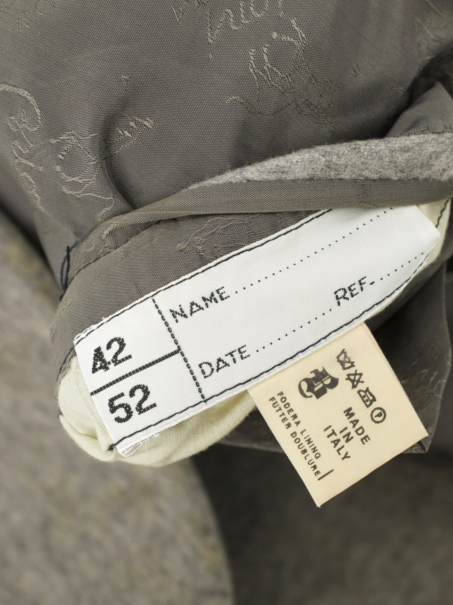 Discover the quiet authority of this vintage Brioni jacket, tailored in a light grey pure cashmere with an unmistakably plush handle. The texture is rich and substantial, reminiscent more of outerwear than traditional suiting cloth, giving it a luxurious weight and presence. Defined by strong Roman shoulders and a sharp silhouette, it features classic notch lapels, flap pockets, and a fully lined interior for structure and balance. The overall impression is one of refined confidence, executed with Brioni’s signature precision.