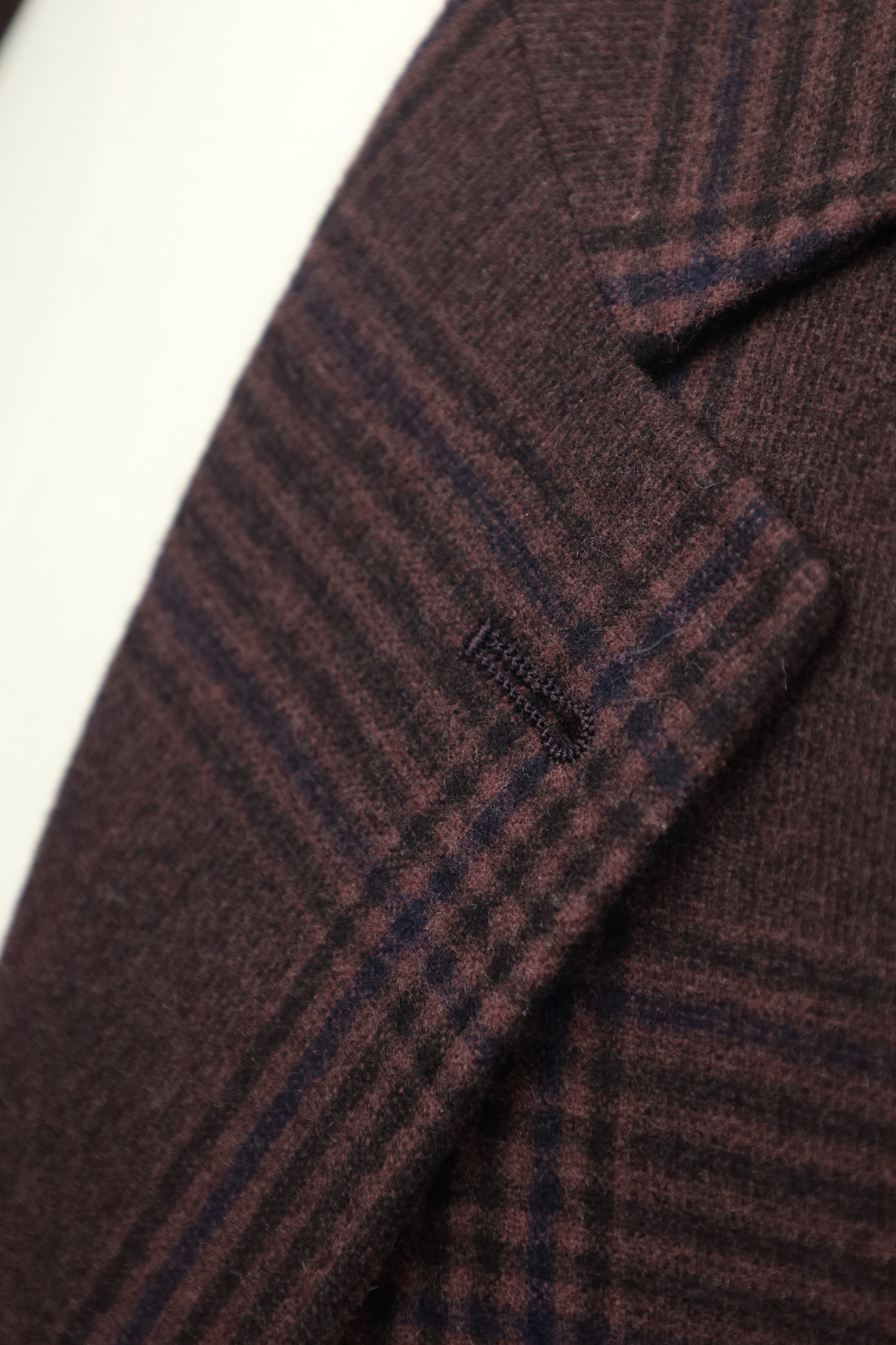 Diagonaal geplaatste knoopsgaten - een typisch detail van Brunello Cucinelli. Functionele kissing buttons - Ook bekend als gestapelde knopen of watervalknopen, kissing buttons worden geassocieerd met Italiaans kleermakerswerk omdat Italiaanse kleermakers hun knoopsgaten op de mouw van het jasje maken in de kissing-stijl. In deze stijl raken de knopen elkaar en overlappen ze elkaar.