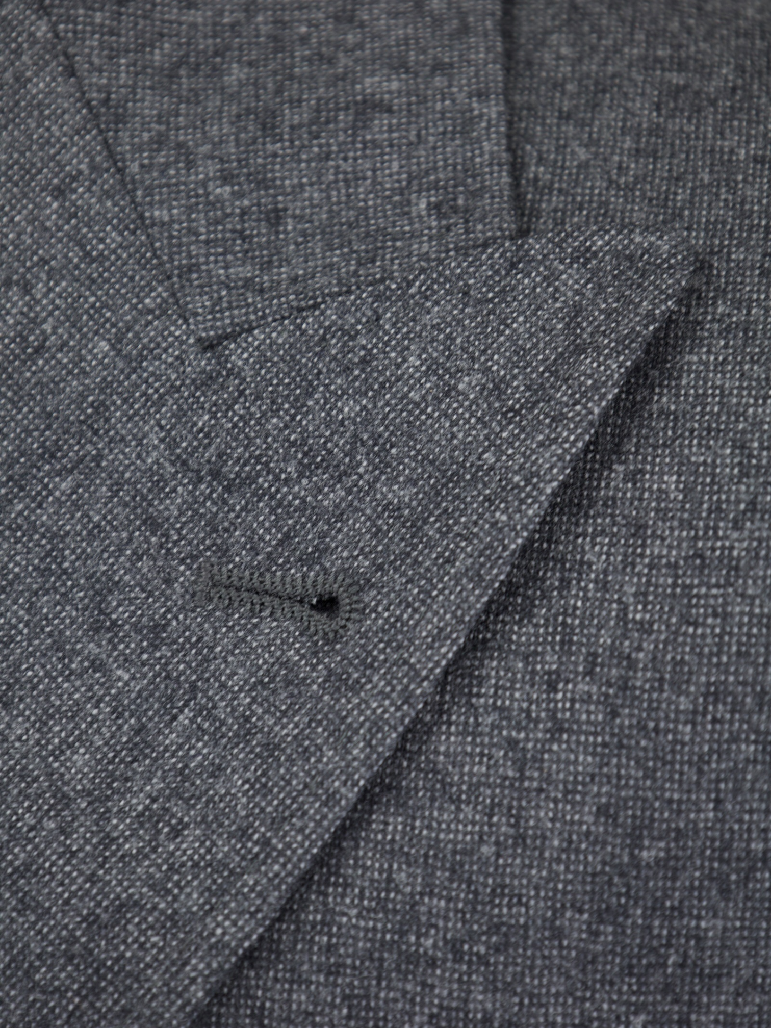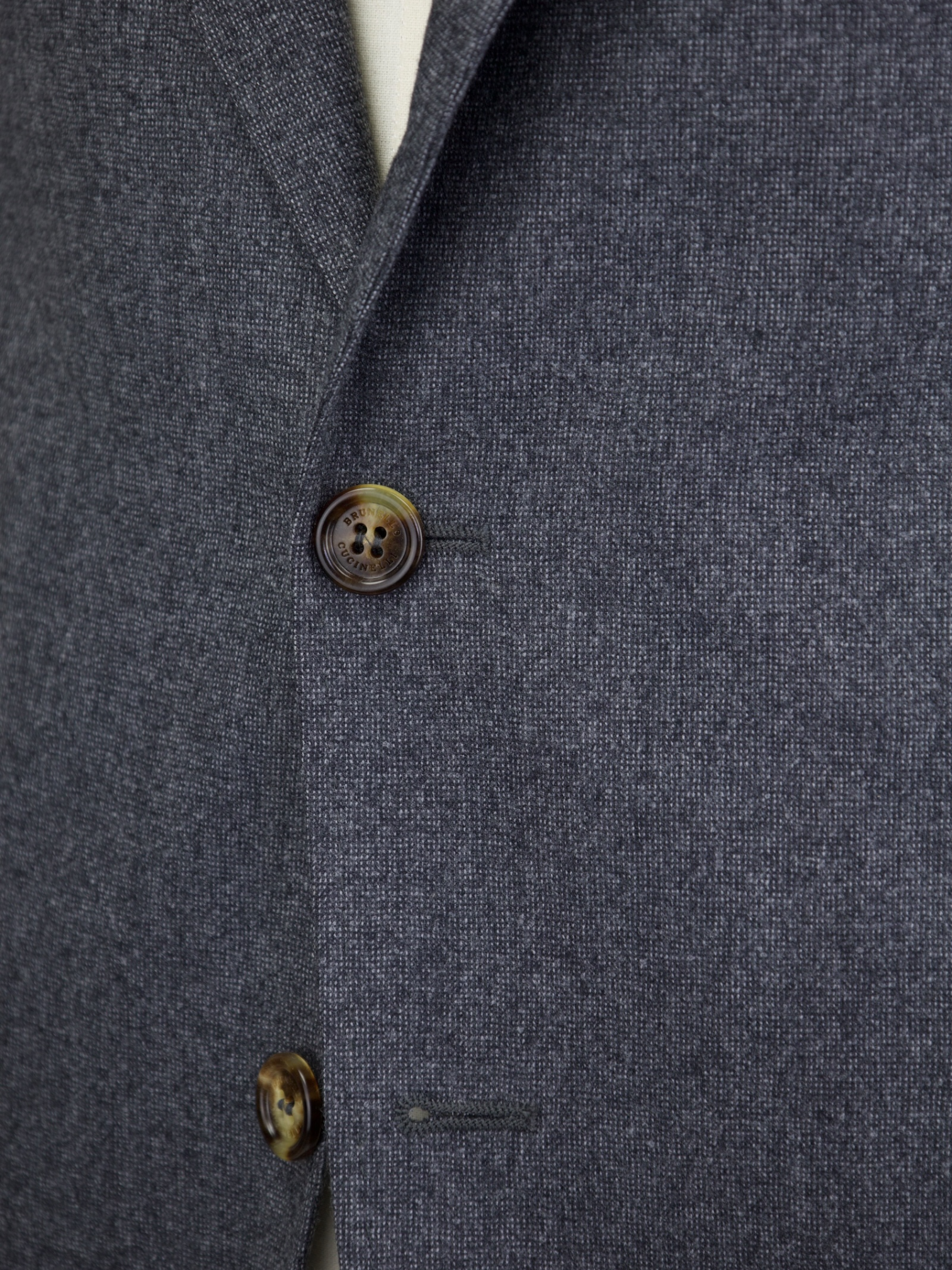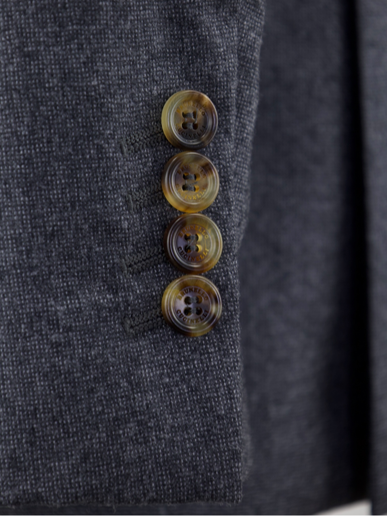 Diagonaal geplaatste knoopsgaten - een typisch detail van Brunello Cucinelli. Functionele kissing buttons - Ook bekend als gestapelde knopen of watervalknopen, kissing buttons worden geassocieerd met Italiaans kleermakerswerk omdat Italiaanse kleermakers hun knoopsgaten op de mouw van het jasje maken in de kissing-stijl. In deze stijl raken de knopen elkaar en overlappen ze elkaar.