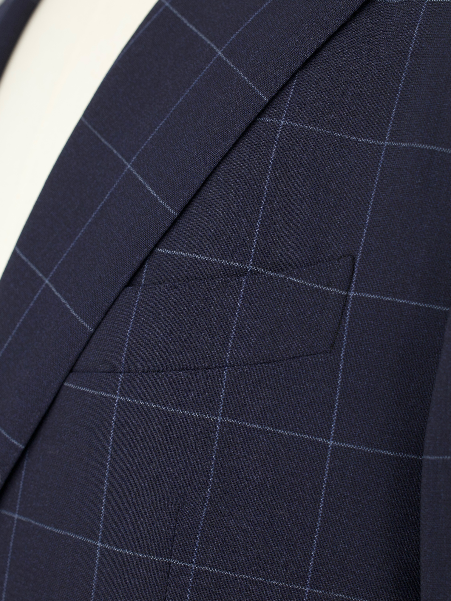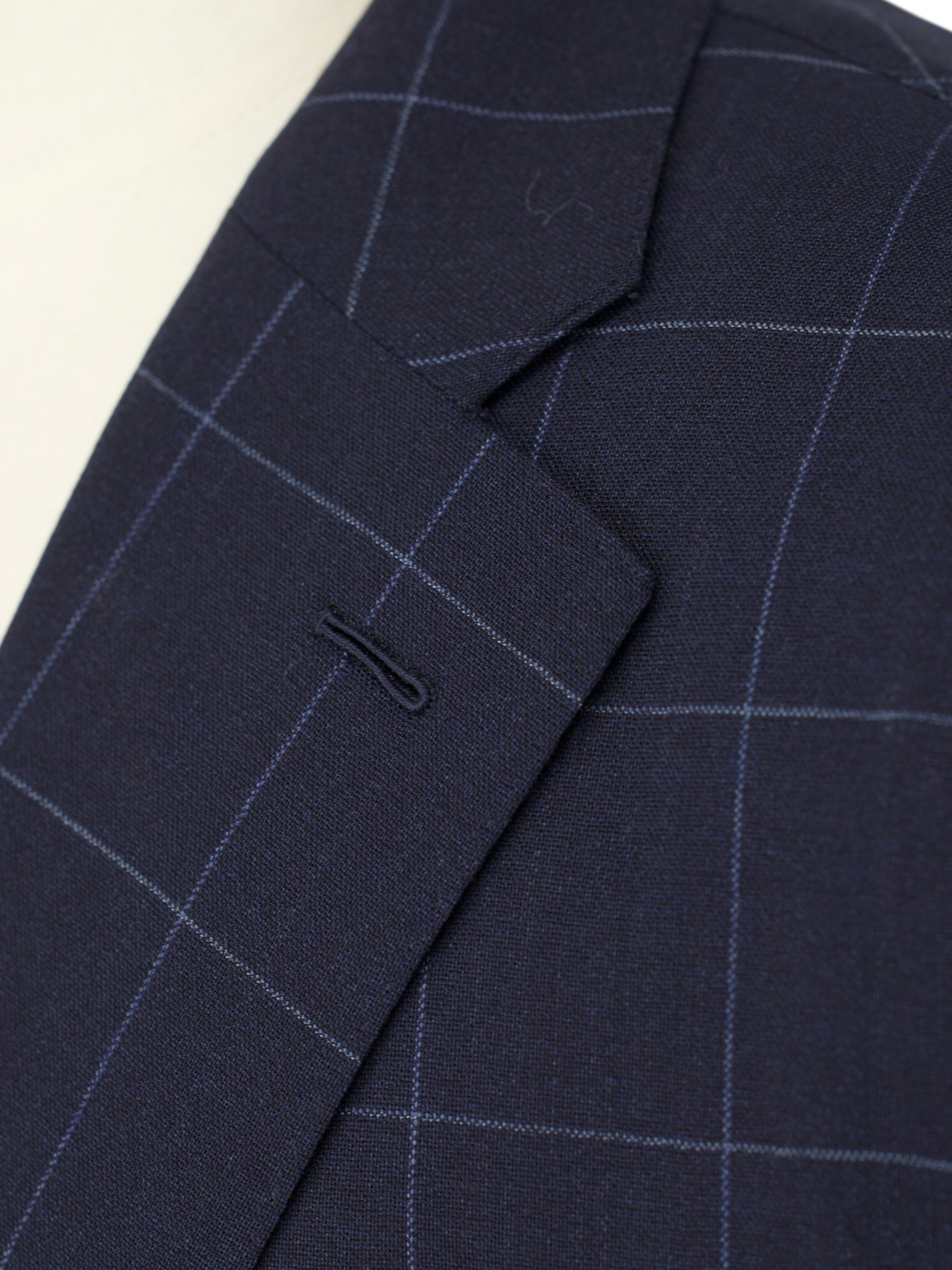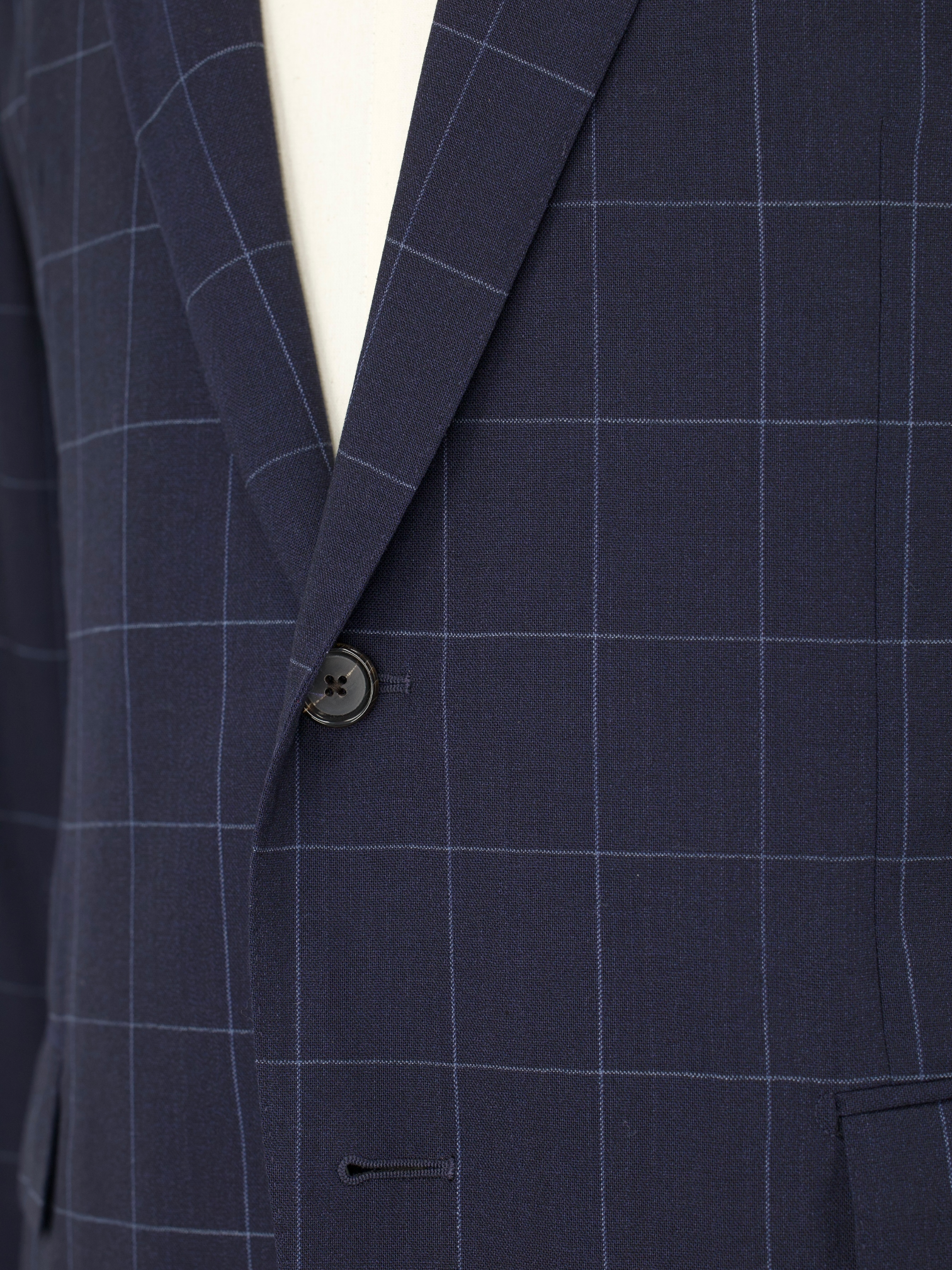 Discover the understated charm of this Caruso suit, tailored in a lightweight wool with a navy and light blue windowpane that adds just the right amount of detail. The fabric has a dry, breathable finish that wears well through warmer months or long days indoors. The jacket is cut with notch lapels, soft shoulders, flap pockets, and a fully lined interior, all shaped in Caruso’s relaxed take on classic Milanese tailoring.
