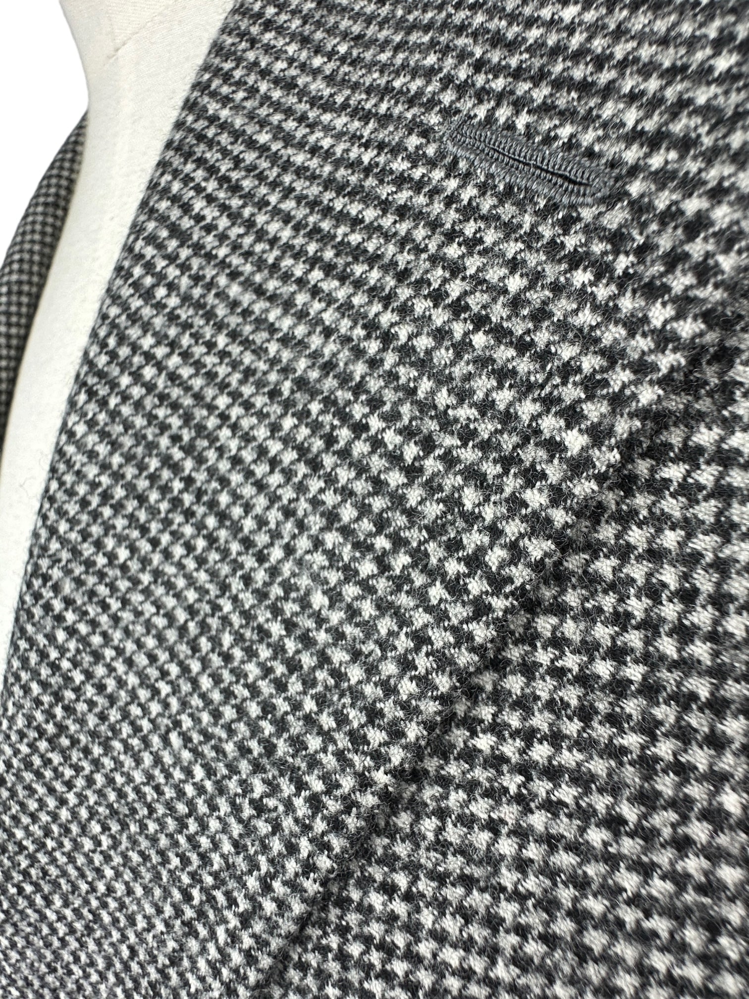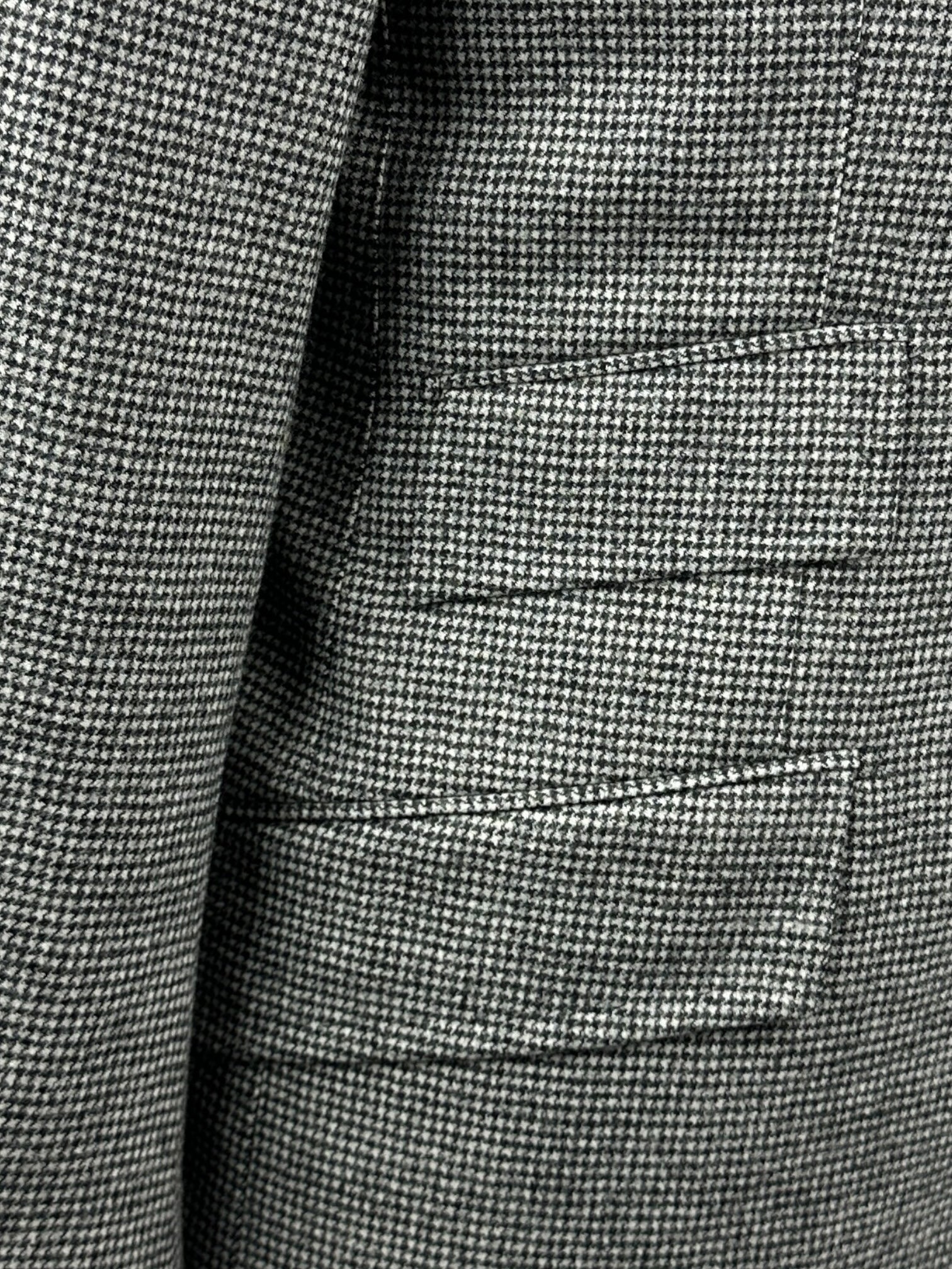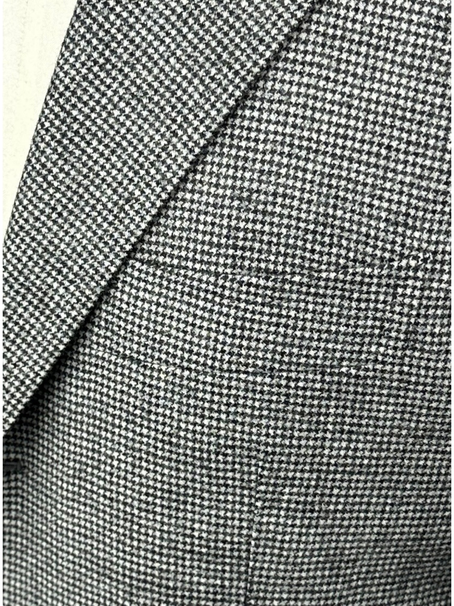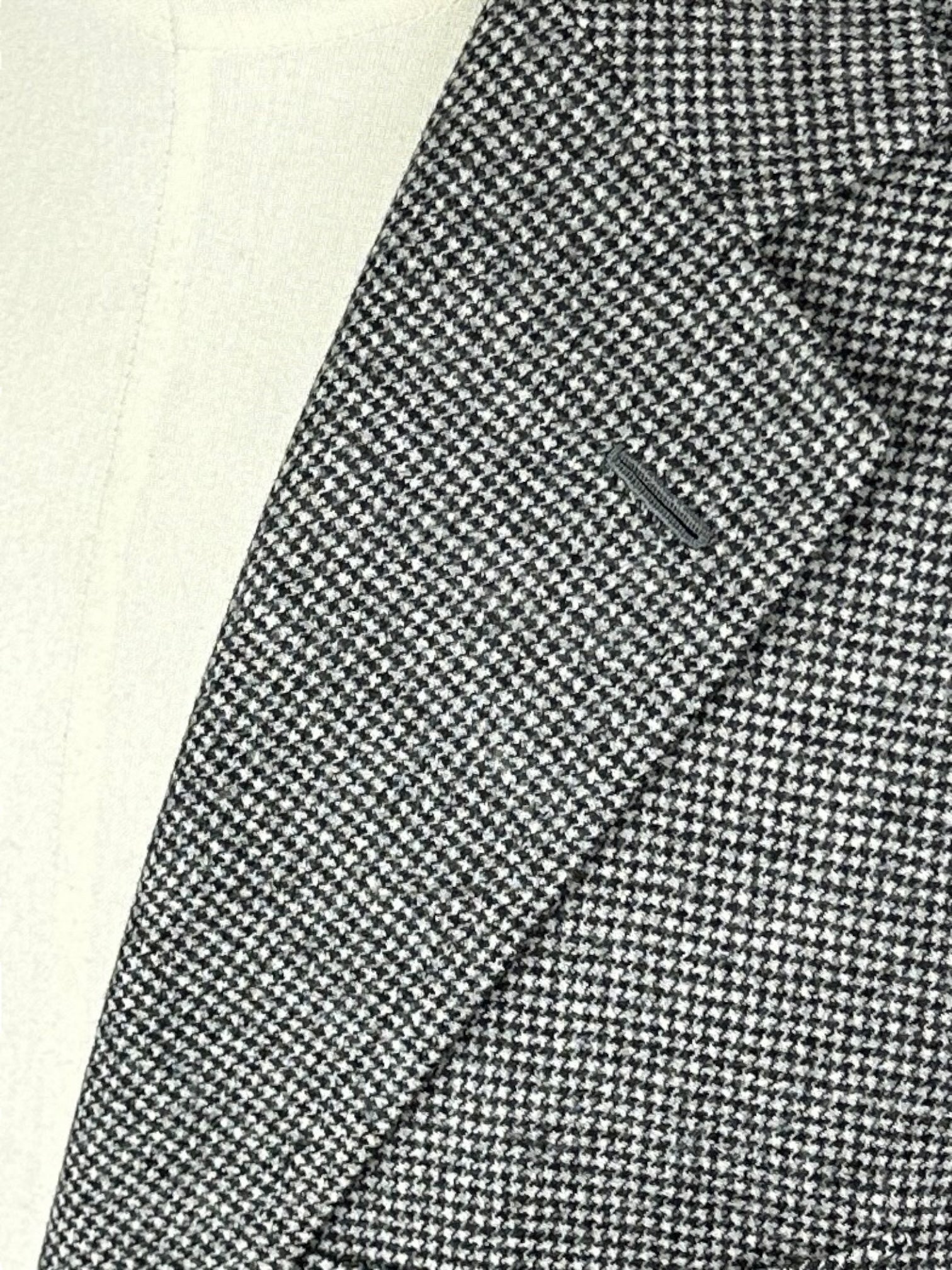 Een kleermakersschat: Wij presenteren het Cesare Attolini zwart-witte puppytooth-pak van wol en kasjmier: een mix van luxe en meesterlijk maatwerk. Dit pak is gemaakt van een hoogwaardige mix van wol en kasjmier en heeft een tijdloos puppytooth-patroon. Met Cesare Attolini's kenmerkende La Spalla Camicia-schouders en zorgvuldige doppio impuntura stiksels belichaamt het Italiaanse elegantie. De enkele ventilatieopening zorgt voor een slank silhouet, terwijl de onafgewerkte manchet gepersonaliseerde aanpassingen mogelijk maakt. Ideaal voor de veeleisende gentleman die op zoek is naar verfijnde stijl. Dit pak is een statement van verfijning. Ontdek hieronder de uitgebreide kleermakersdetails.