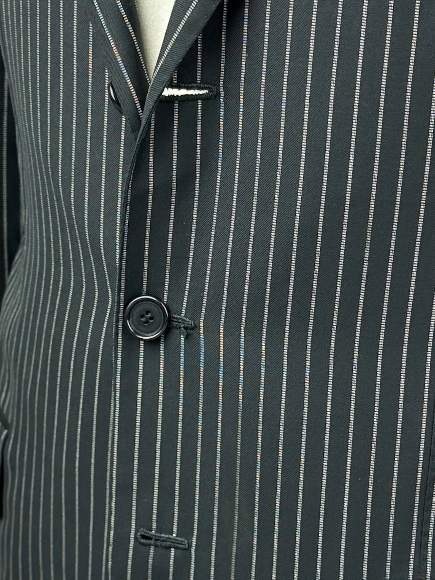 De 'tre bottoni stirato a due', ook bekend als de drie rollend op twee reversstijl, is misschien wel het meest beruchte kenmerk van het Neapolitaanse stijl jasje. De bovenste knoop en knoopsgat zijn decoratief, dus blijven ongeknoopt. Terwijl de revers omlaag rolt, vouwt het elegant over de bovenste knoop en stopt net 4 cm boven de tweede knoop, wat de kenmerkende rol van de revers creëert waar de stijl om bekend staat. Omdat het bedoeld is om ongeknoopt te blijven, wordt het bovenste knoopsgat eigenlijk binnenstebuiten gemaakt, zodat de mooie kant nog steeds zichtbaar is.
