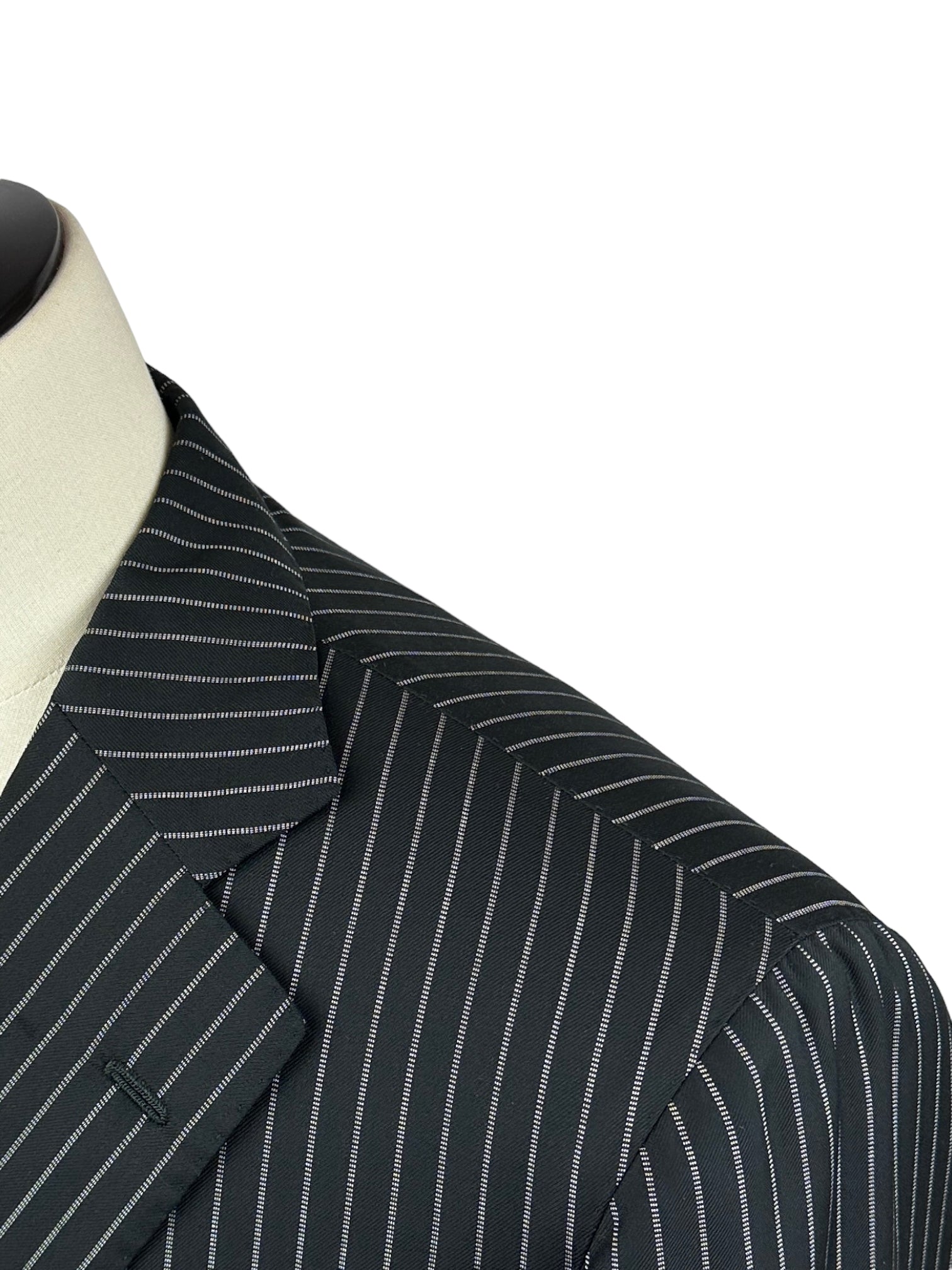 Handgemaakt Napolitaans pak gemaakt van luxe Super 150's scheerwol, met brede revers, paspelzakken en handgemaakte knoopsgaten - aan het uiteinde van de mouw. Ontdek hieronder de uitgebreide kleermakersdetails.
