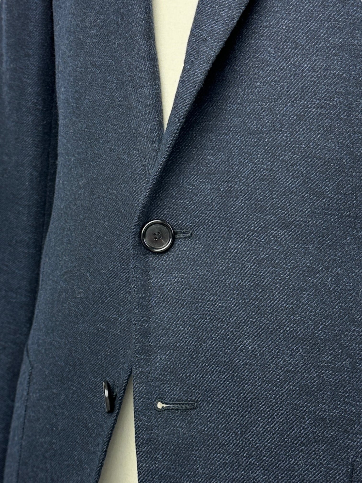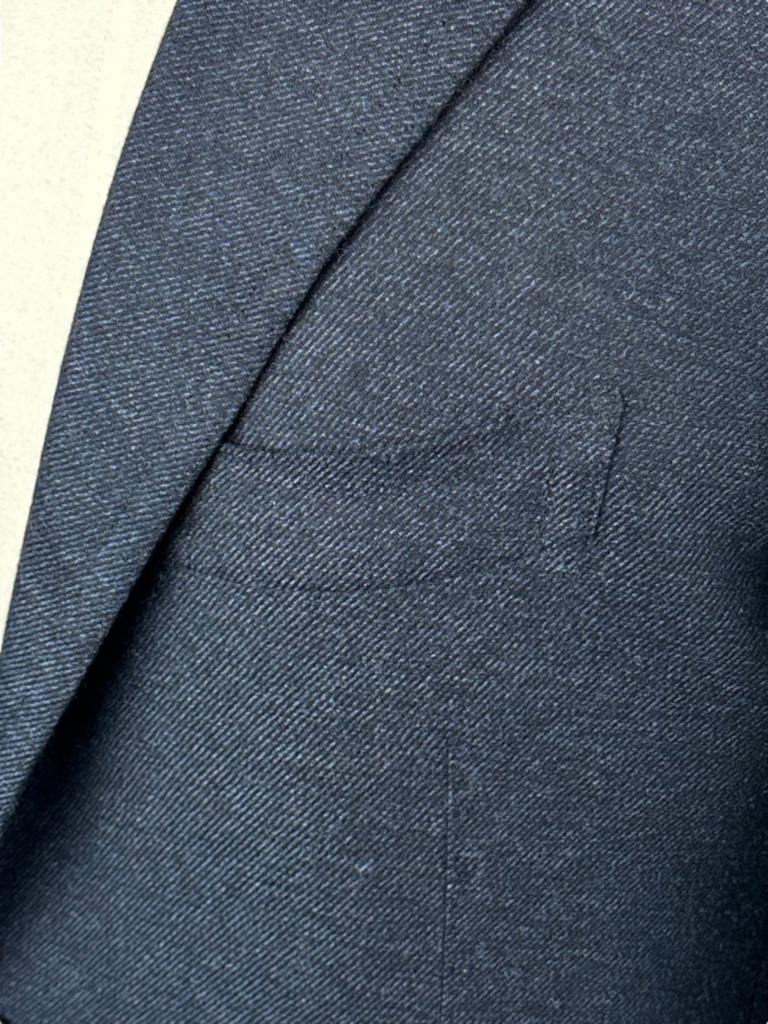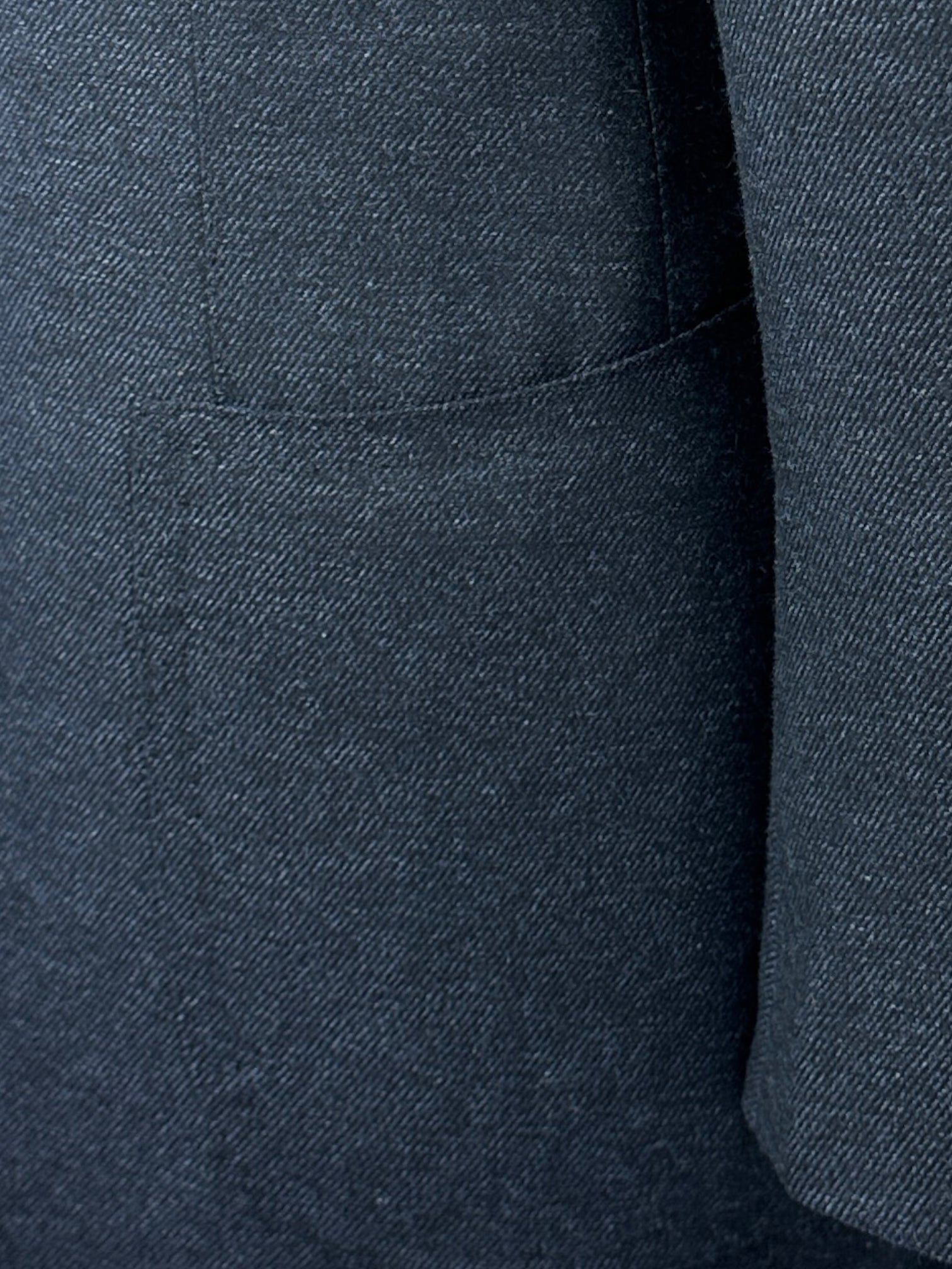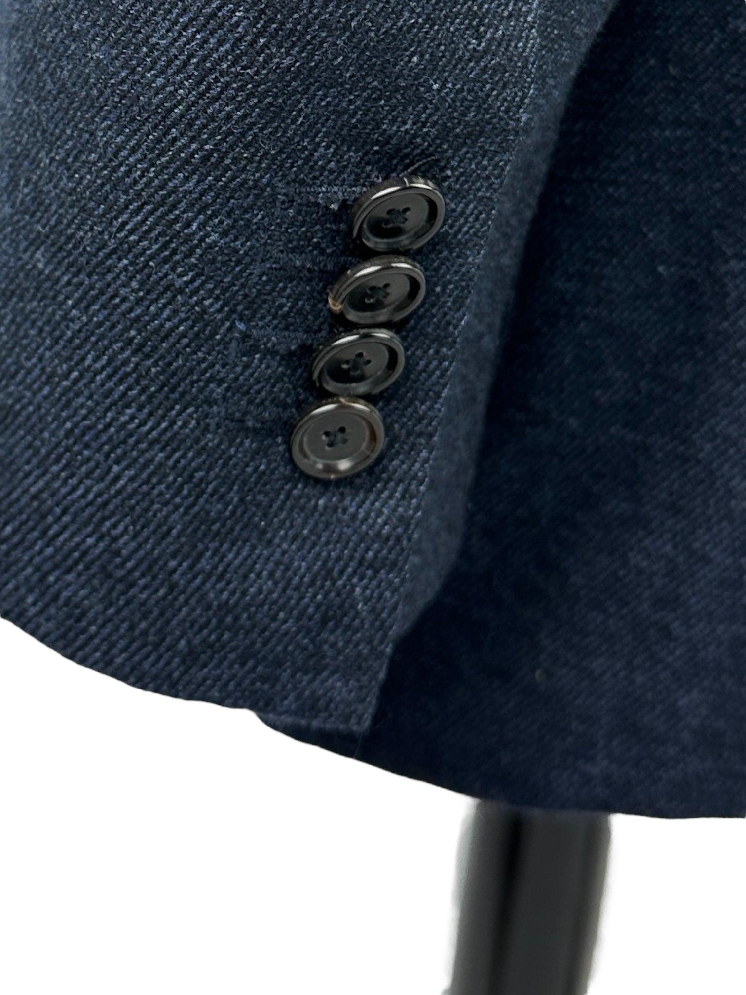 Handgemaakt Napolitaans jasje gemaakt van puur luxueus kasjmier, met ingekeepte revers, opgestikte zakken en hoornen knopen - aan het uiteinde van de mouw. Ontdek hieronder de uitgebreide kleermakersdetails.