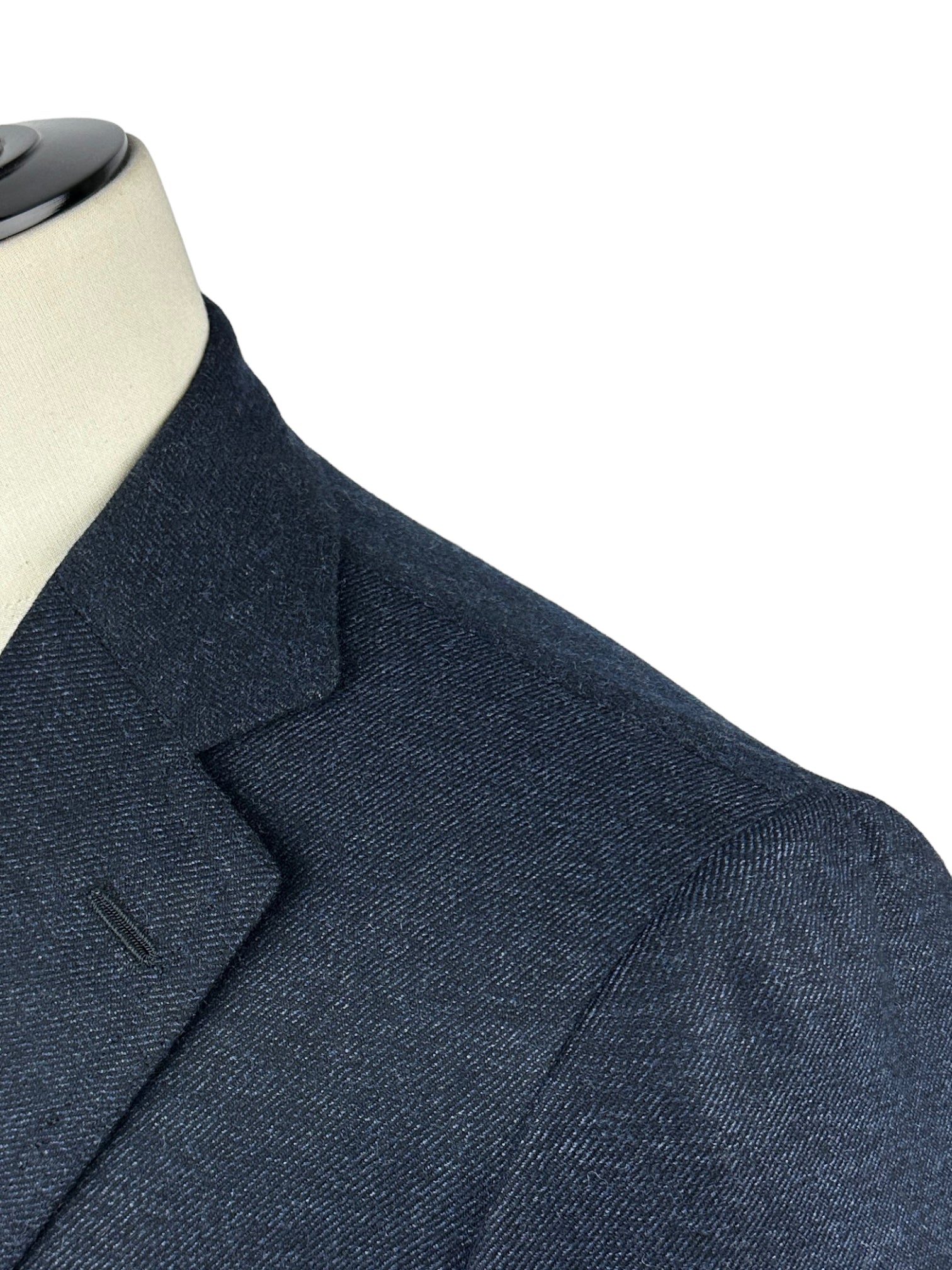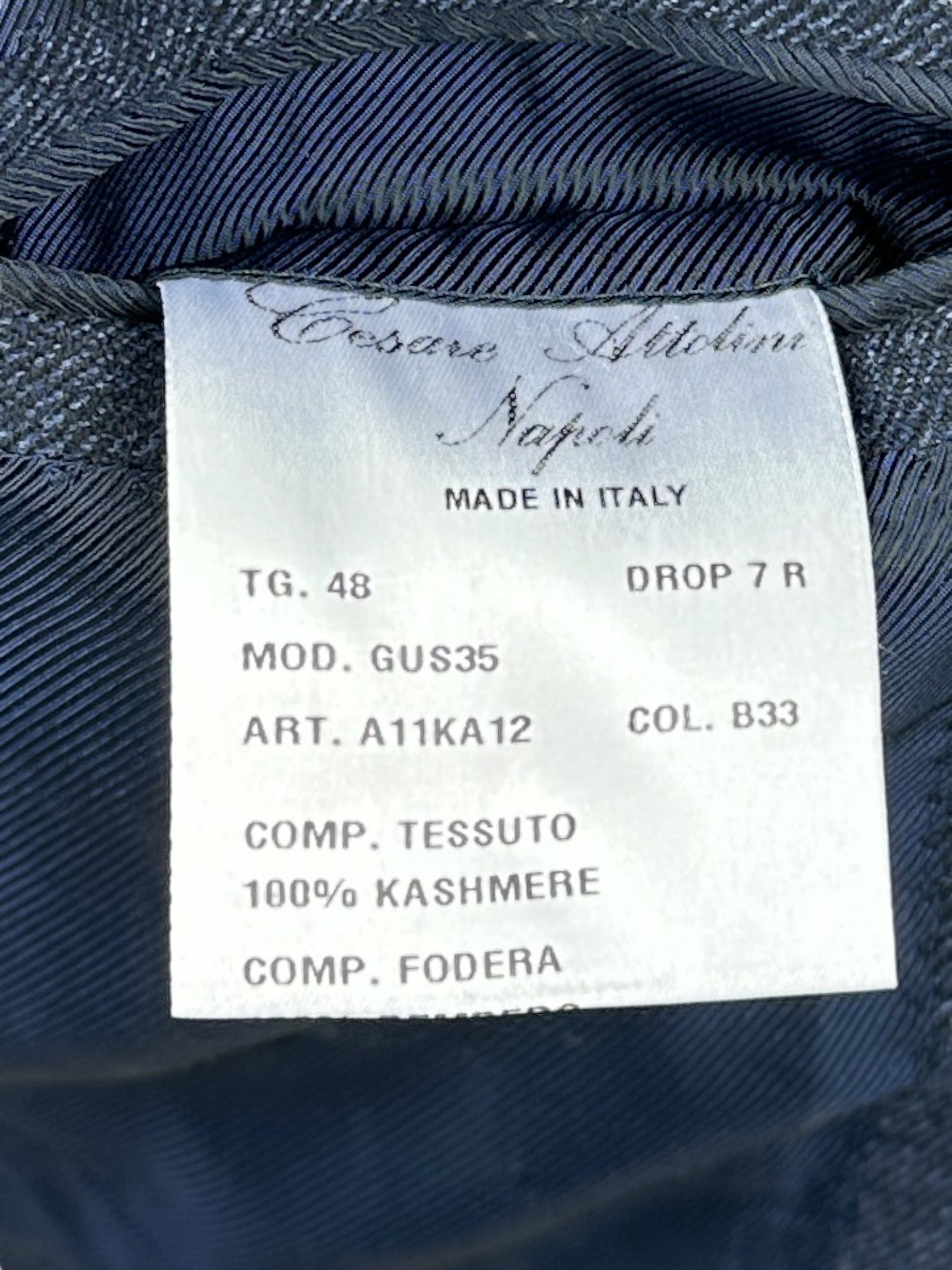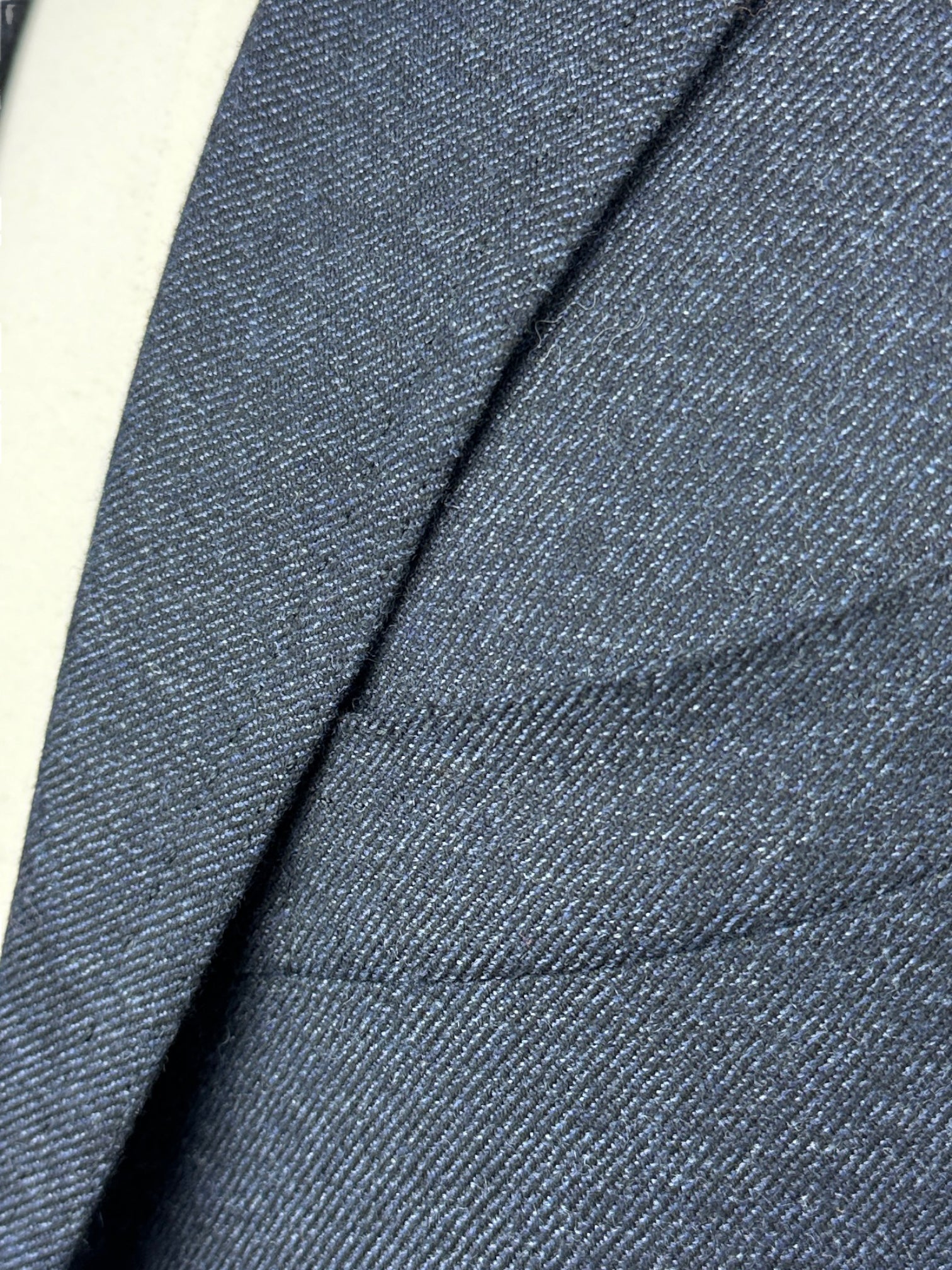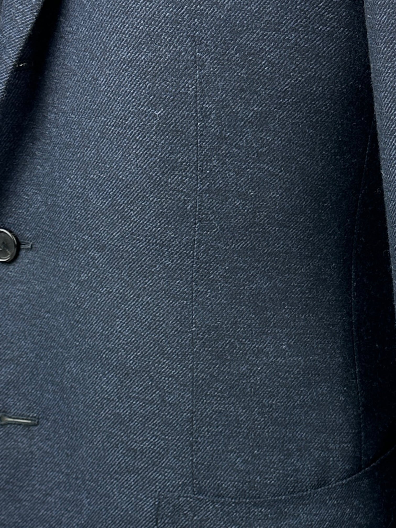 Handgemaakt Napolitaans jasje gemaakt van puur luxueus kasjmier, met ingekeepte revers, opgestikte zakken en hoornen knopen - aan het uiteinde van de mouw. Ontdek hieronder de uitgebreide kleermakersdetails.