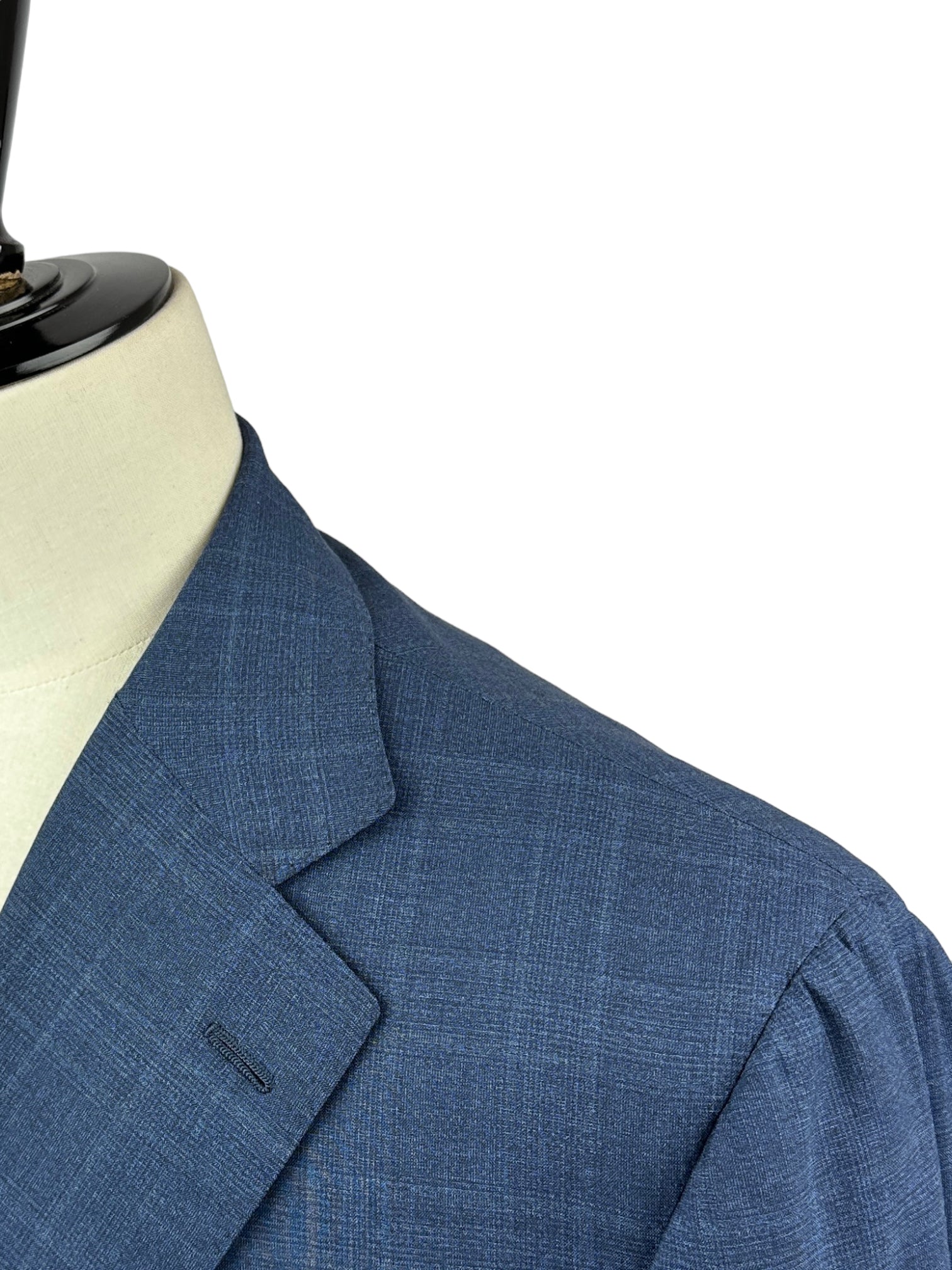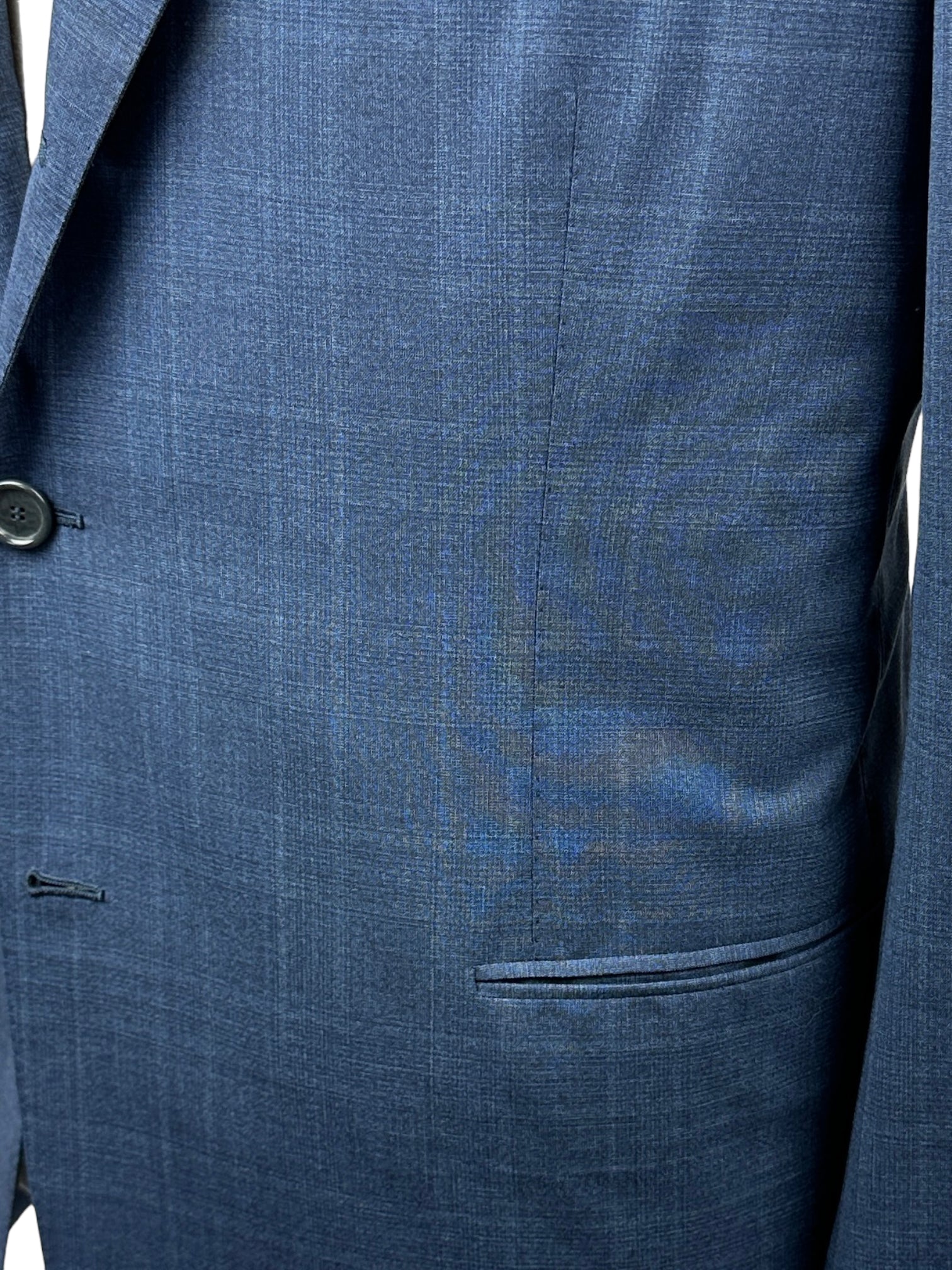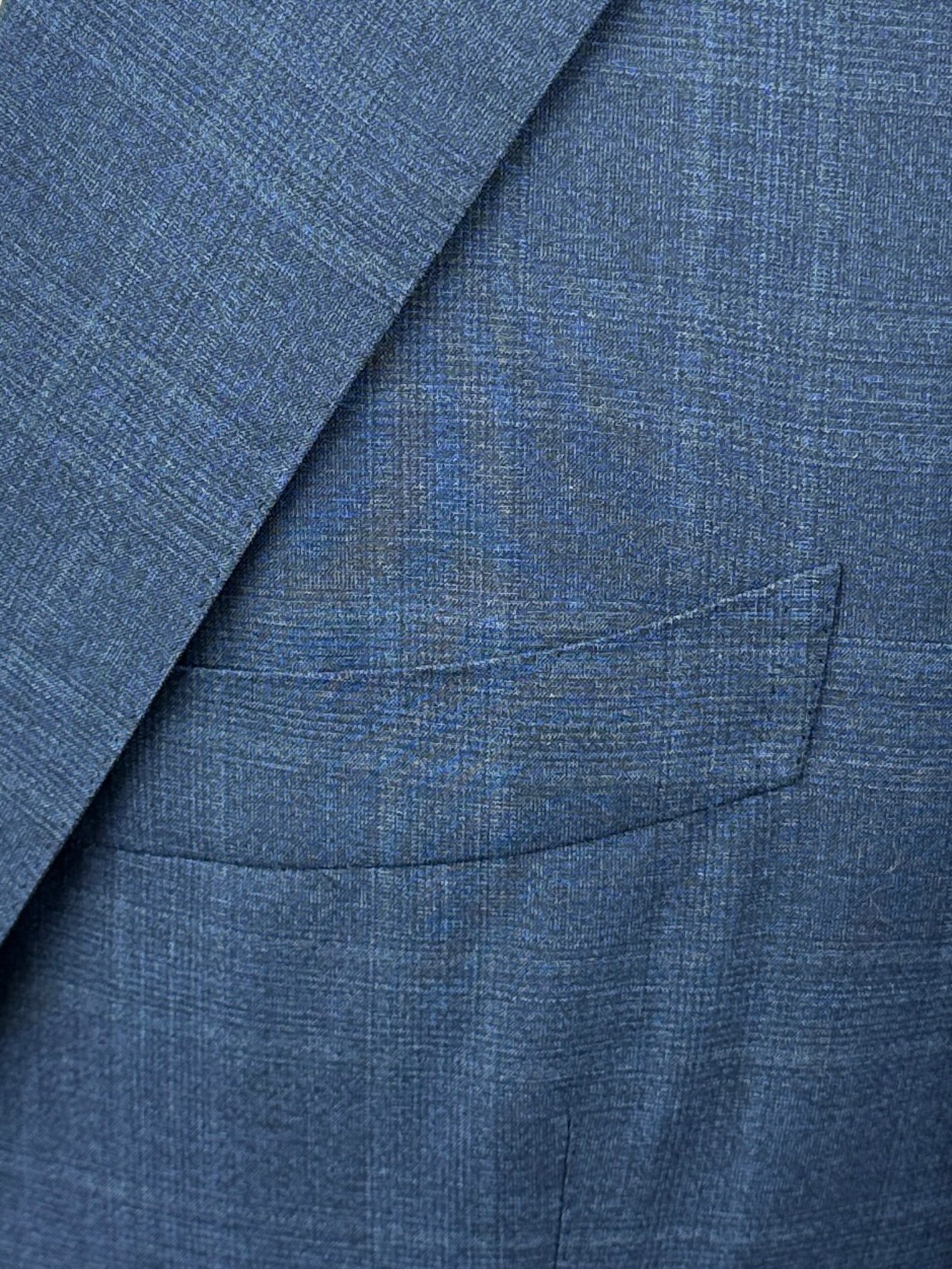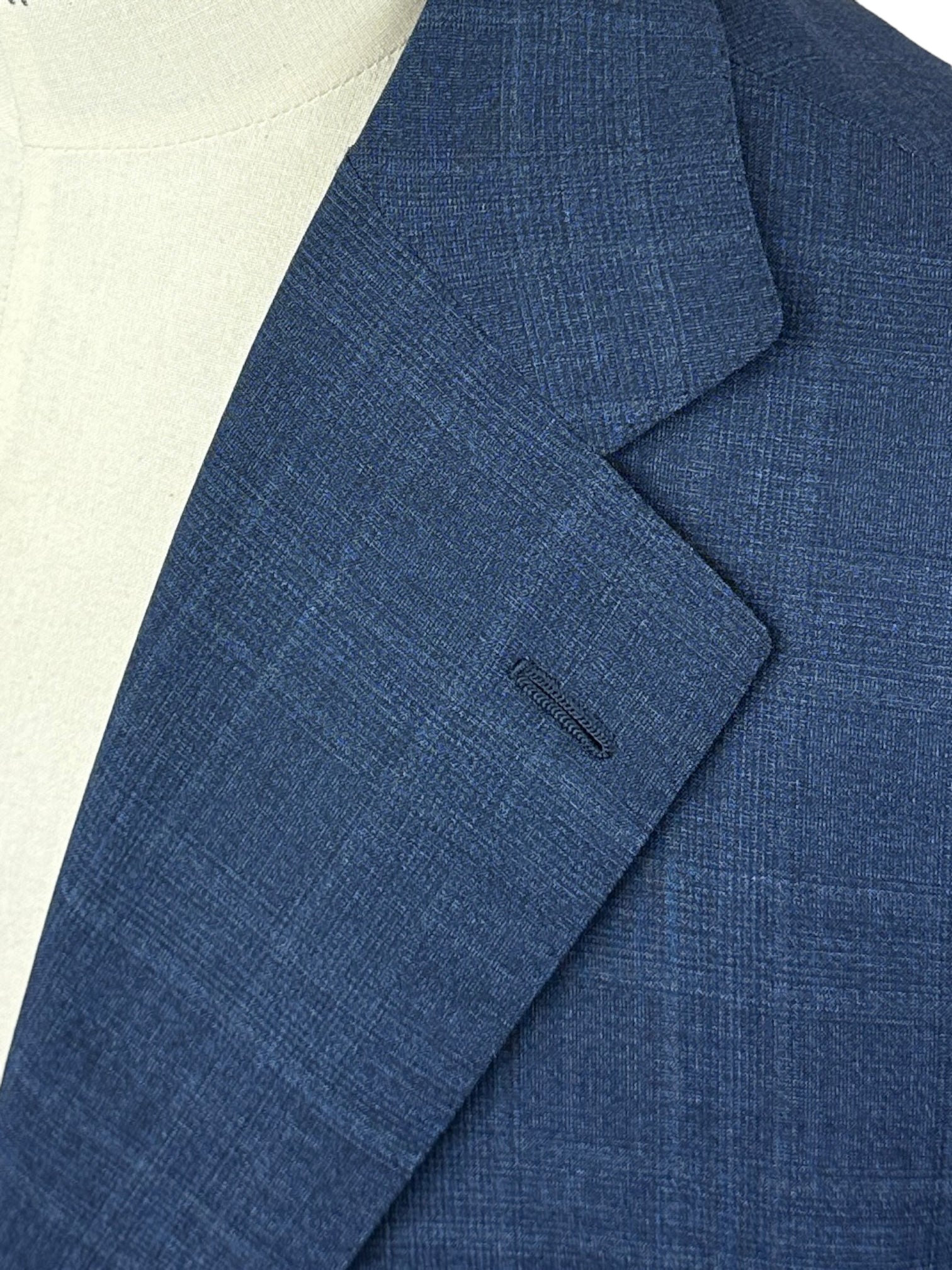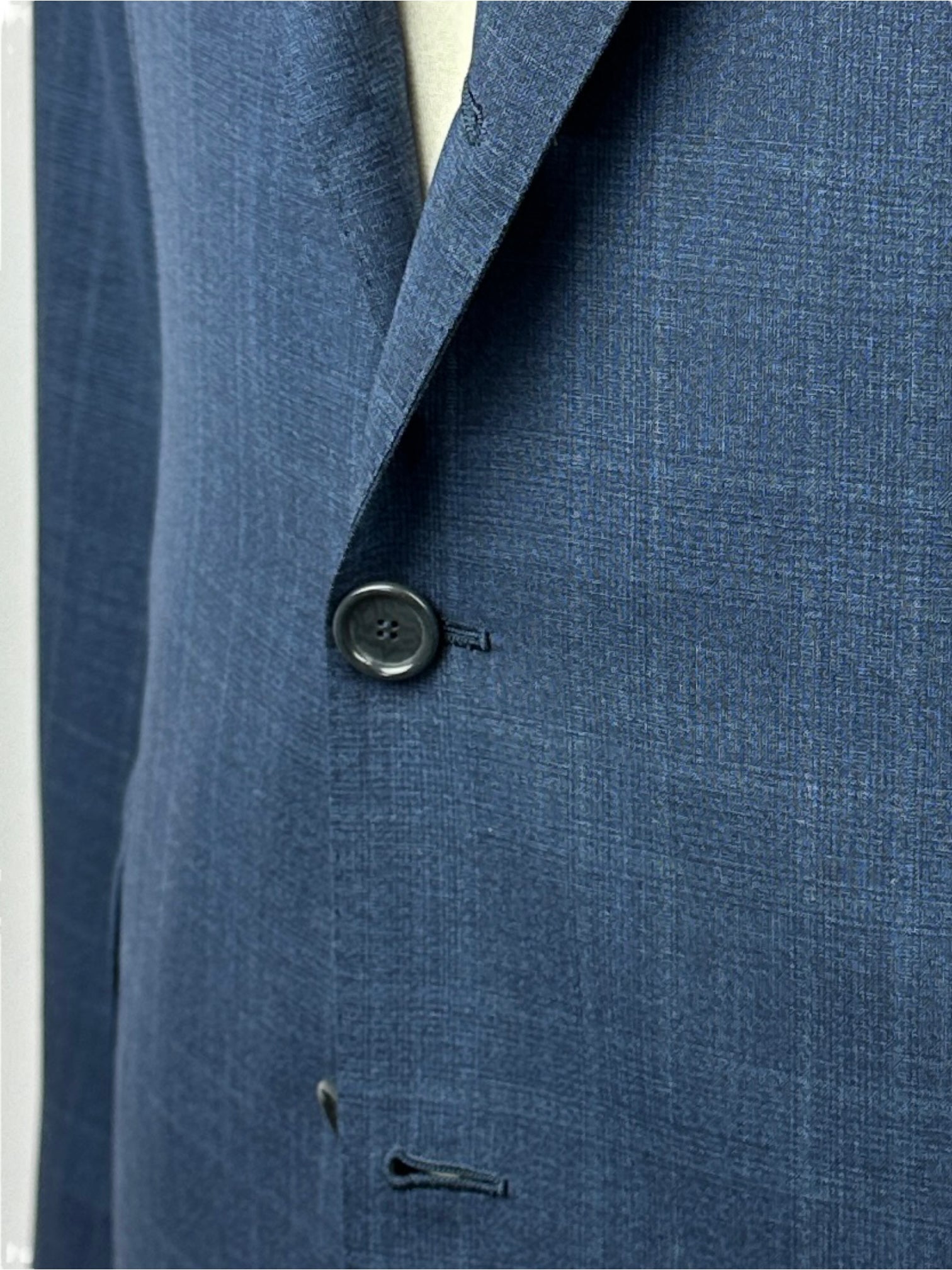Handgemaakt Napolitaans pak gemaakt van luxe Super 150's scheerwol, met brede revers, paspelzakken en handgemaakte knoopsgaten - aan het uiteinde van de mouw. Ontdek hieronder de uitgebreide kleermakersdetails.