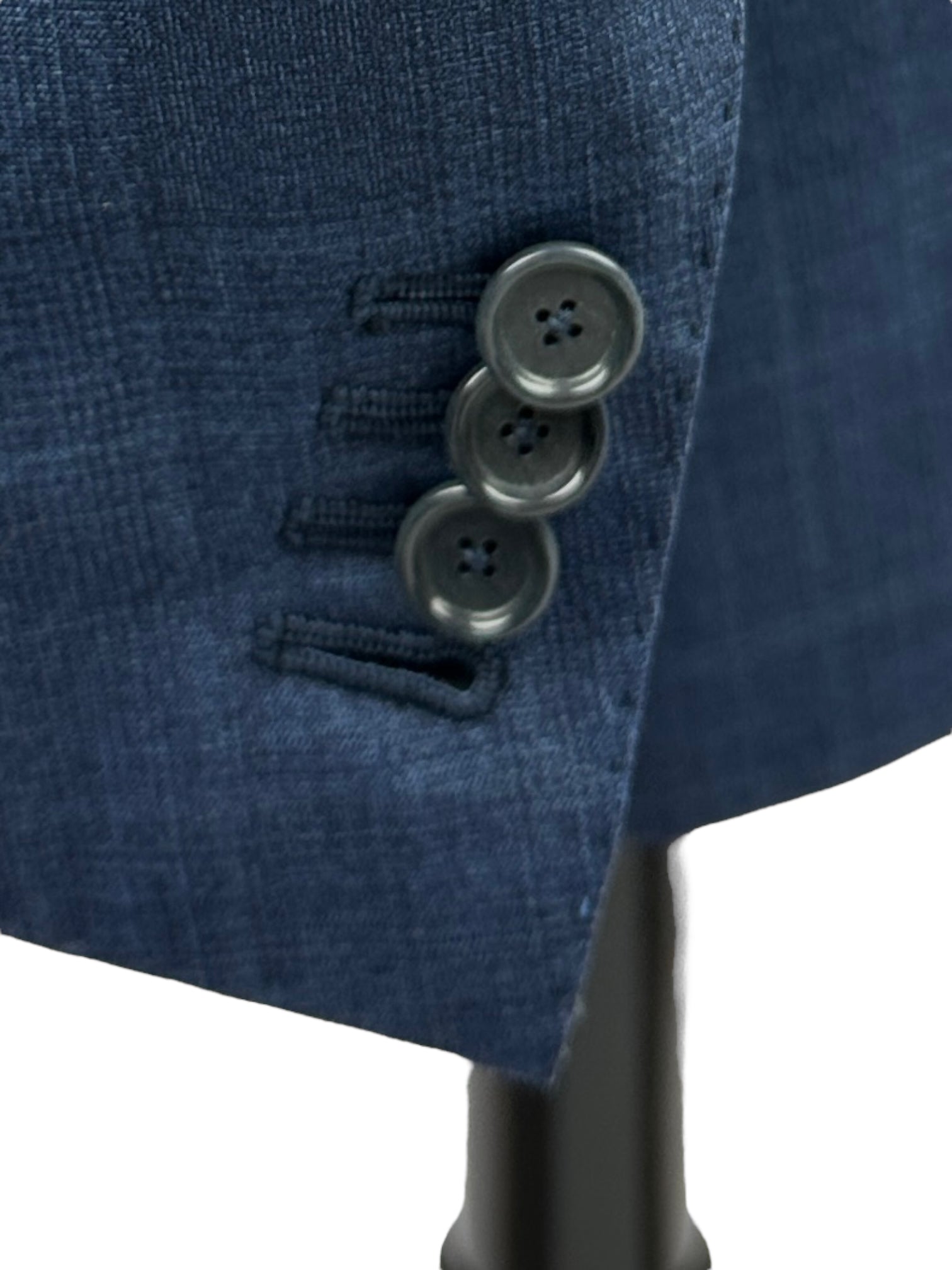 De 'tre bottoni stirato a due', ook bekend als de drie rollend op twee reversstijl, is misschien wel het meest beruchte kenmerk van het Neapolitaanse stijl jasje. De bovenste knoop en knoopsgat zijn decoratief, dus blijven ongeknoopt. Terwijl de revers omlaag rolt, vouwt het elegant over de bovenste knoop en stopt net 4 cm boven de tweede knoop, wat de kenmerkende rol van de revers creëert waar de stijl om bekend staat. Omdat het bedoeld is om ongeknoopt te blijven, wordt het bovenste knoopsgat eigenlijk binnenstebuiten gemaakt, zodat de mooie kant nog steeds zichtbaar is.