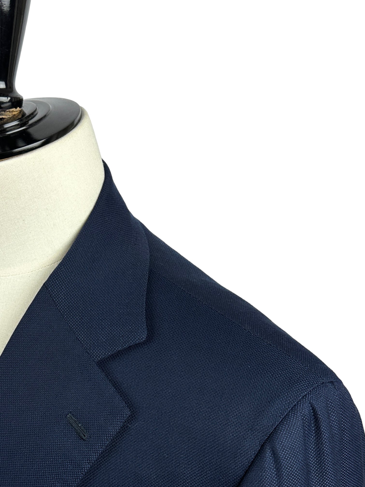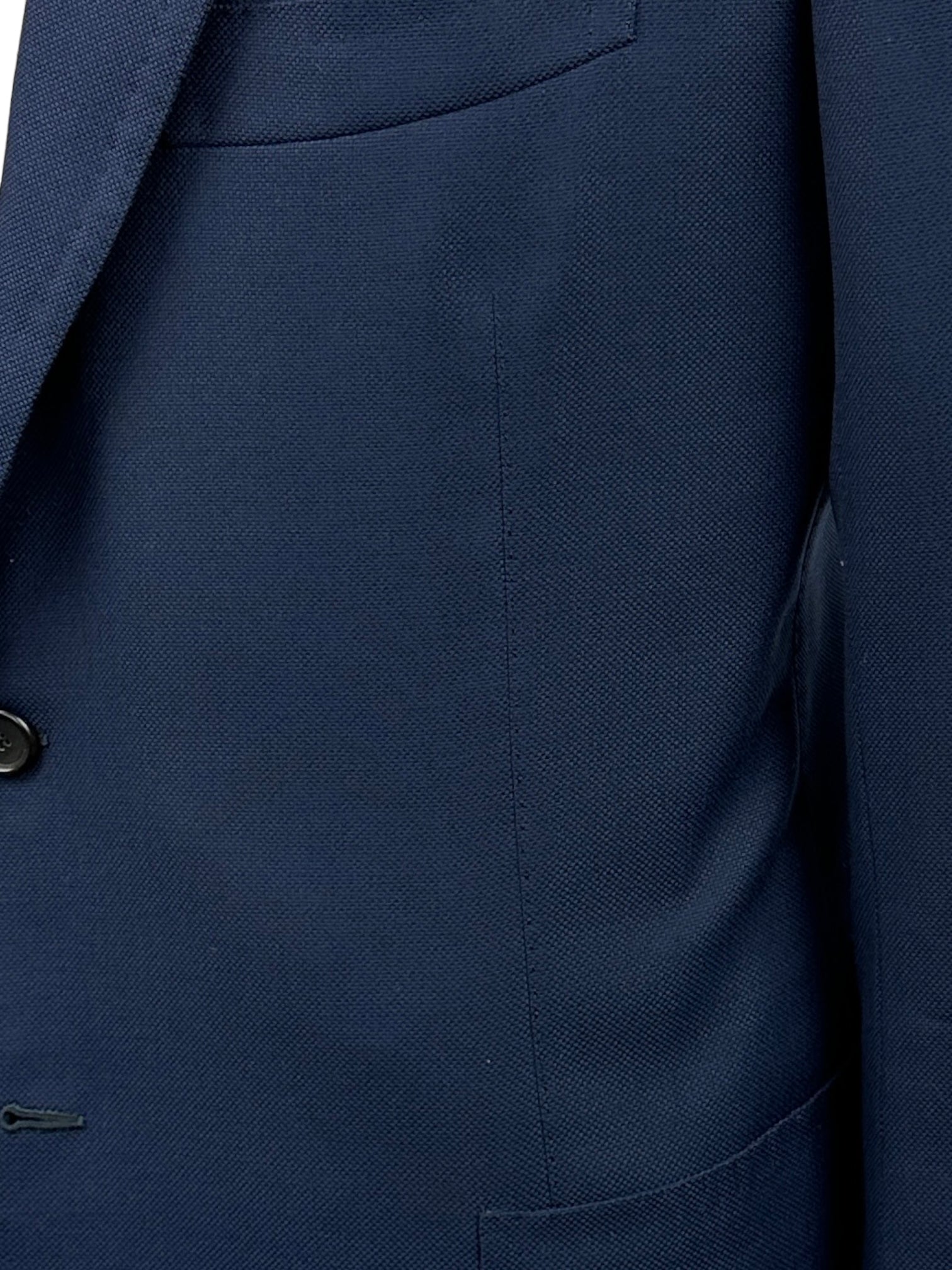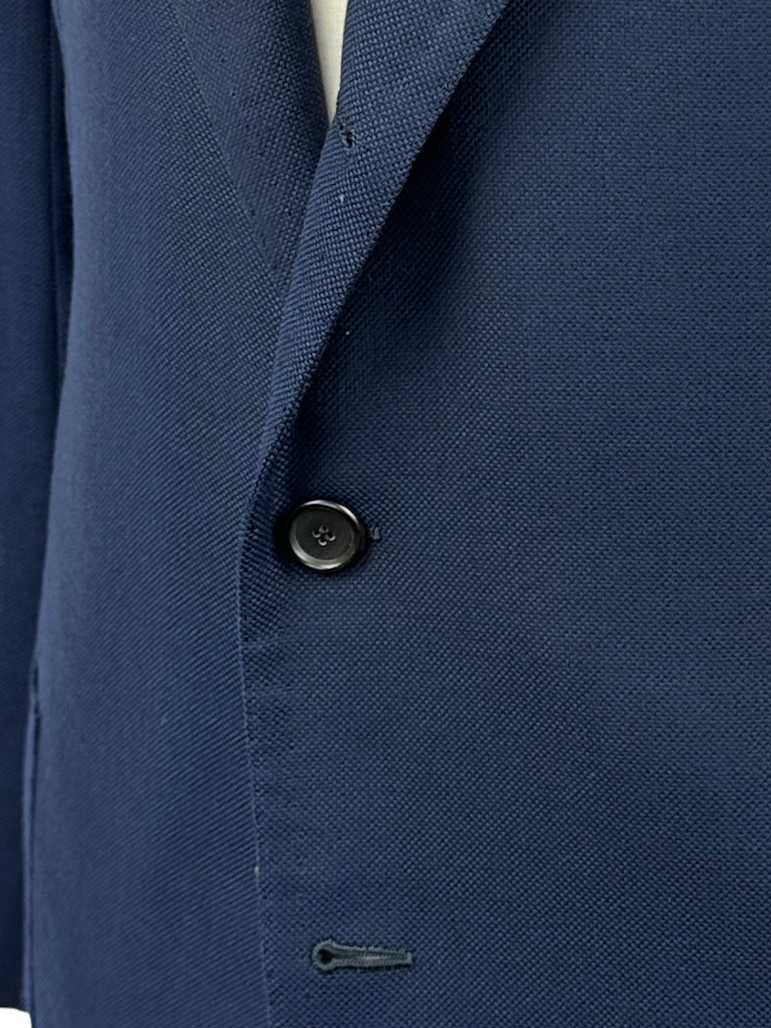 Handgemaakt Napolitaans jasje gemaakt van Super 120's wol, met ingekeepte revers, opgestikte zakken en handgemaakte knoopsgaten - aan het uiteinde van de mouw. Ontdek hieronder de uitgebreide kleermakersdetails.