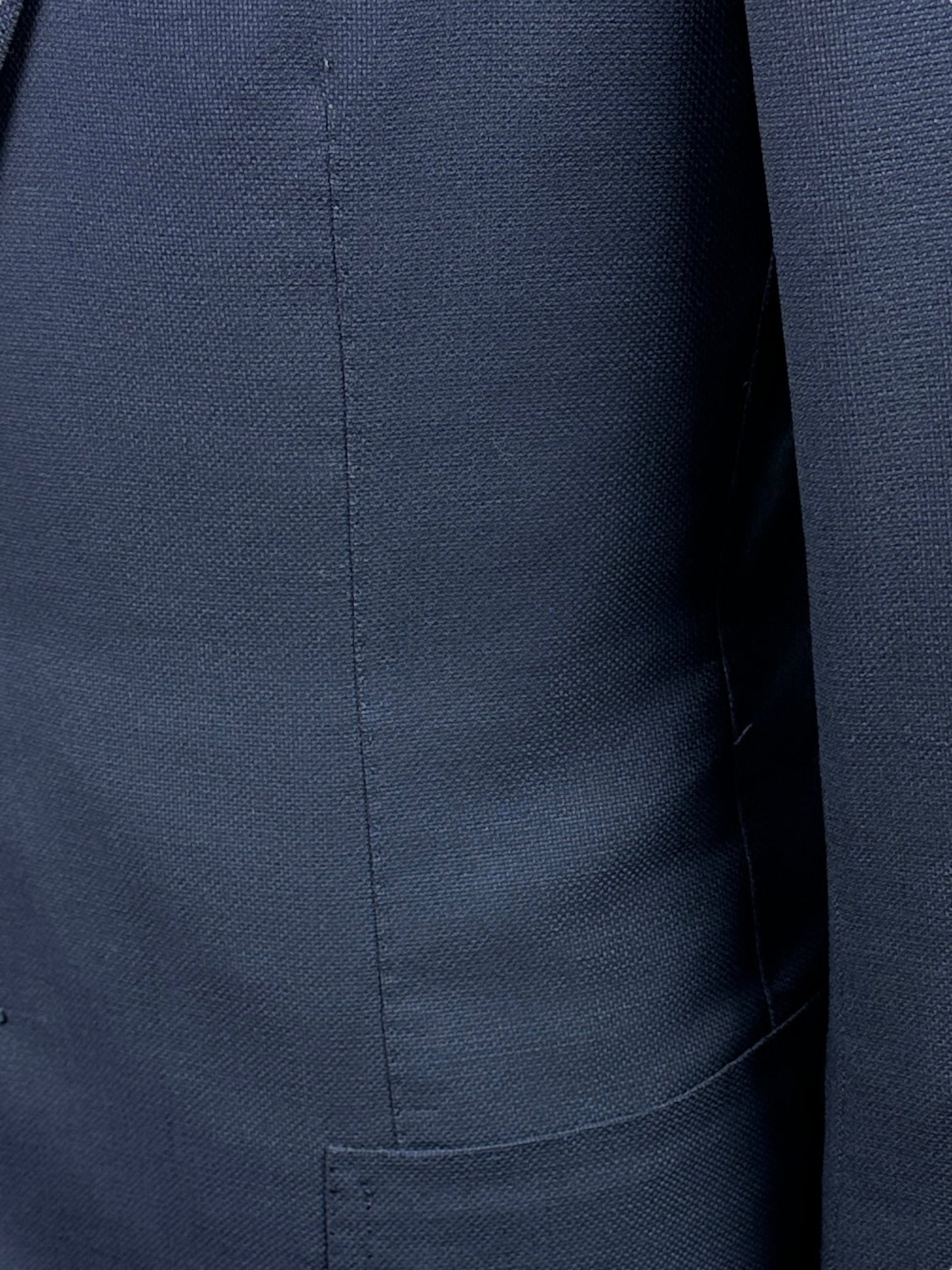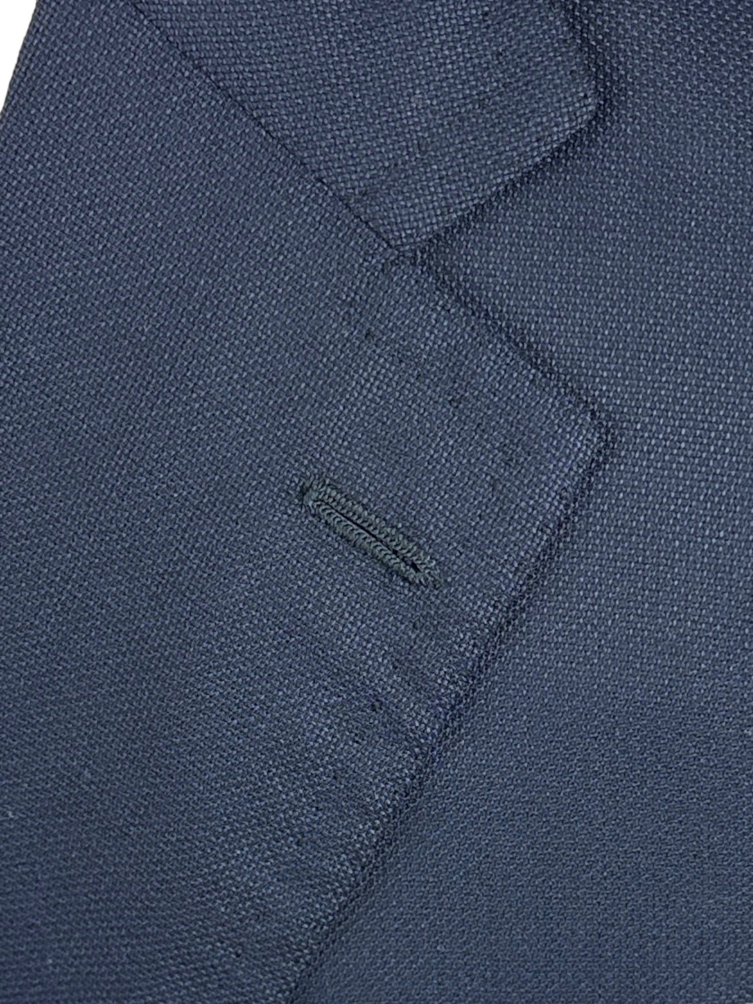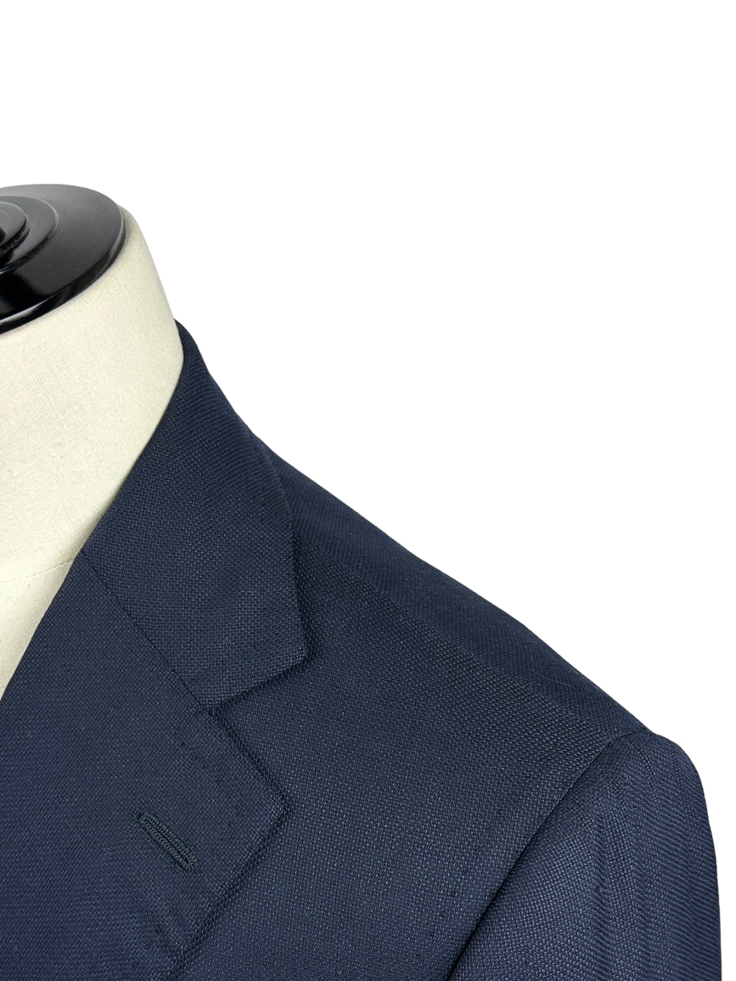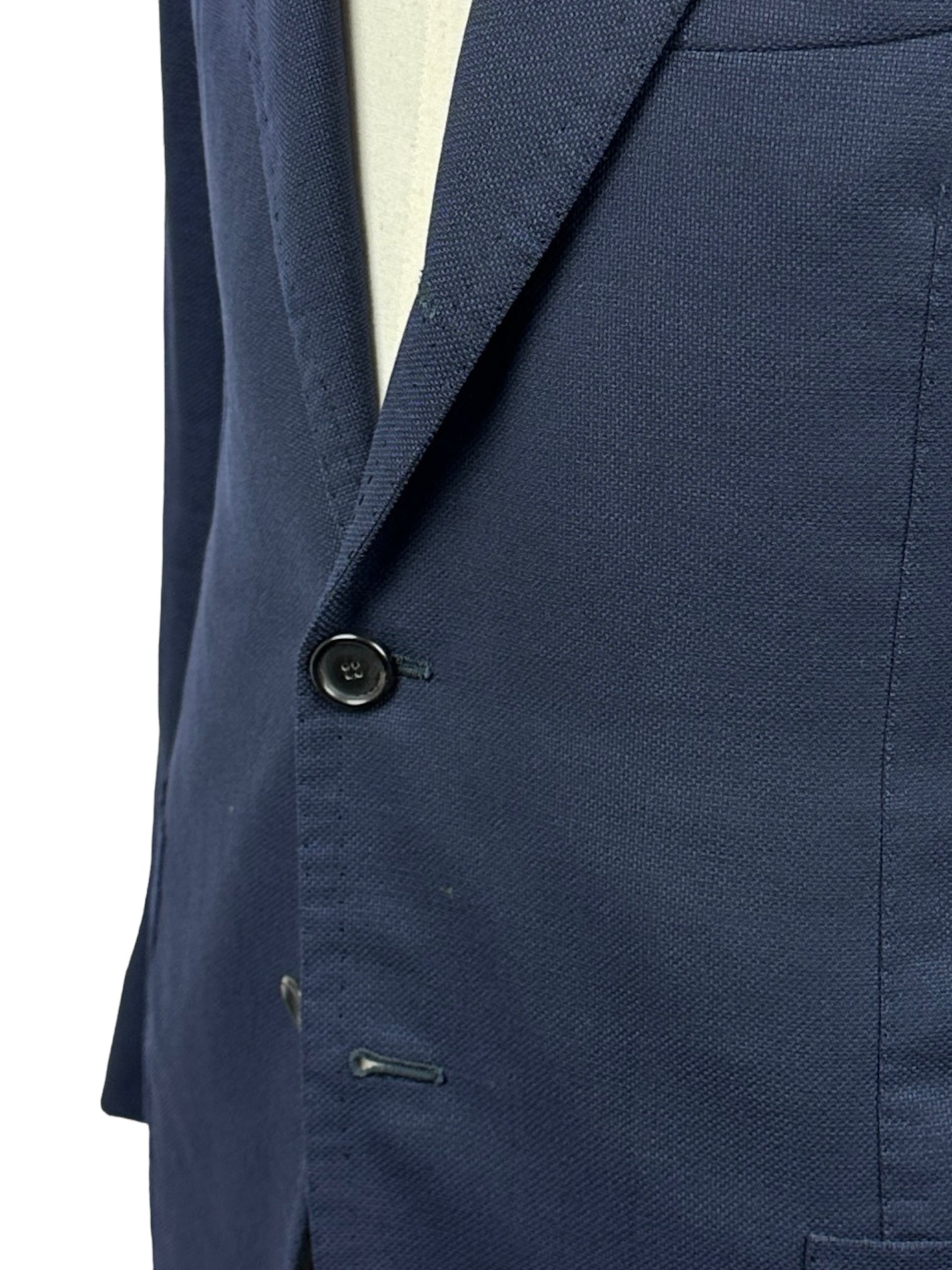 Handgemaakt Napolitaans jasje gemaakt van een luxe wol- en zijdemix, met revers met inkeping, opgestikte zakken, elleboogstukken en handgemaakte knoopsgaten - aan het uiteinde van de mouw. Ontdek hieronder de uitgebreide kleermakersdetails.