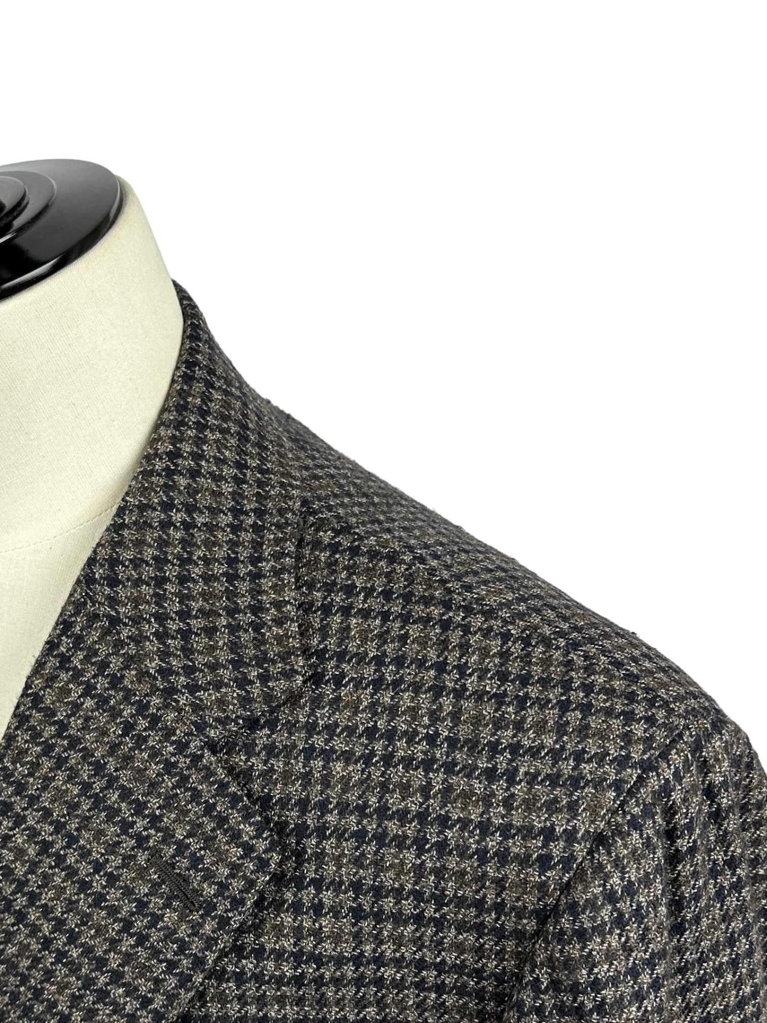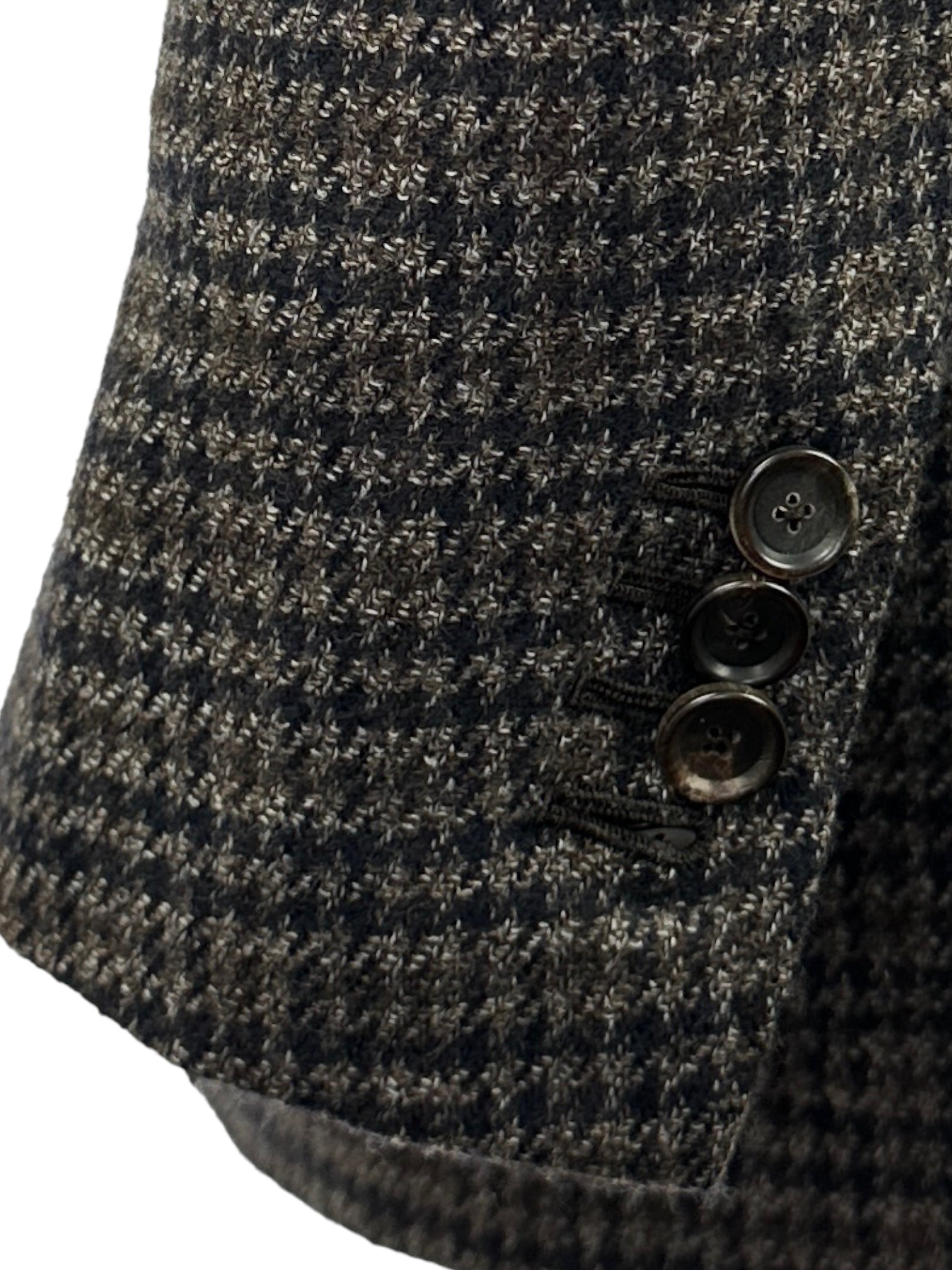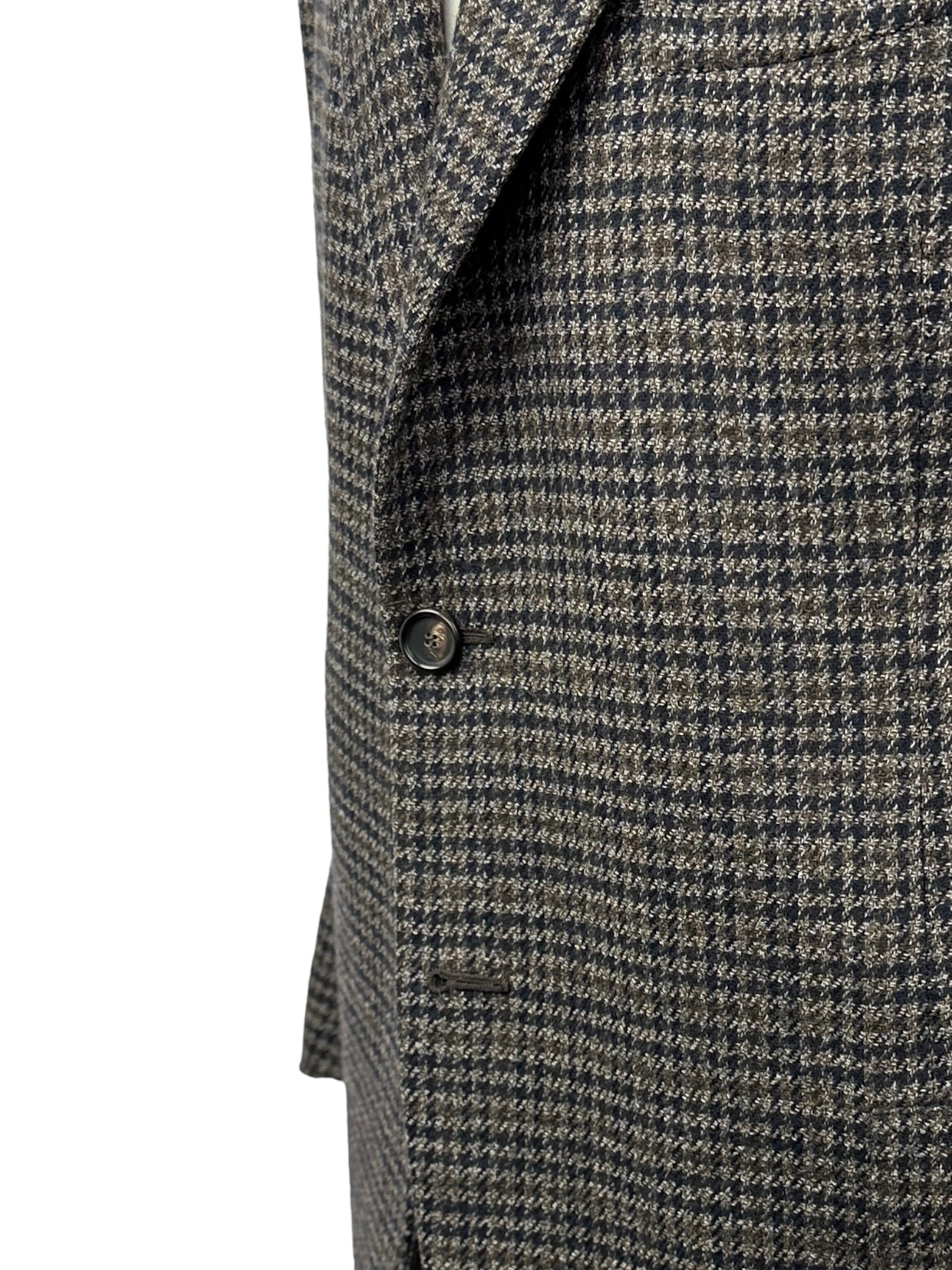 Handgemaakt Napolitaans jasje gemaakt van luxe wol, met ingekeepte revers, opgestikte zakken en handgemaakte knoopsgaten - aan het uiteinde van de mouw. Ontdek hieronder de uitgebreide kleermakersdetails.