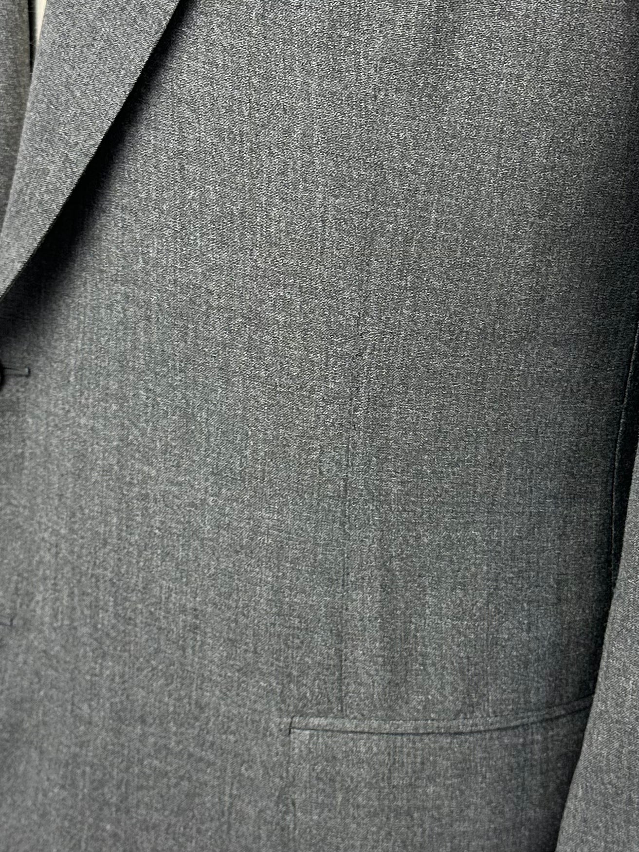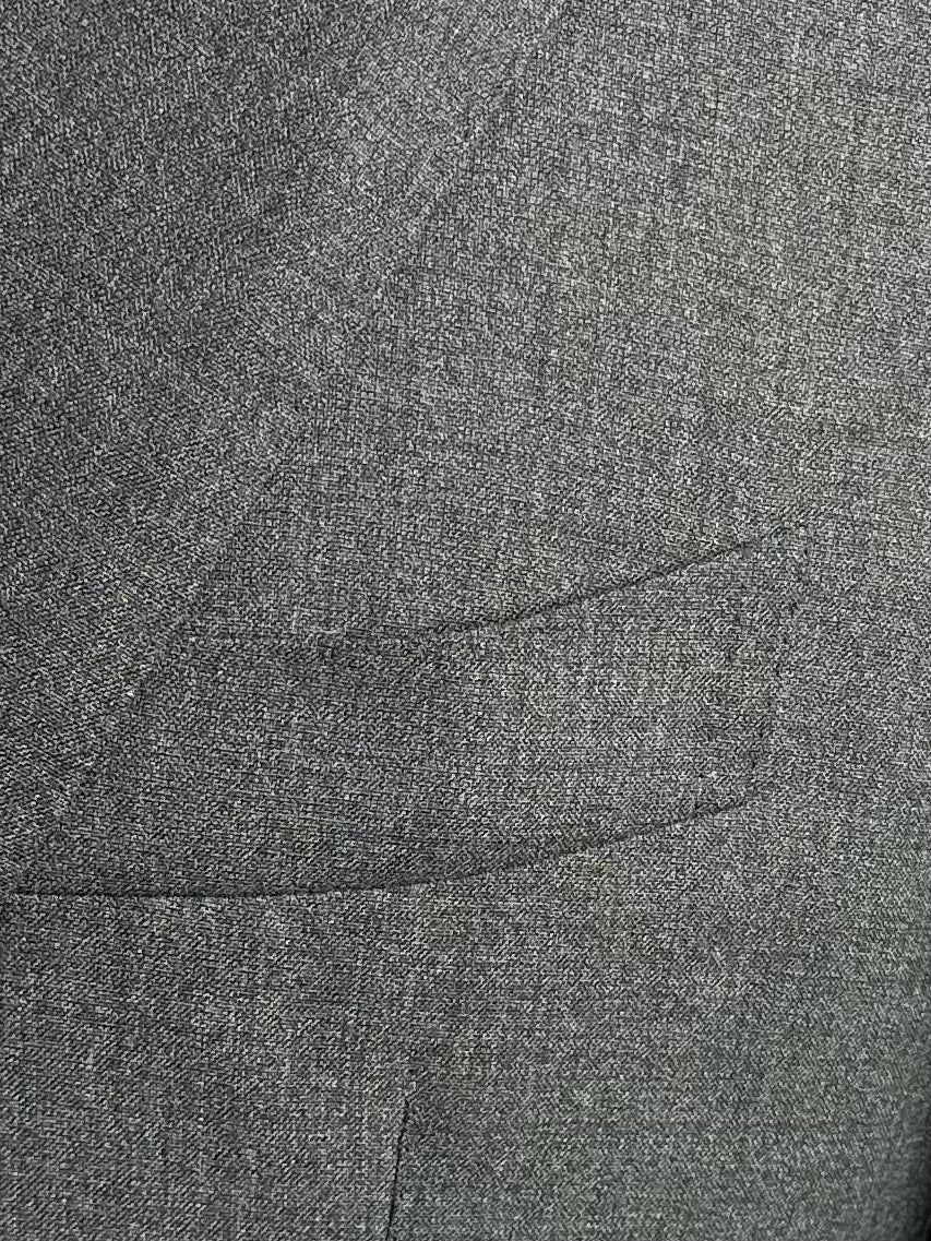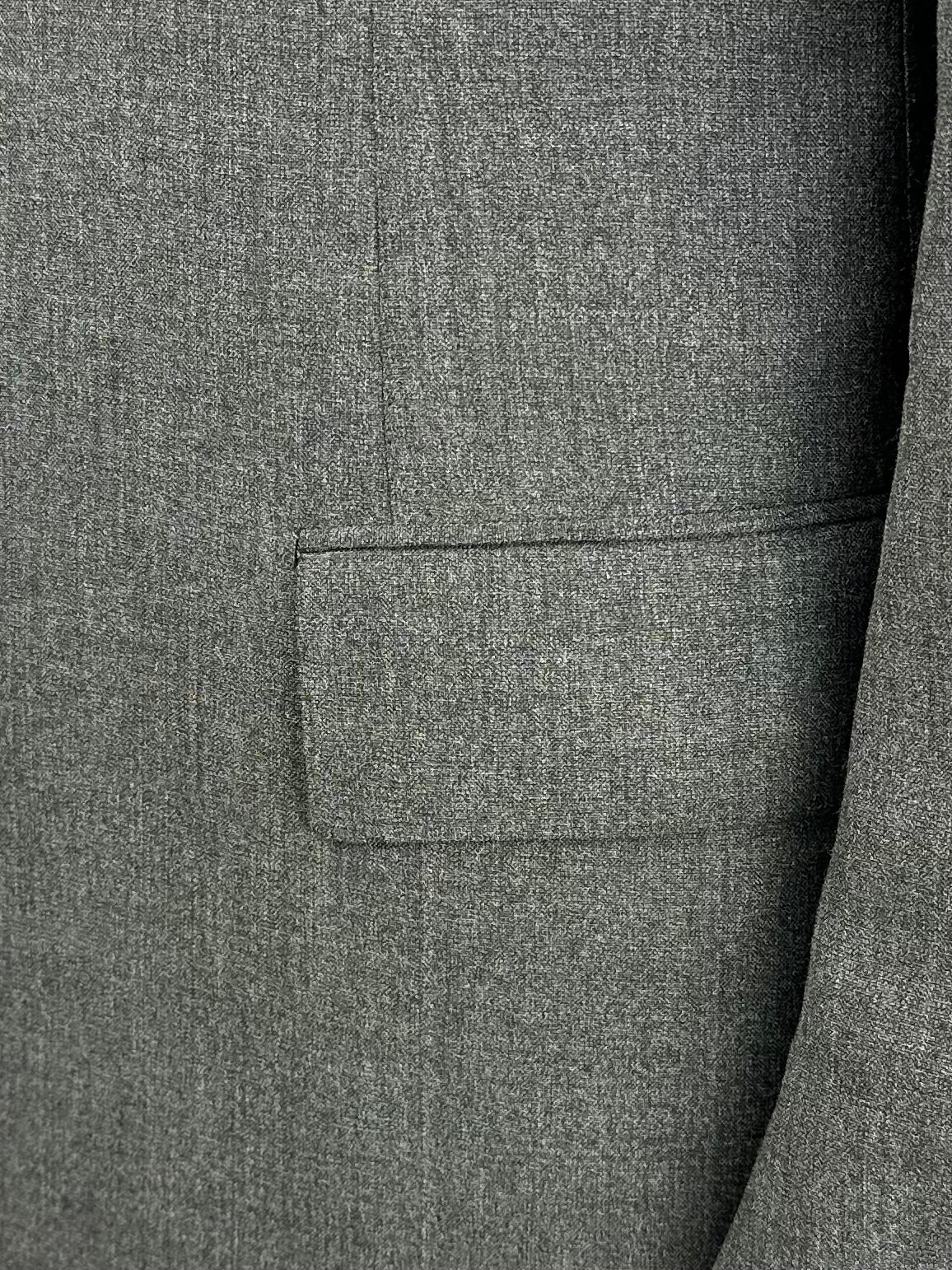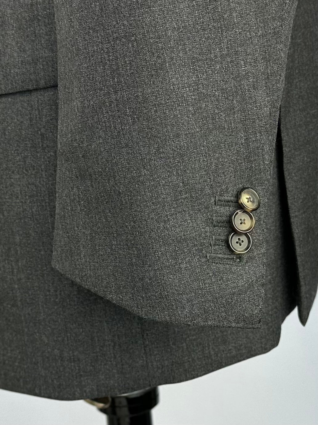 Handgemaakt Napolitaans pak gemaakt van een luxe wol- en kasjmiermix, met ingekeepte revers, klepzakken en handgemaakte knoopsgaten - aan het uiteinde van de mouw. Het jasje bevat een La Spalla Camicia , een typisch detail van het Napolitaanse maatwerk. Ontdek hieronder de uitgebreide kleermakersdetails.