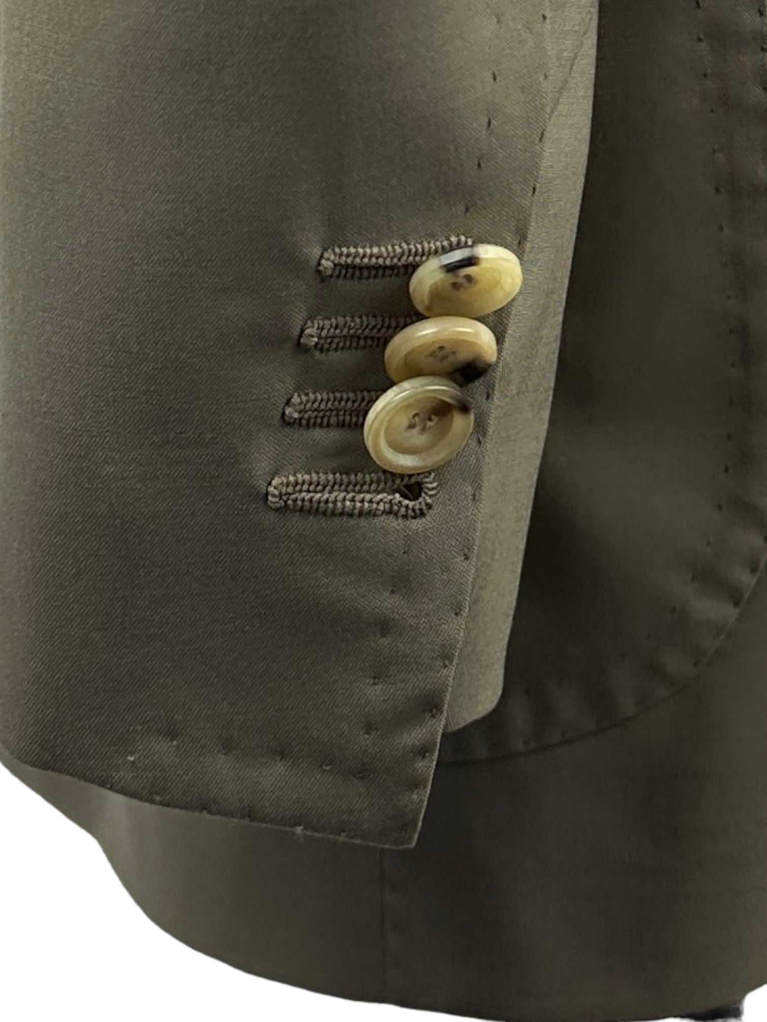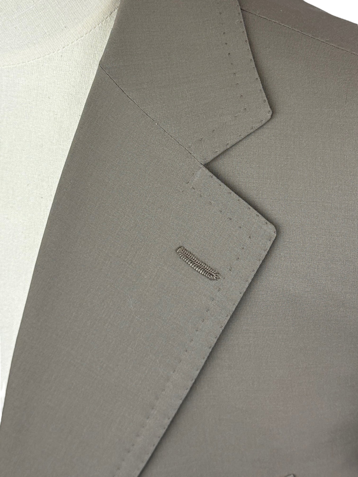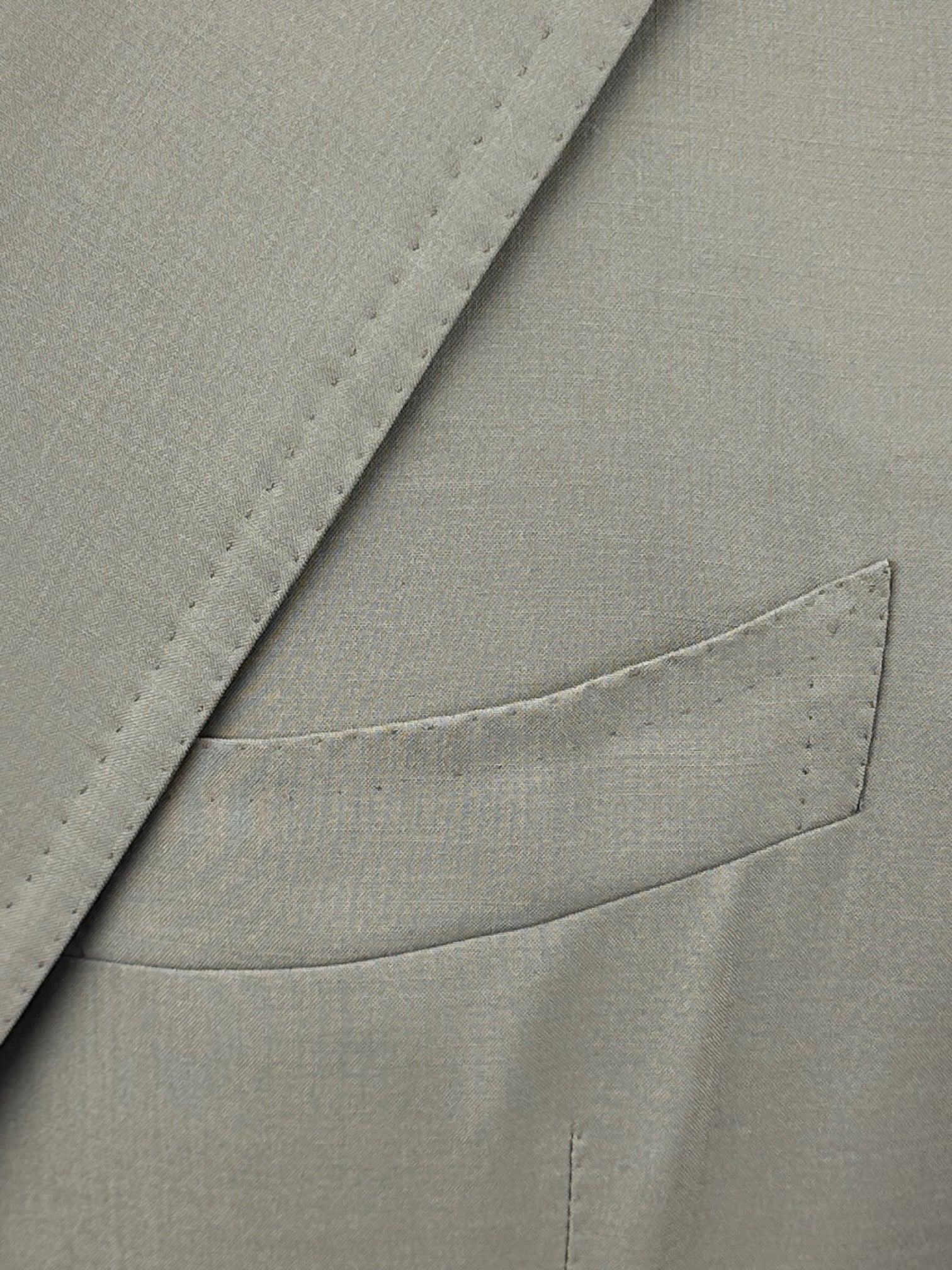 Handgemaakt, lichtgewicht Napolitaans pak gemaakt van Super 150's wol, met Doppio Impuntura stiksels, brede revers, opgestikte 'Tasca a Pignata' zakken en handgemaakte knoopsgaten - aan het uiteinde van de mouw. Ontdek hieronder de uitgebreide kleermakersdetails.