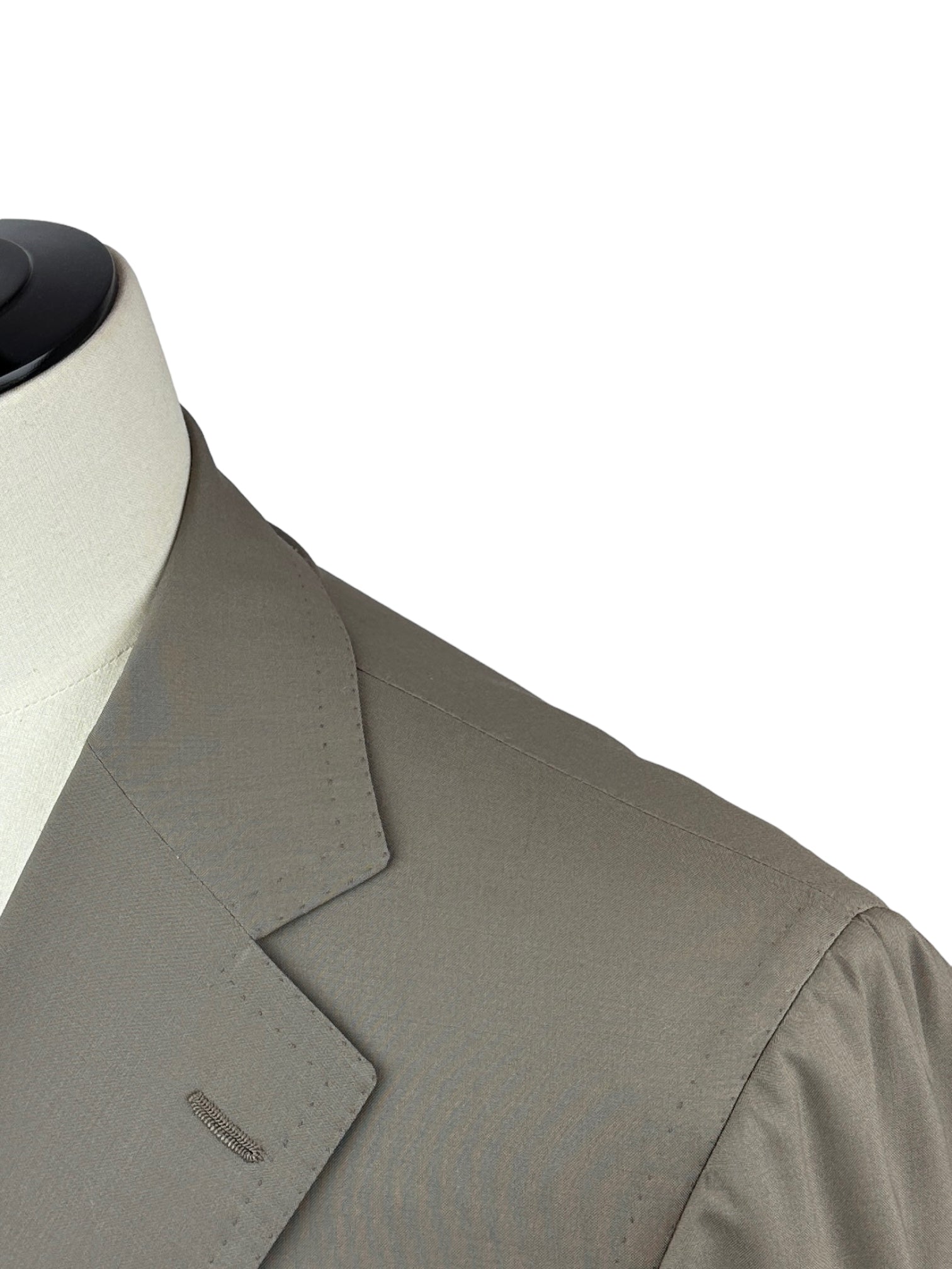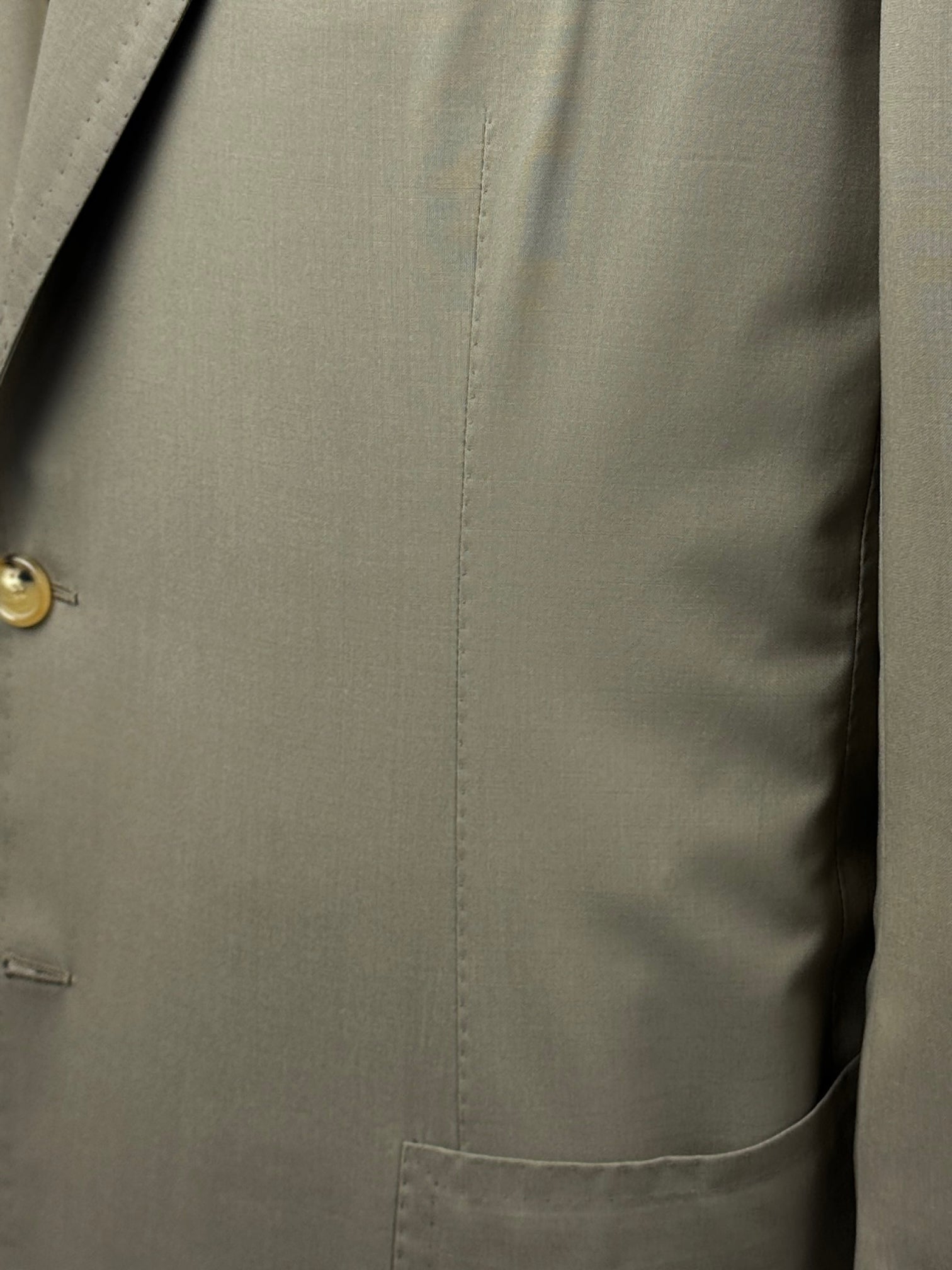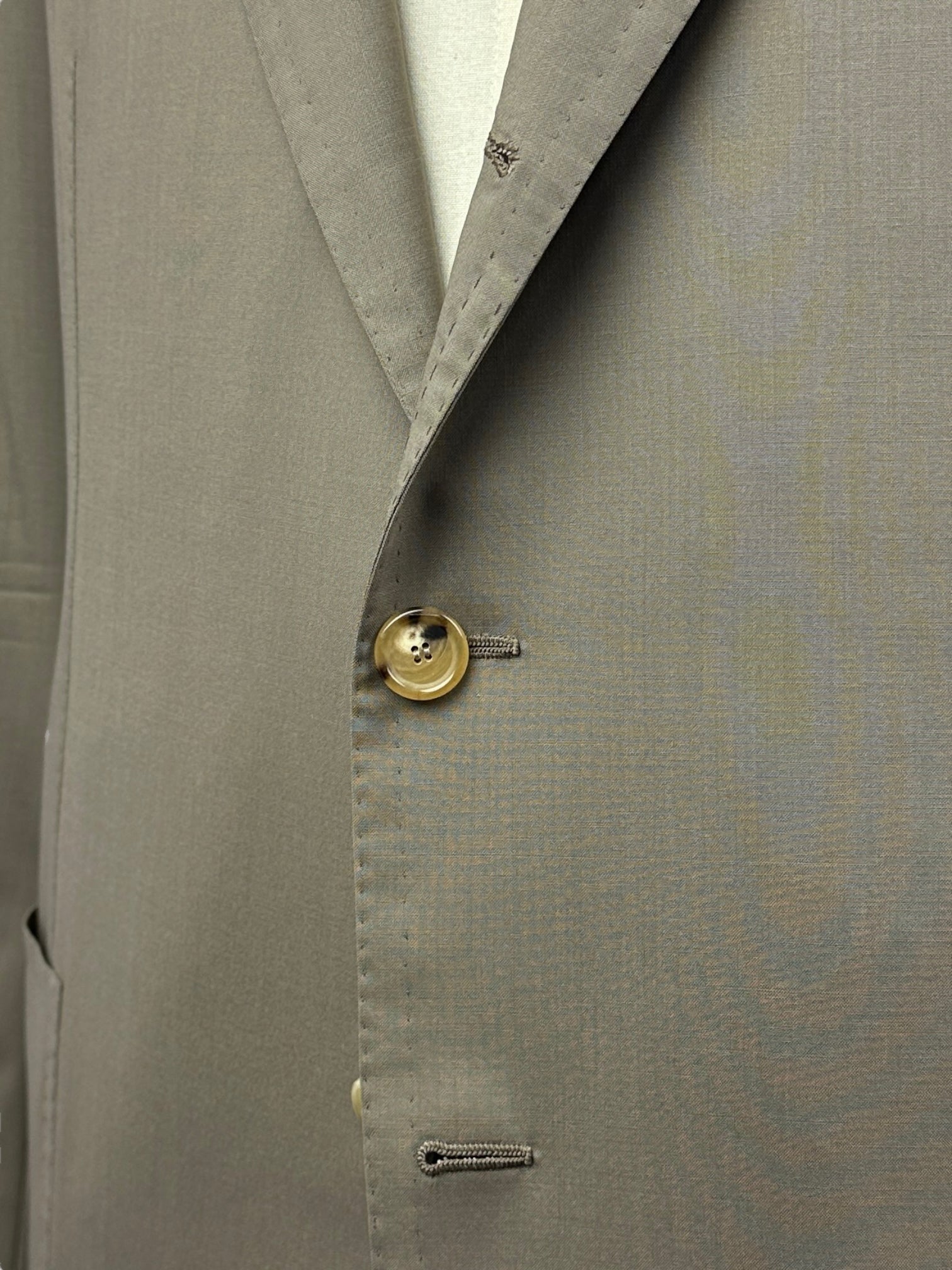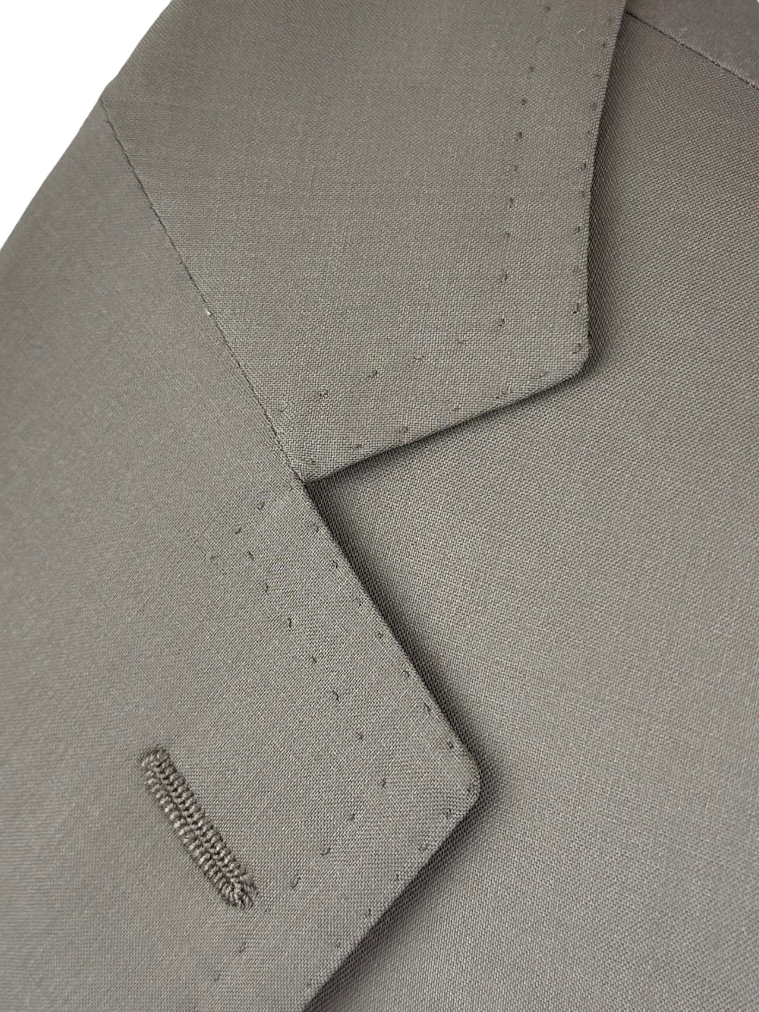 Handgemaakt, lichtgewicht Napolitaans pak gemaakt van Super 150's wol, met Doppio Impuntura stiksels, brede revers, opgestikte 'Tasca a Pignata' zakken en handgemaakte knoopsgaten - aan het uiteinde van de mouw. Ontdek hieronder de uitgebreide kleermakersdetails.