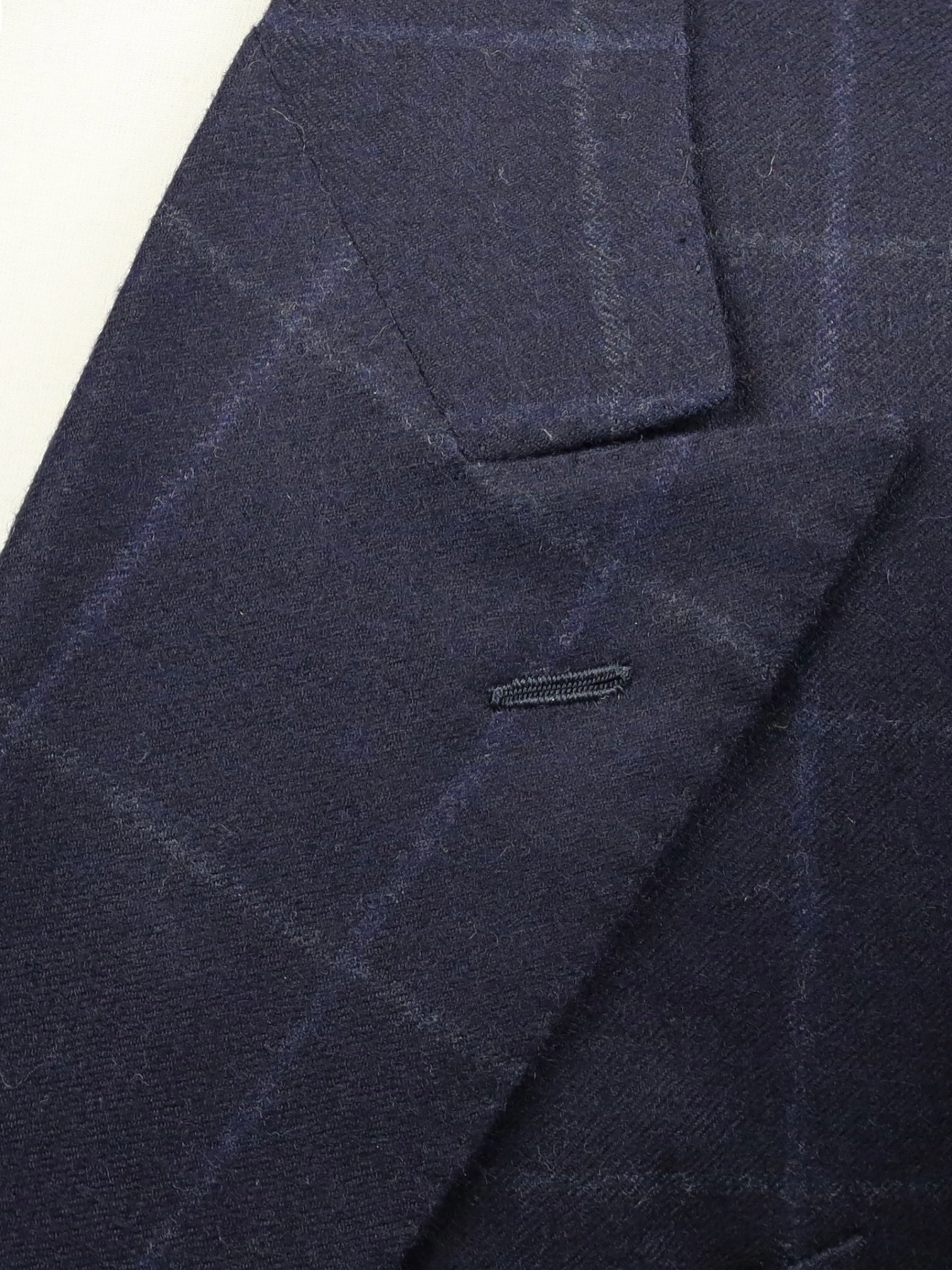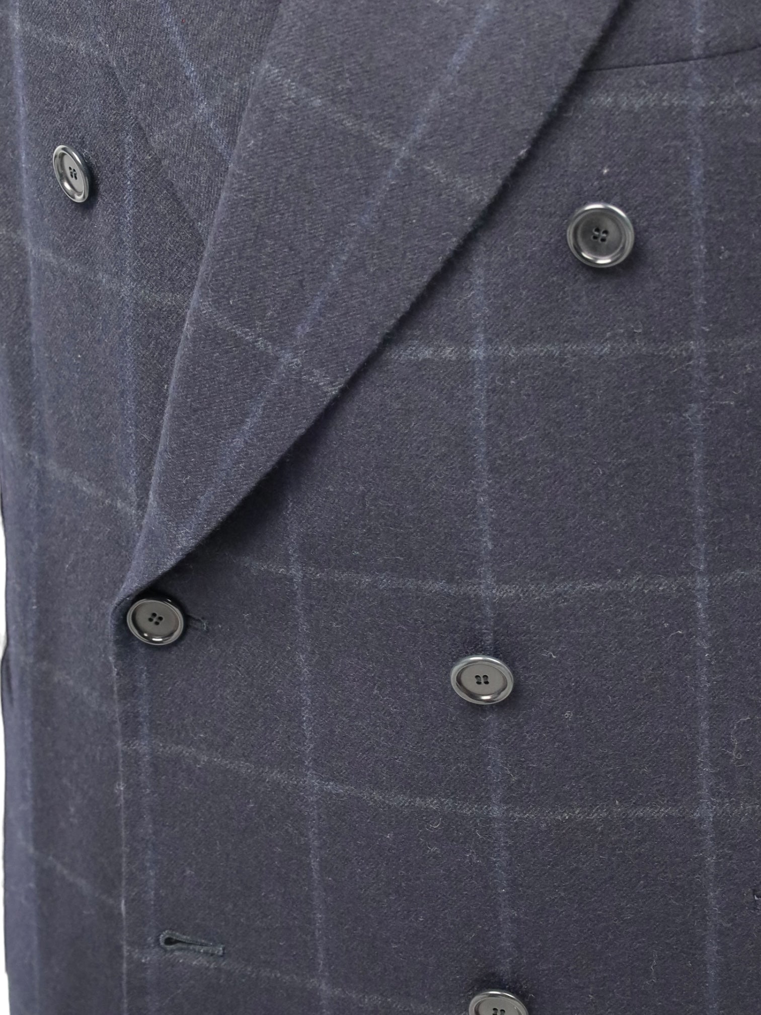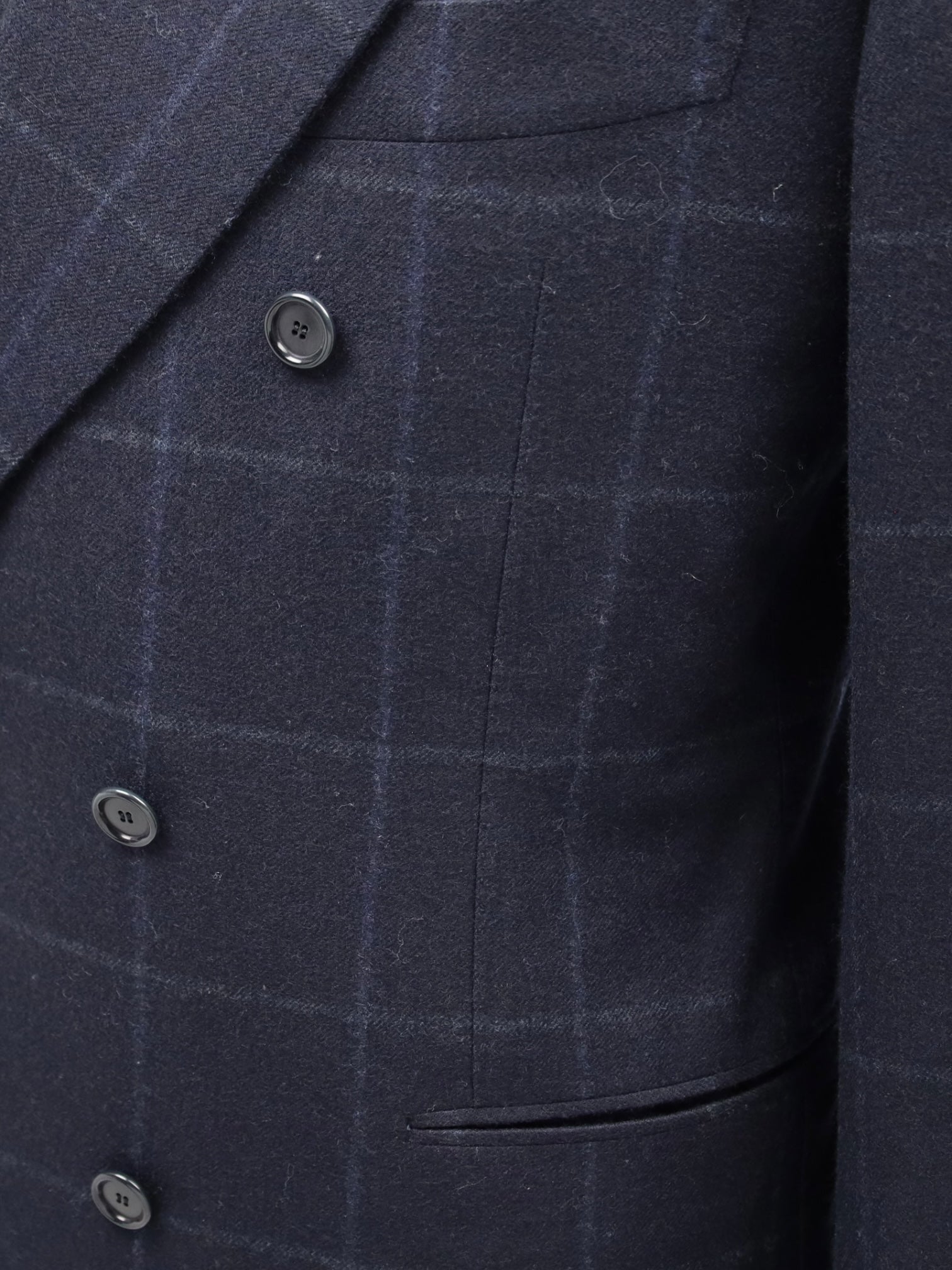 Handgemaakt double-breasted jasje van wol, met puntige revers, paspelzakken en - handgemaakte - functionerende knoopsgaten aan het uiteinde van de mouw. Ontdek hieronder de uitgebreide kleermakersdetails.