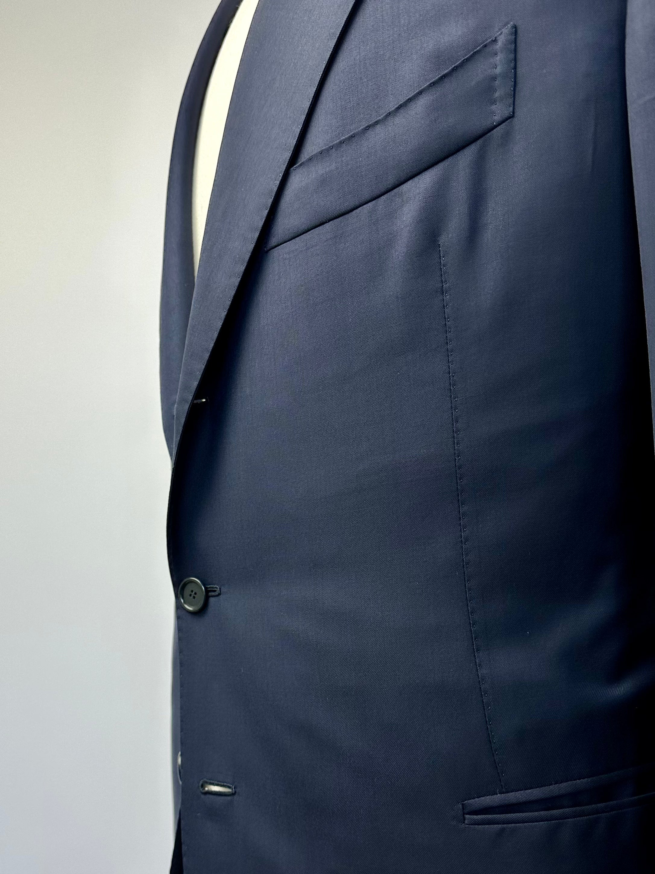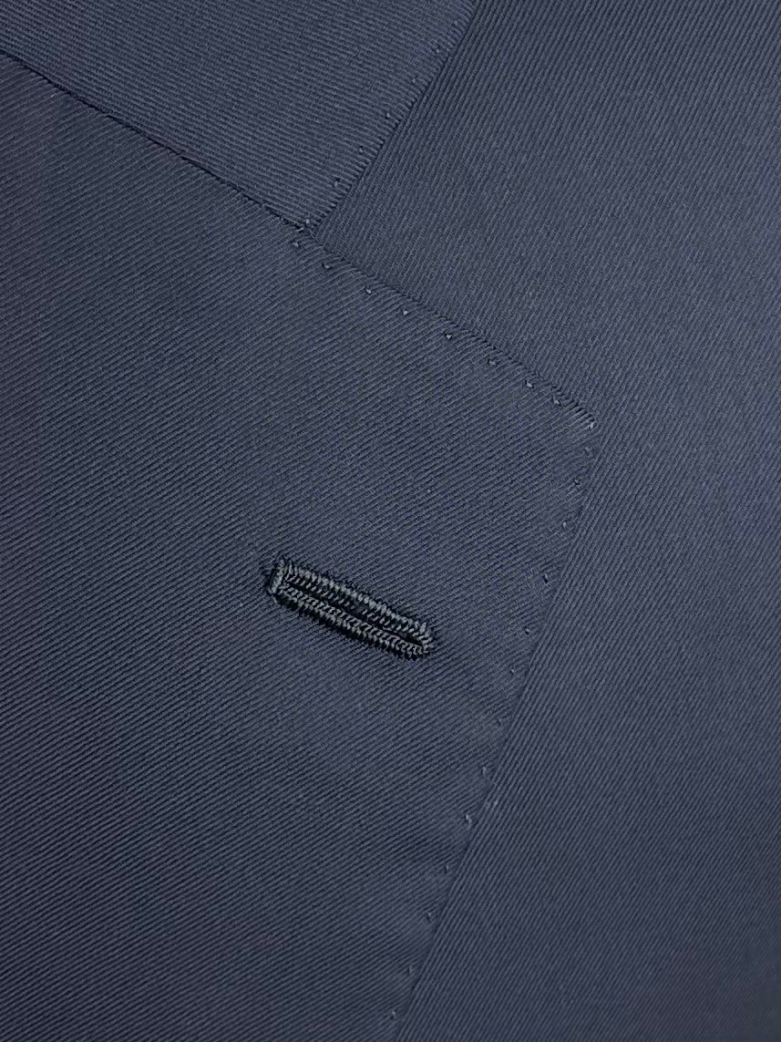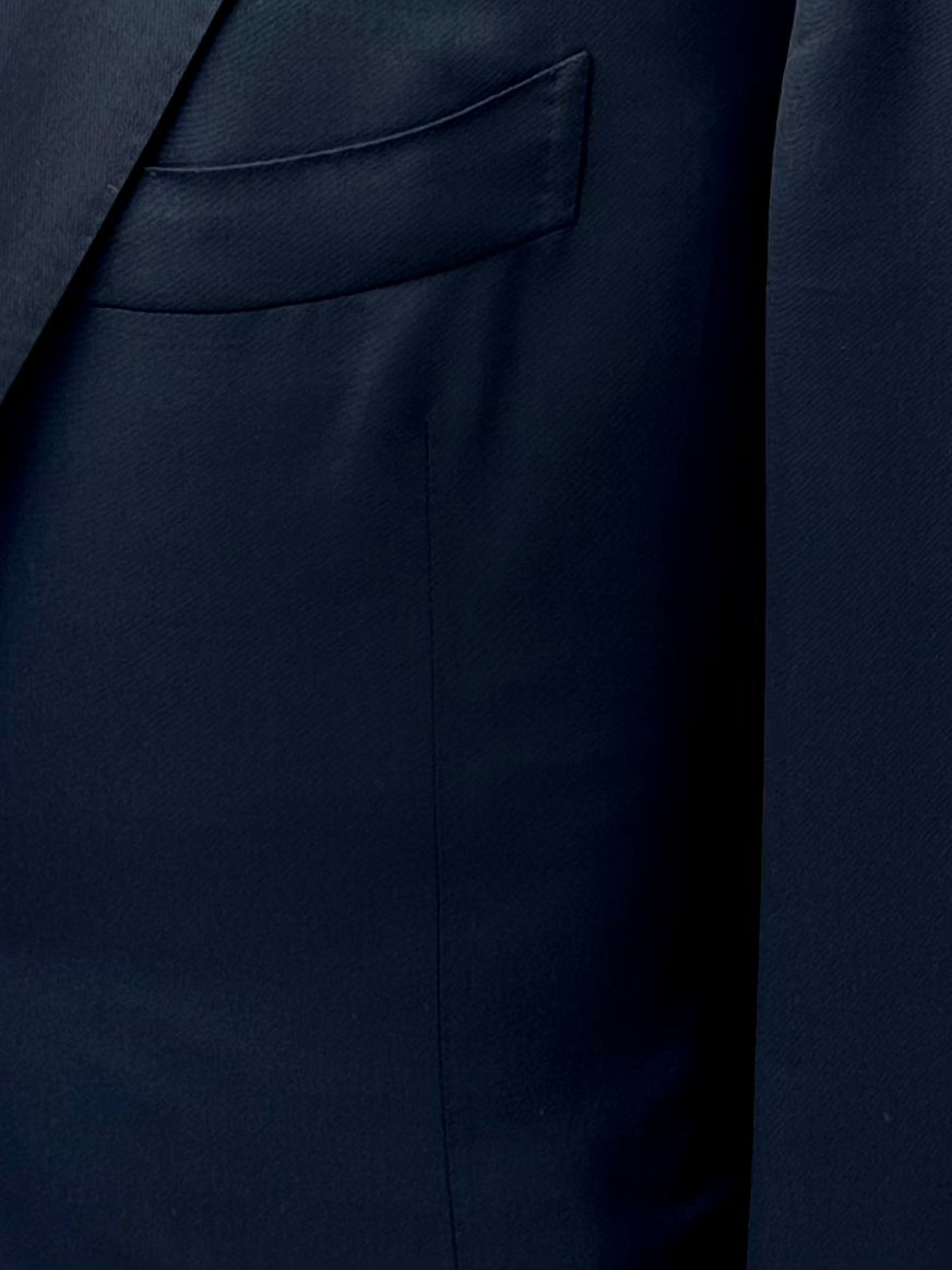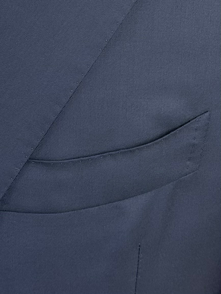 Handgemaakt Napolitaans pak gemaakt van scheerwol, met ingekeepte revers, paspelzakken en handgemaakte knoopsgaten - aan het uiteinde van de mouw. Het jasje bevat een La Spalla Camicia , een typisch detail van het Napolitaanse maatwerk. Ontdek hieronder de uitgebreide kleermakersdetails.