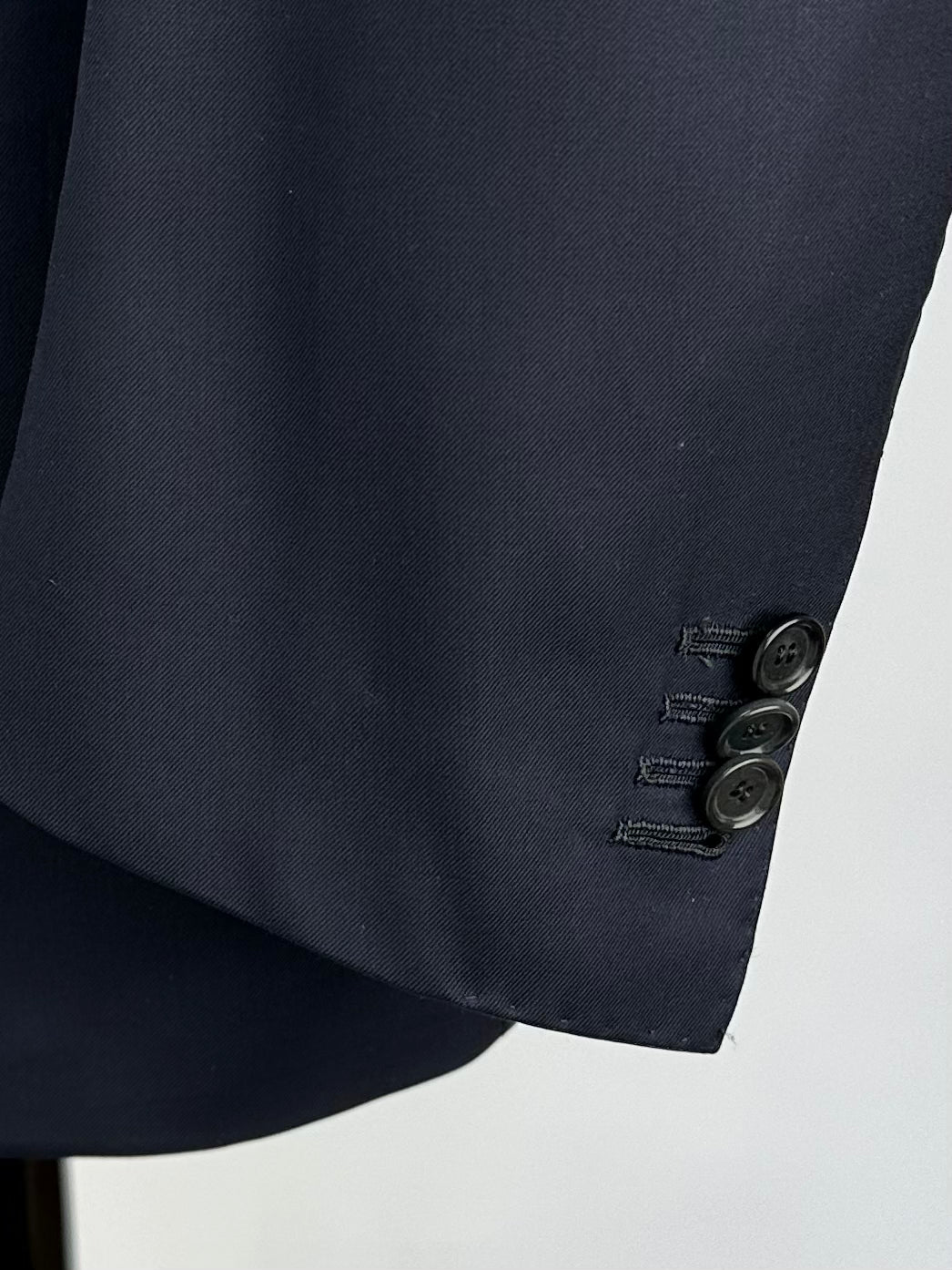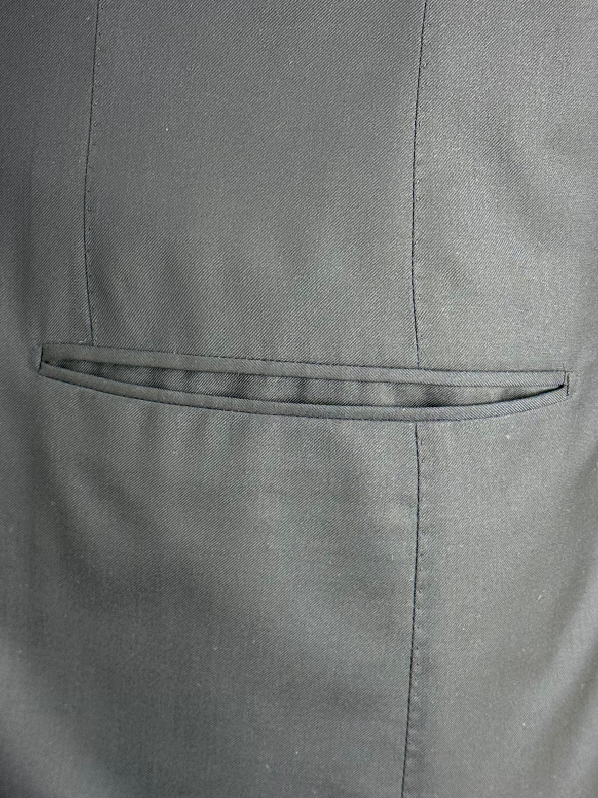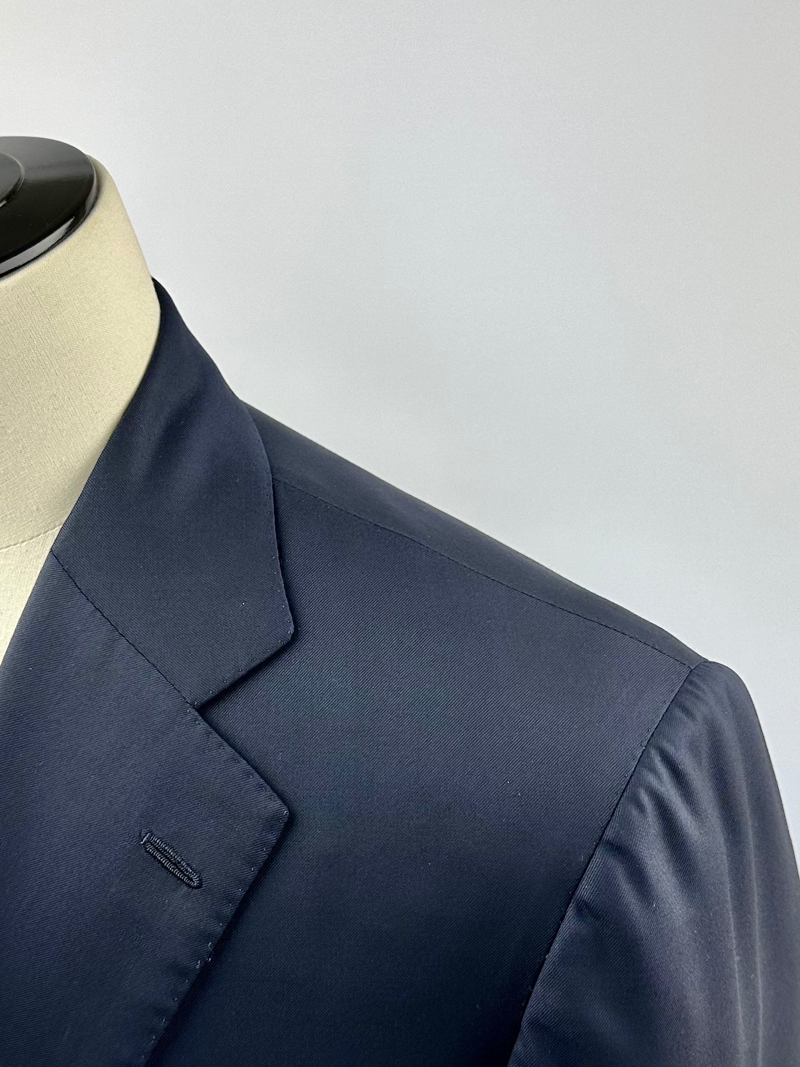 Handgemaakt Napolitaans pak gemaakt van scheerwol, met ingekeepte revers, paspelzakken en handgemaakte knoopsgaten - aan het uiteinde van de mouw. Het jasje bevat een La Spalla Camicia , een typisch detail van het Napolitaanse maatwerk. Ontdek hieronder de uitgebreide kleermakersdetails.