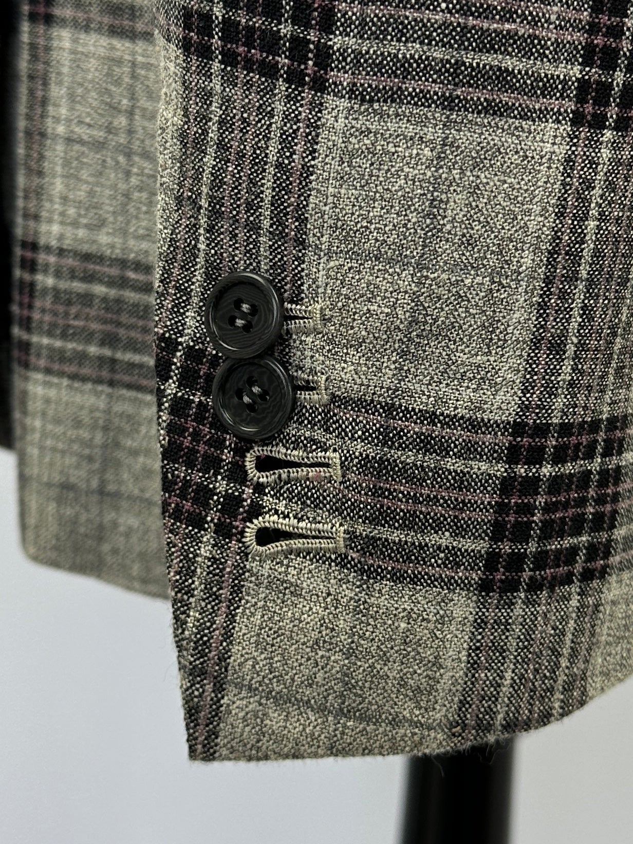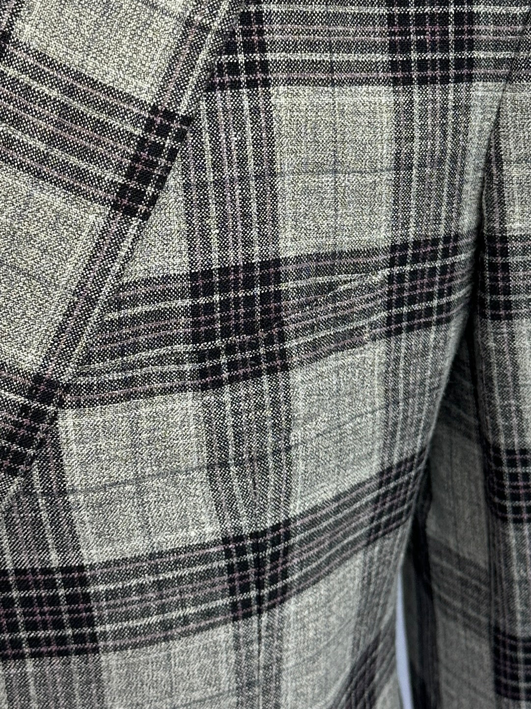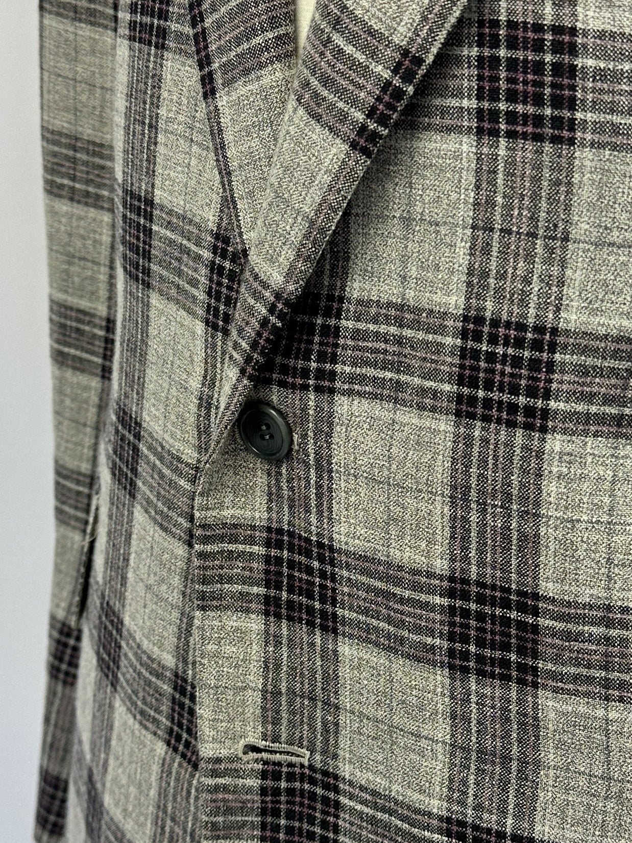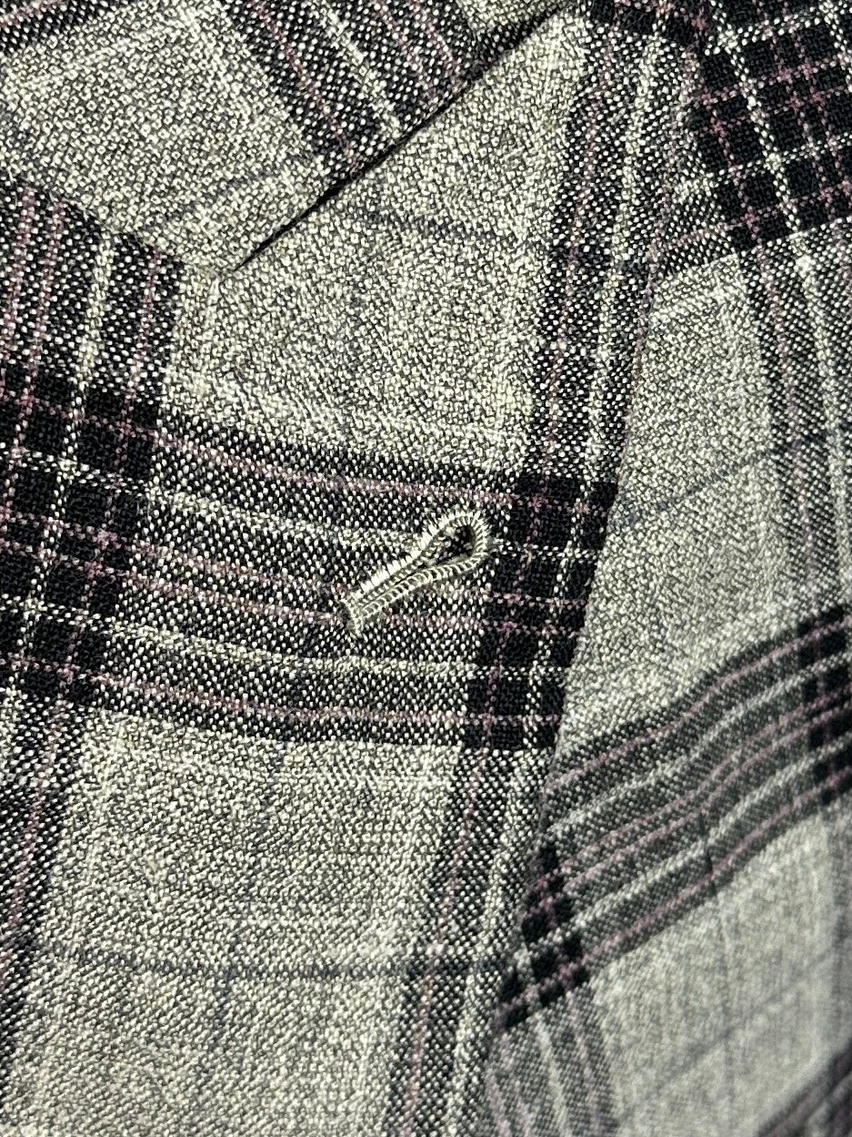 Grijs met paars single-breasted jasje van een zachte wol-, zijde- en linnenmix met een glen-plaid ruitpatroon en brede puntige revers. De formele look met de eclectische inslag belichaamt dandyisme op zijn best - de kleermaker staat bekend om de moderne interpretatie van de Napolitaanse sectie. Het mannelijke silhouet is vakkundig uitgewerkt. De schouders worden perfect geaccentueerd, de taille flatterend benadrukt en de broek op perfecte lengte gebracht. Ontdek hieronder de uitgebreide kleermakersdetails.