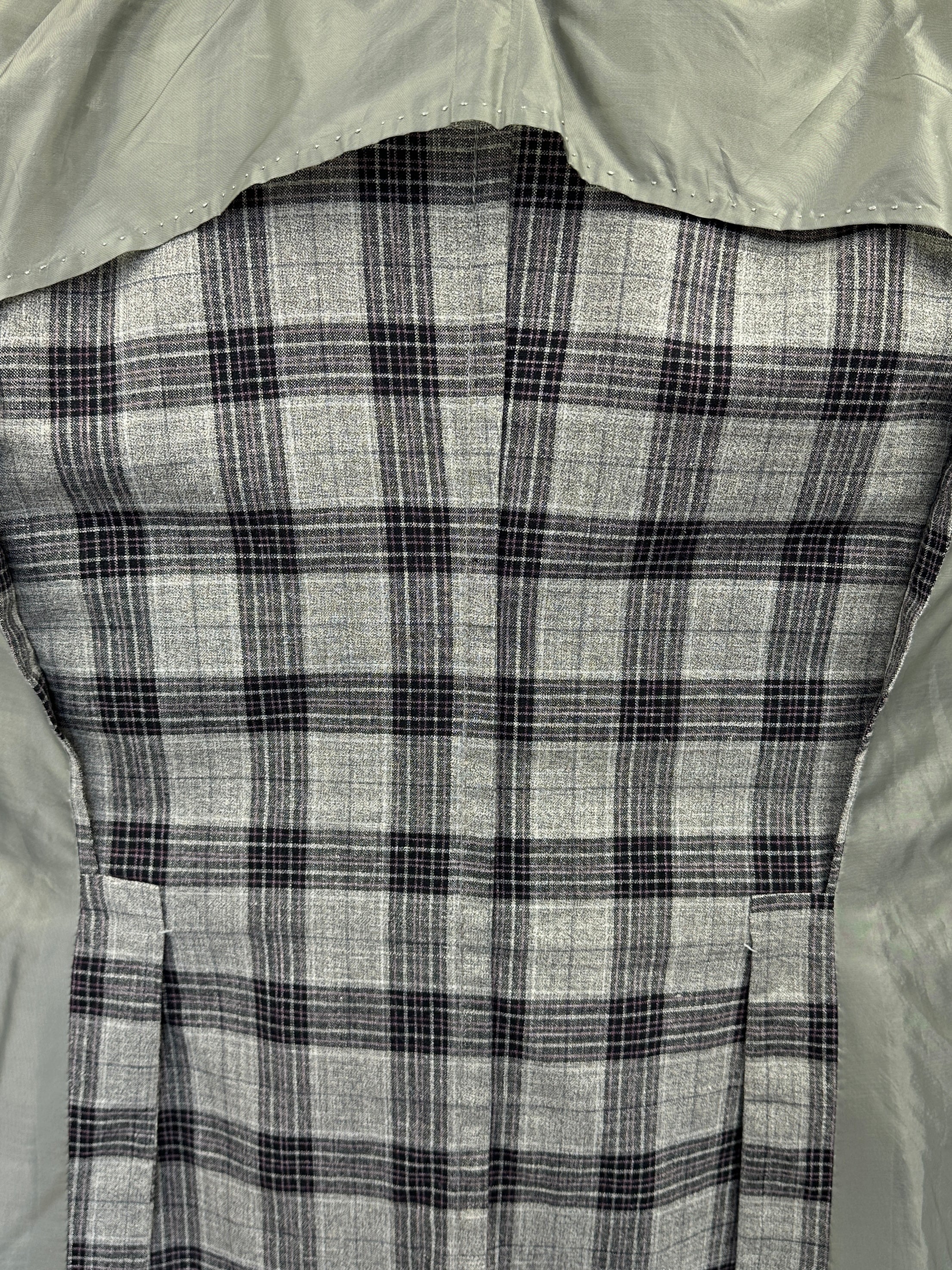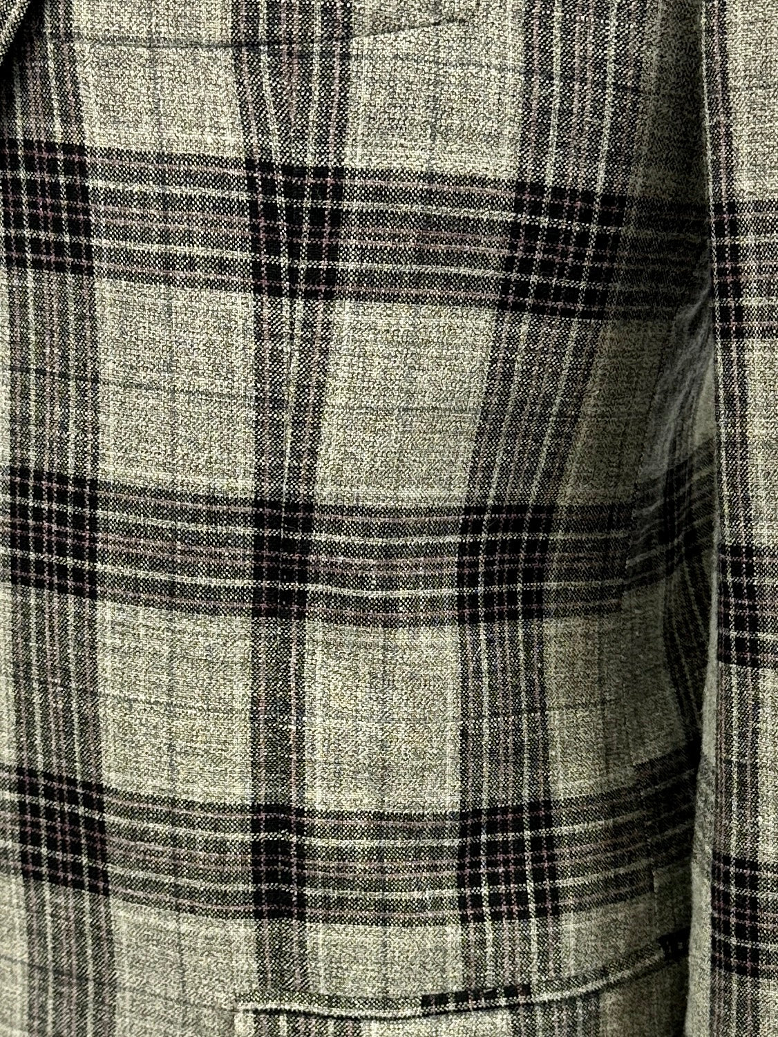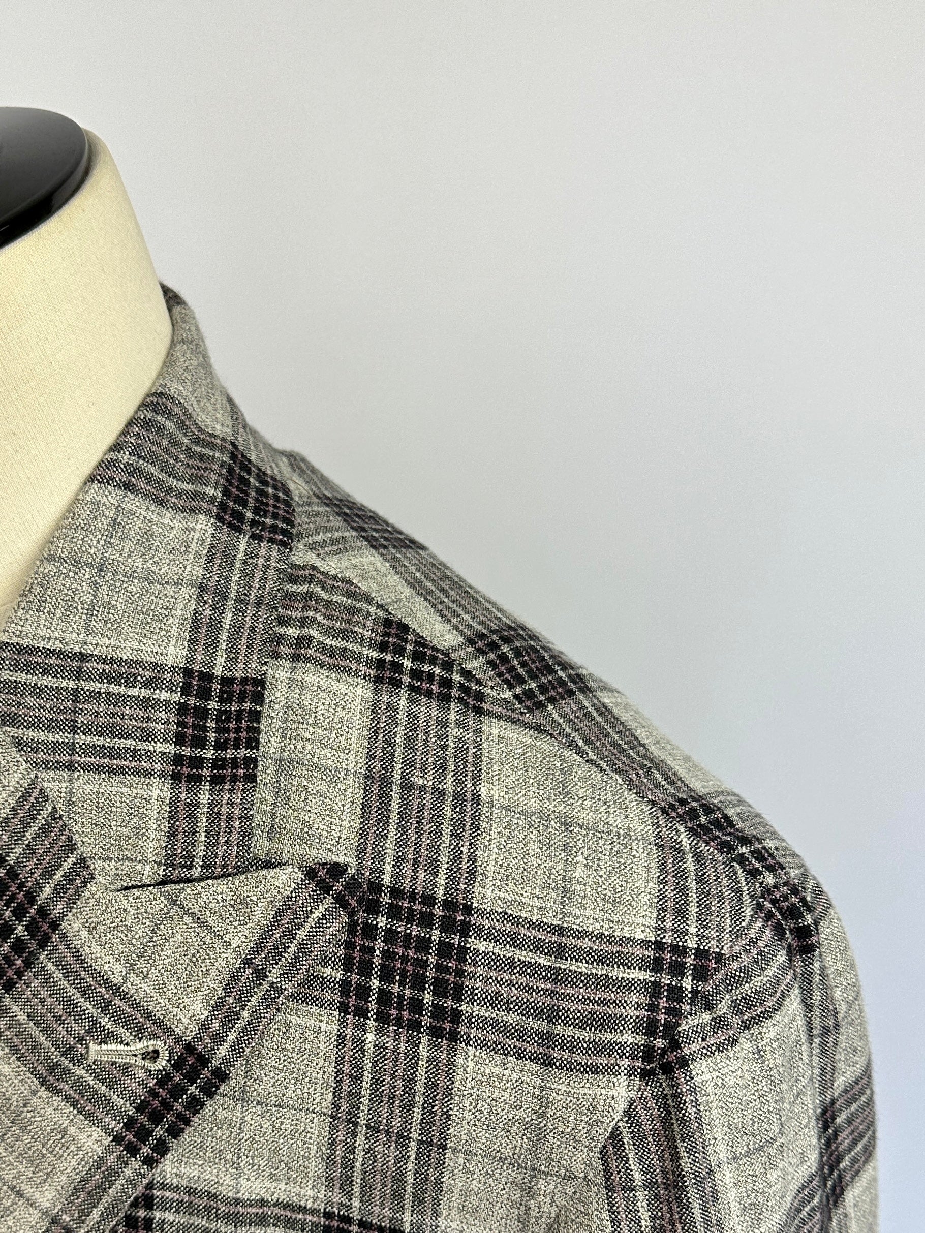 Grijs met paars single-breasted jasje van een zachte wol-, zijde- en linnenmix met een glen-plaid ruitpatroon en brede puntige revers. De formele look met de eclectische inslag belichaamt dandyisme op zijn best - de kleermaker staat bekend om de moderne interpretatie van de Napolitaanse sectie. Het mannelijke silhouet is vakkundig uitgewerkt. De schouders worden perfect geaccentueerd, de taille flatterend benadrukt en de broek op perfecte lengte gebracht. Ontdek hieronder de uitgebreide kleermakersdetails.