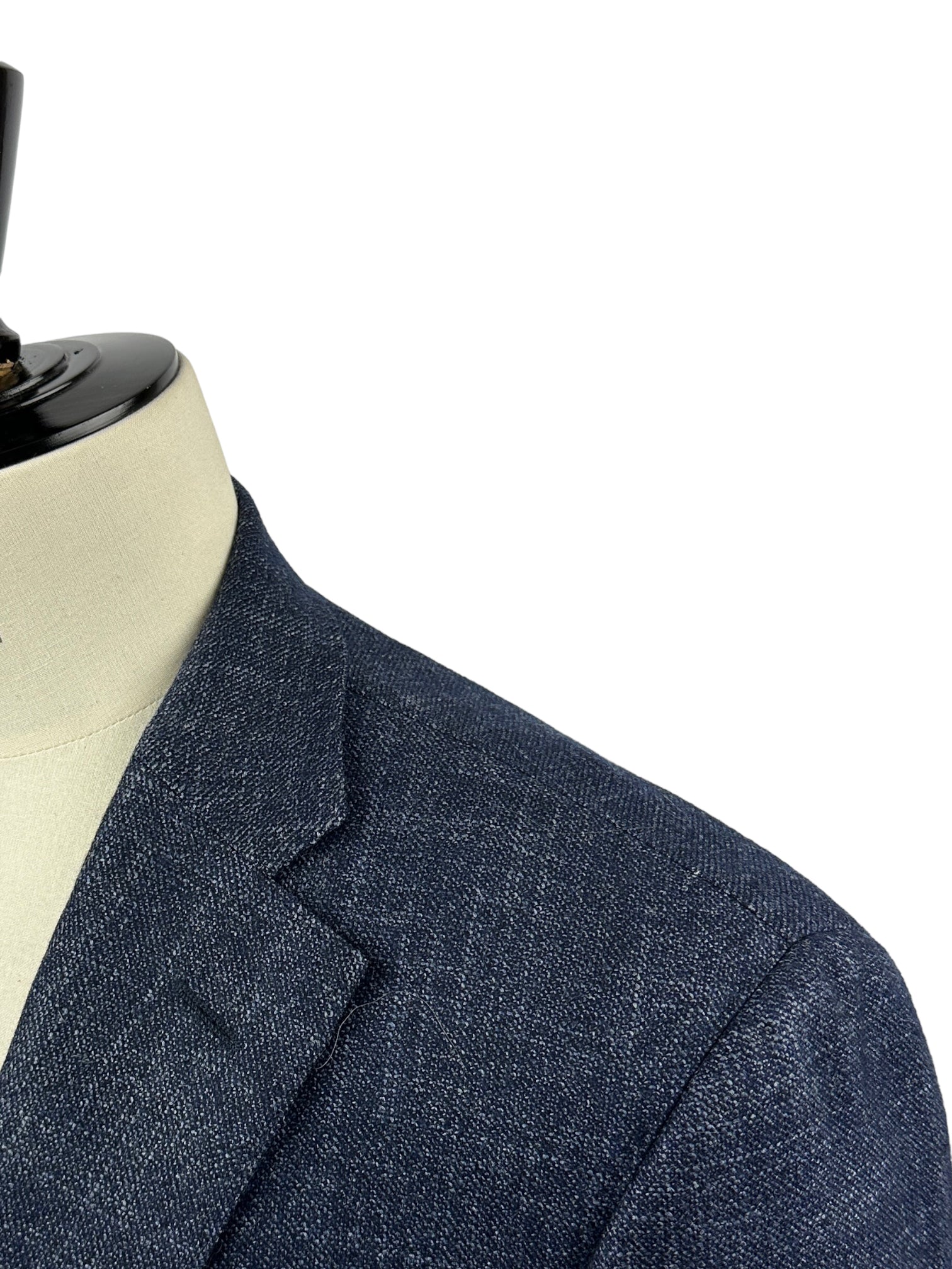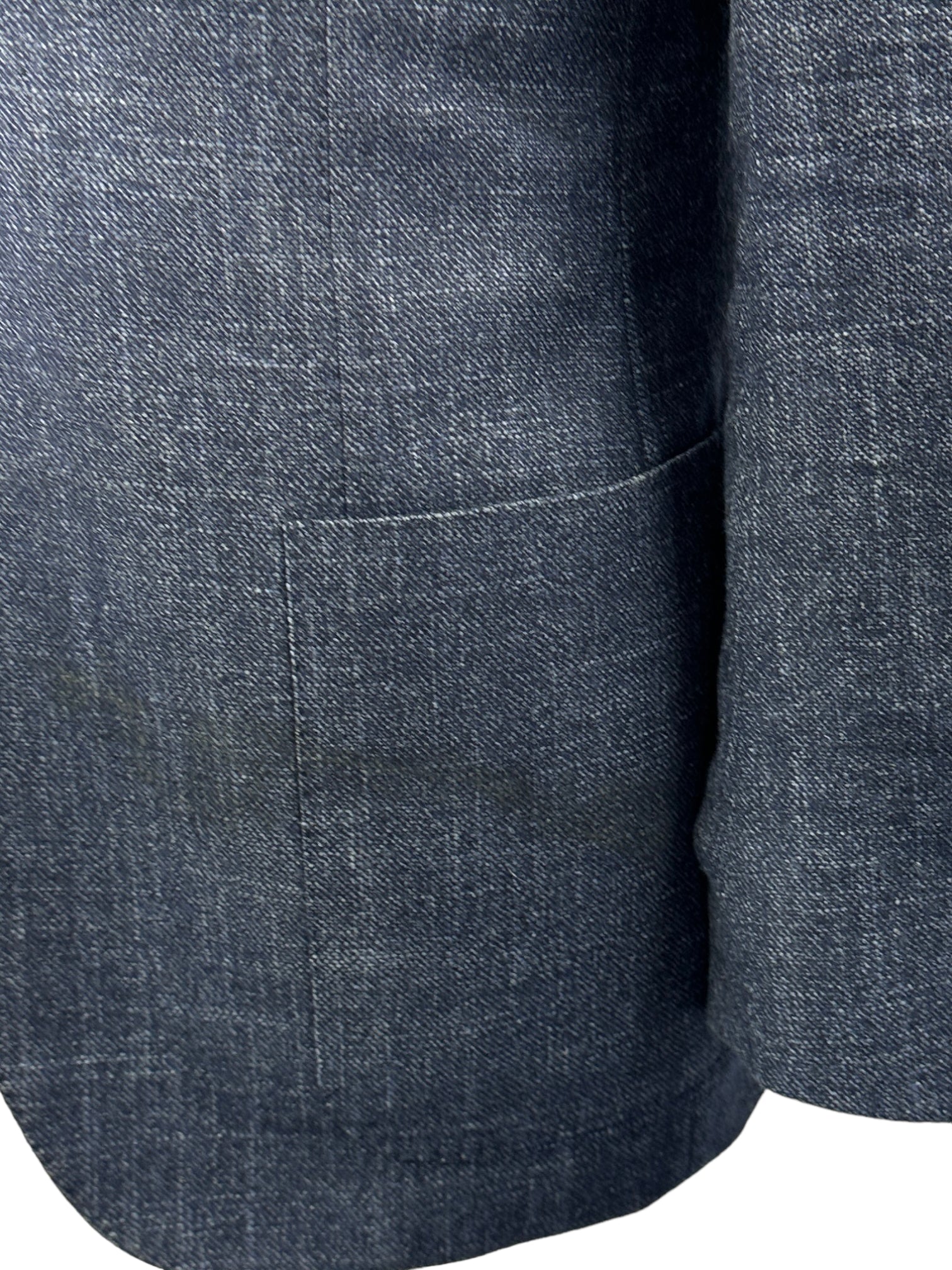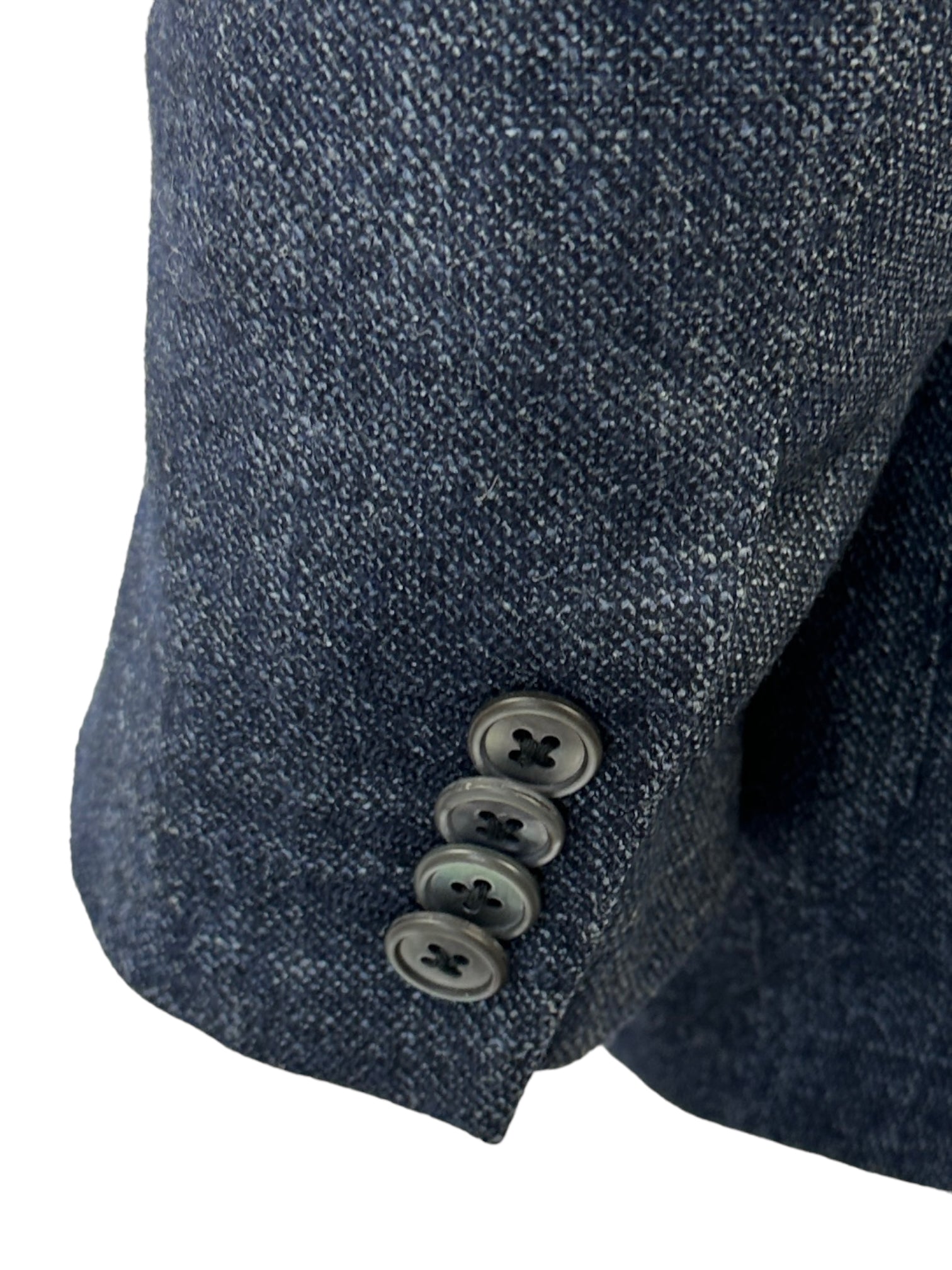 Blauwe blazer met zachte constructie, gemaakt van een luxe wol-, zijde- en kasjmiermix met notch-revers, opgestikte zakken, dubbele zijsplit en parelmoeren knopen. Ontdek hieronder de uitgebreide kleermakersdetails.