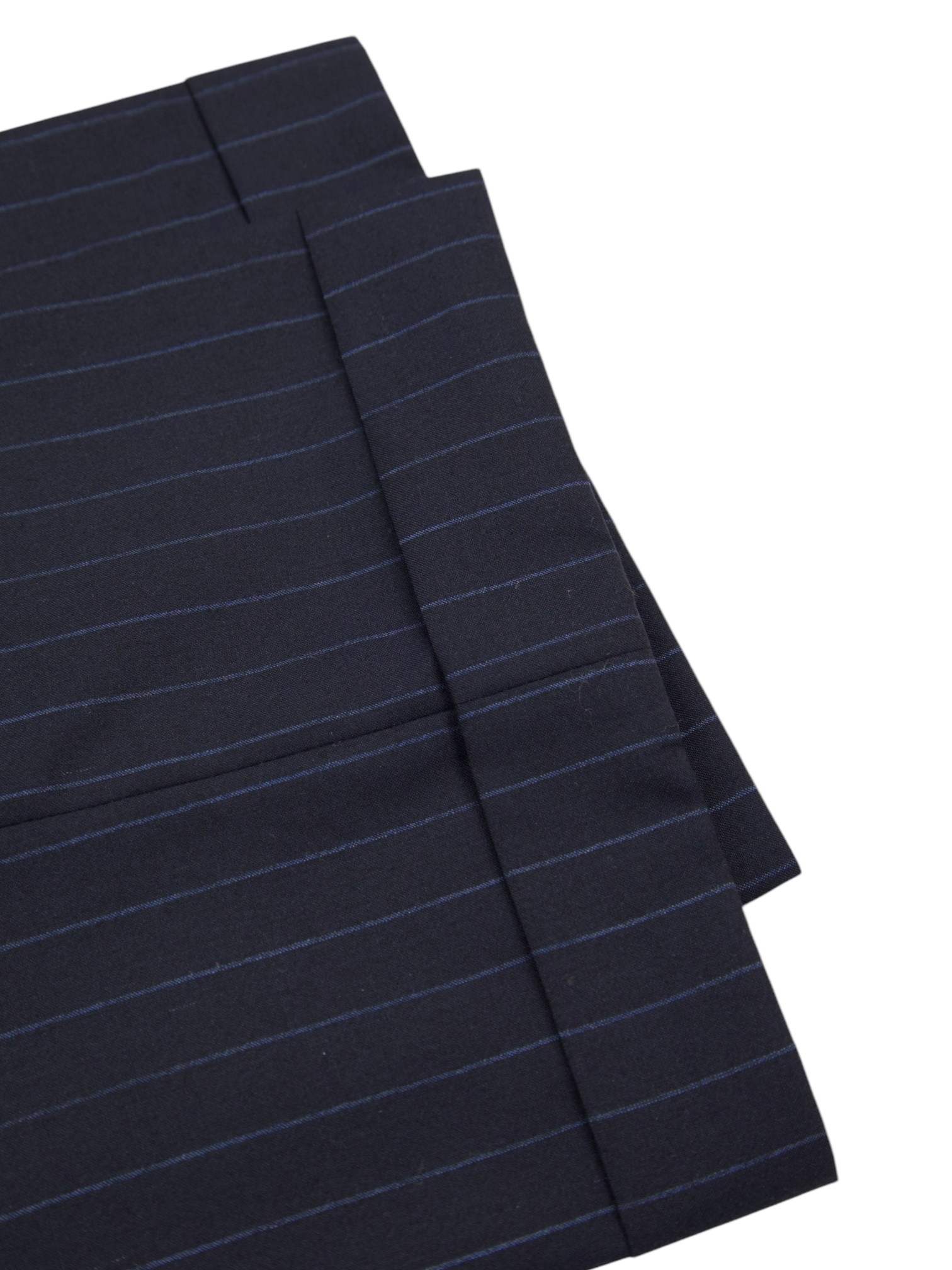 Discover the Ermenegildo Zegna Navy Cashmere & Silk Pinstripe 'Roma' Suit, a masterpiece of Italian tailoring that exudes timeless elegance. This distinguished ensemble is meticulously crafted from a luxurious blend of cashmere and silk, offering an exceptionally soft texture and a subtle sheen. The deep navy fabric is adorned with light blue pinstripes, adding a touch of refined contrast to the classic design. The jacket features a distinctive 2.5-button closure—a hallmark of the 'Roma' model—providing a modern twist on traditional suiting. The trousers are designed with a single pleat and turn-ups (cuffs), enhancing their sophisticated appeal.