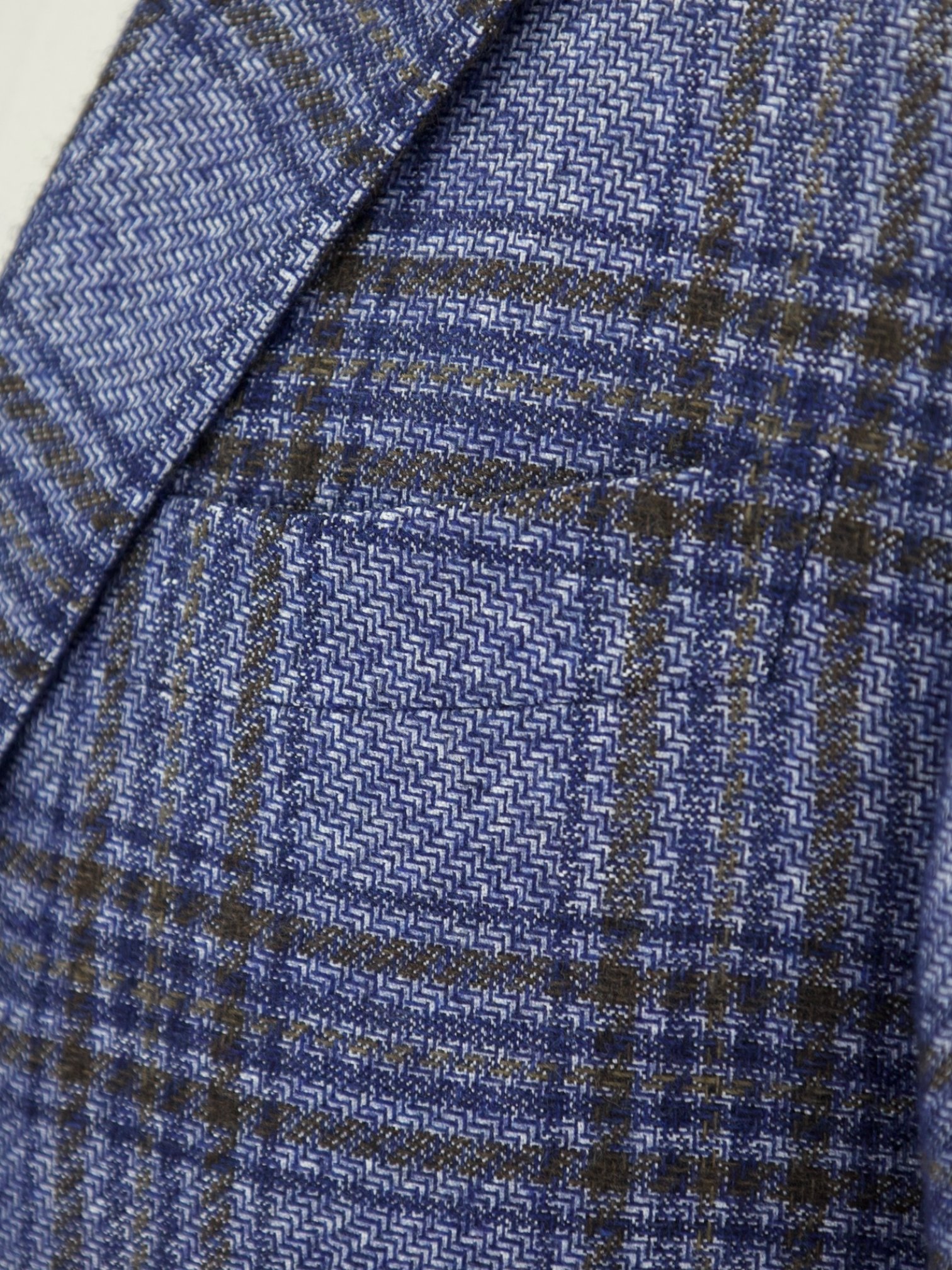 Ook bekend als 'barchetta', Italiaans voor 'bootje', wordt het zo genoemd omdat deze zak zweeft op de borst, lichtjes schuin omhoog, net als de boeg van een zeilboot. Deze zakken echoën de levendige rol van een revers die de veerkracht van canvas en natuurlijke wol draagt, in tegenstelling tot machinaal gemaakte borstzakken die een meer platte, rechthoekige vorm hebben en minder leven.