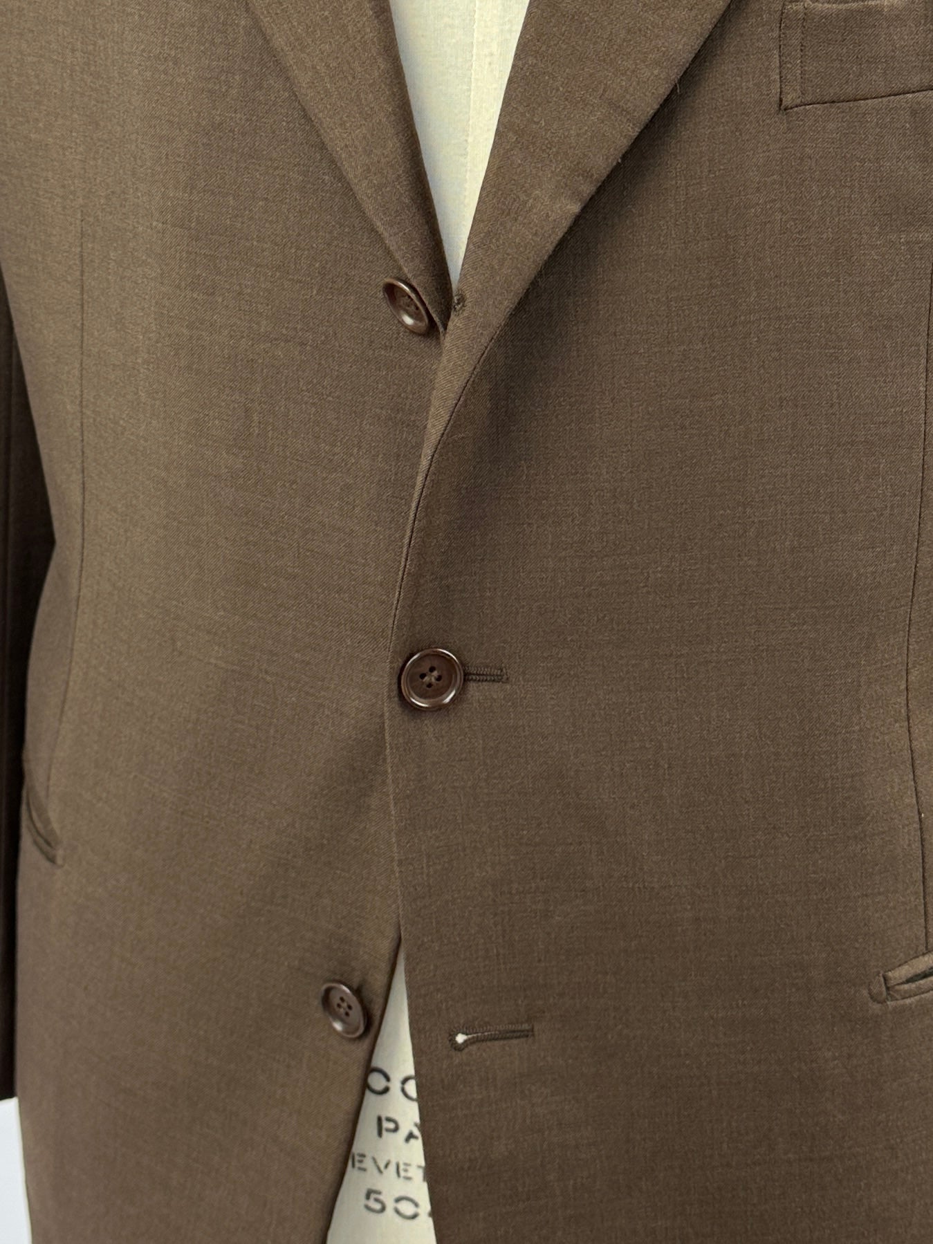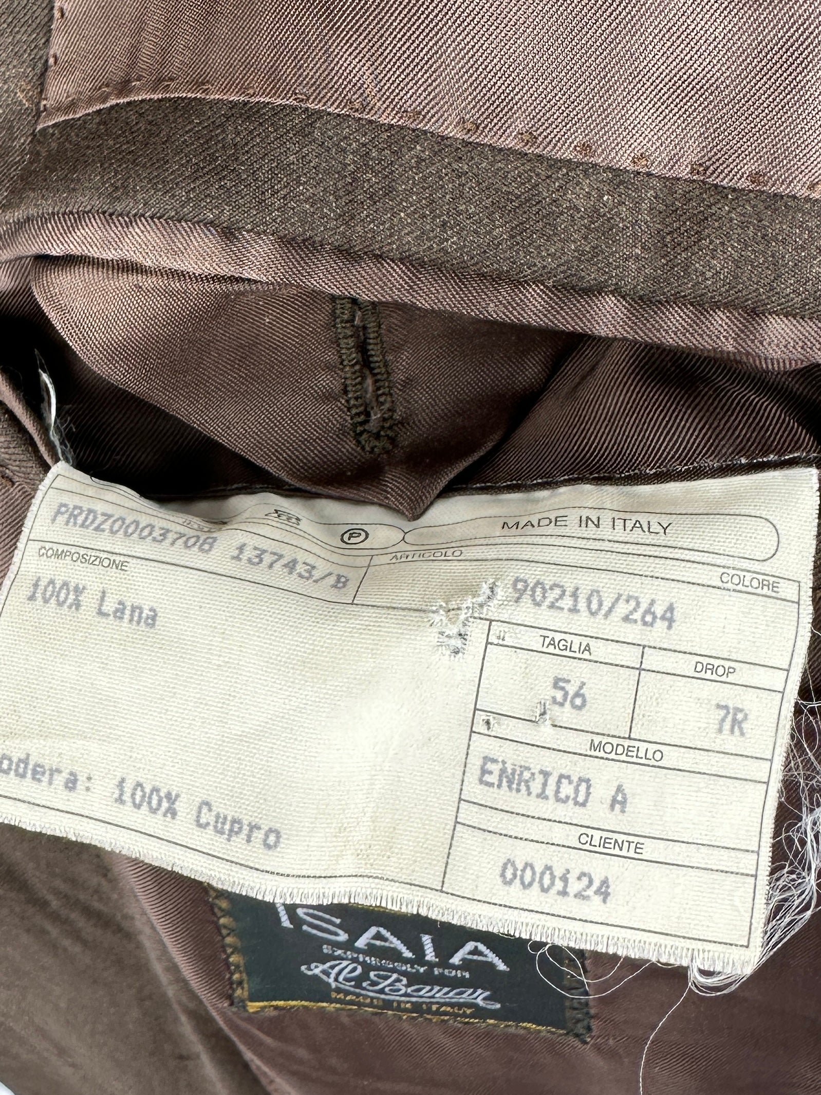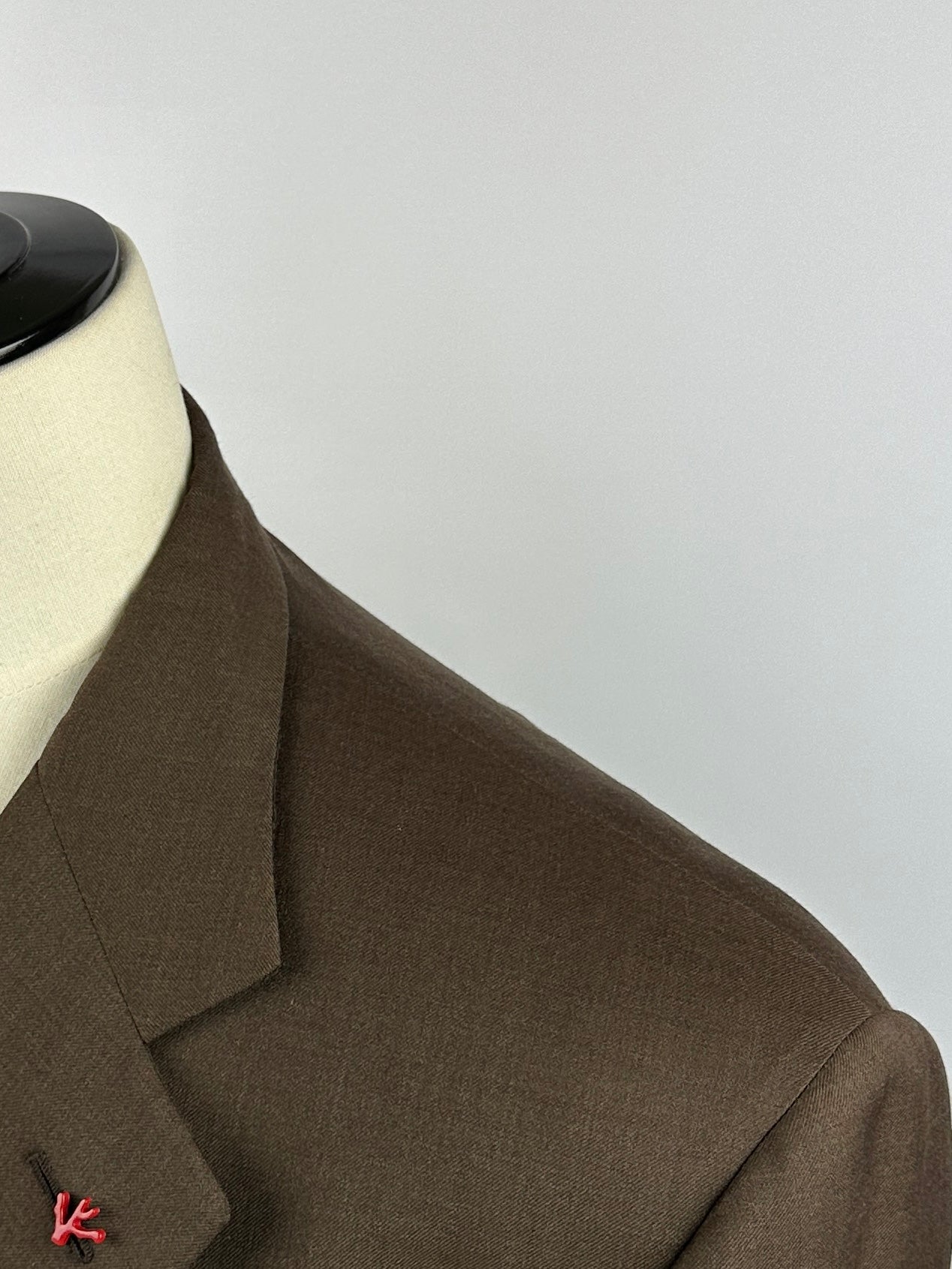 Chocoladebruin jasje, gesneden uit een exclusieve Loro Piana Tasmanian Super 120's Wool met ingesneden revers, klepzakken, dubbele zijsplitten, hoornen knopen en versierd met de typische Isaia rode koraalpin in het knoopsgat. Per Al Bazar Milano - een gerenommeerde herenkledingboetiek in Milaan, Italië. Het werd in 1974 opgericht door de broers Lino en Carlo Ieluzzi en is sindsdien een iconische bestemming geworden voor kleermakersliefhebbers. Lionel Luzzi heeft met zijn aangeboren gevoel voor stijl en onberispelijke smaak een selectie kleding en accessoires samengesteld die een perfecte mix van elegantie en hedendaagse herenkleding belichaamt. Zijn winkel staat bekend om zijn kenmerkende Italiaanse flair, met een breed scala aan kleermakers.