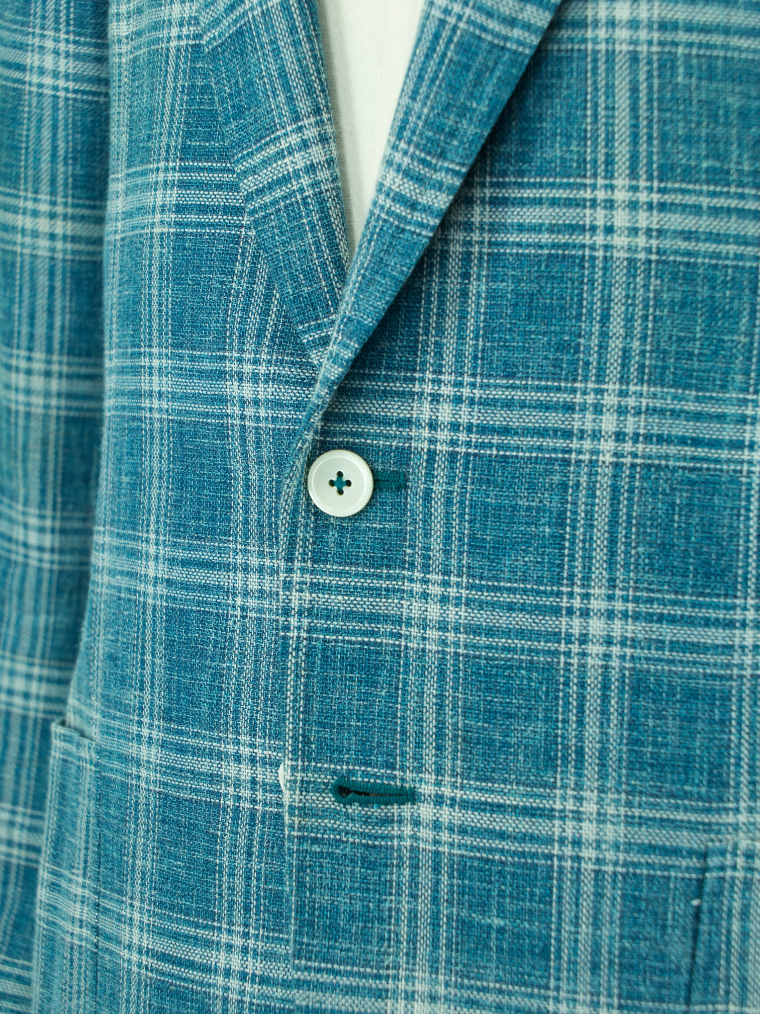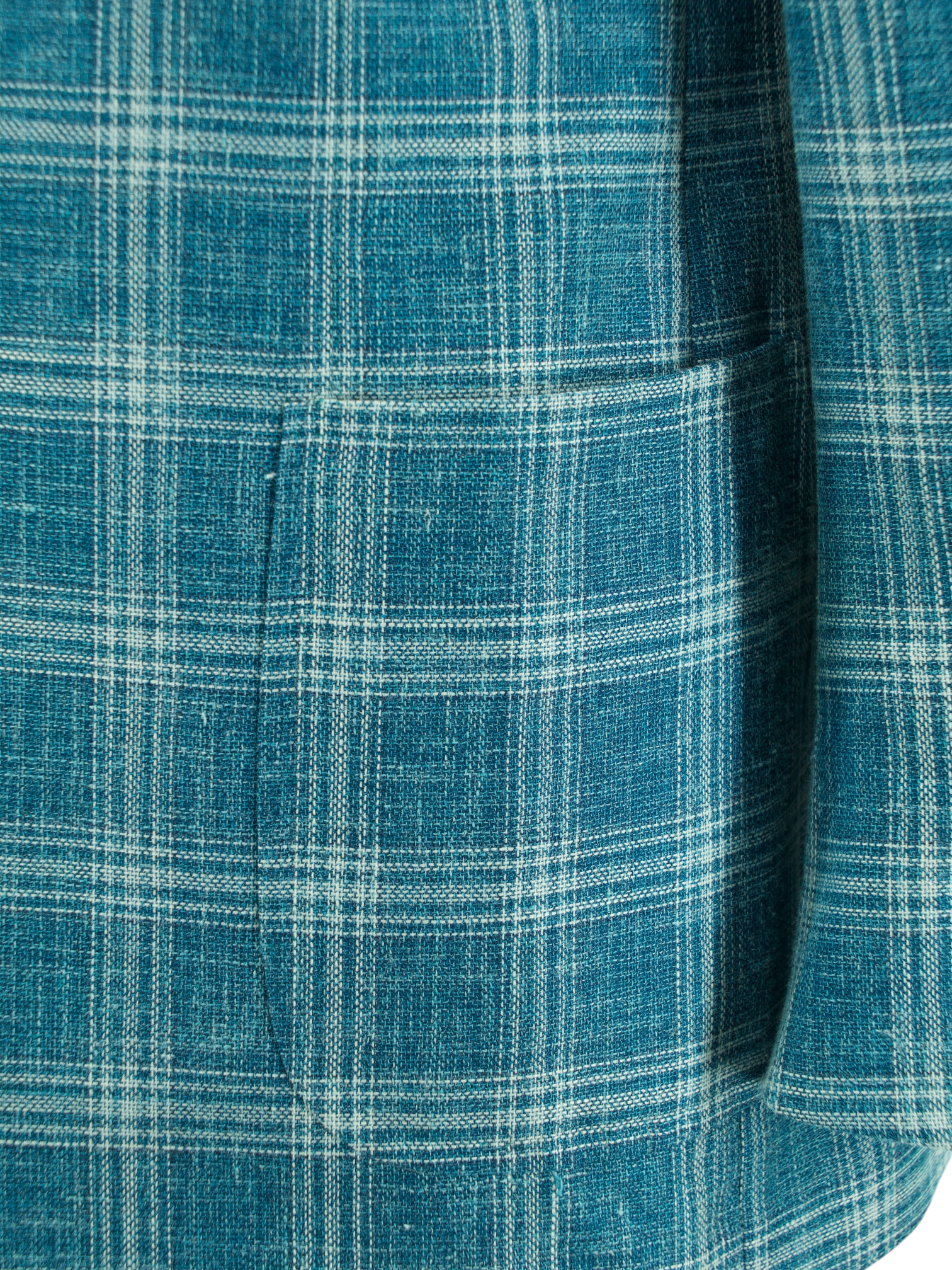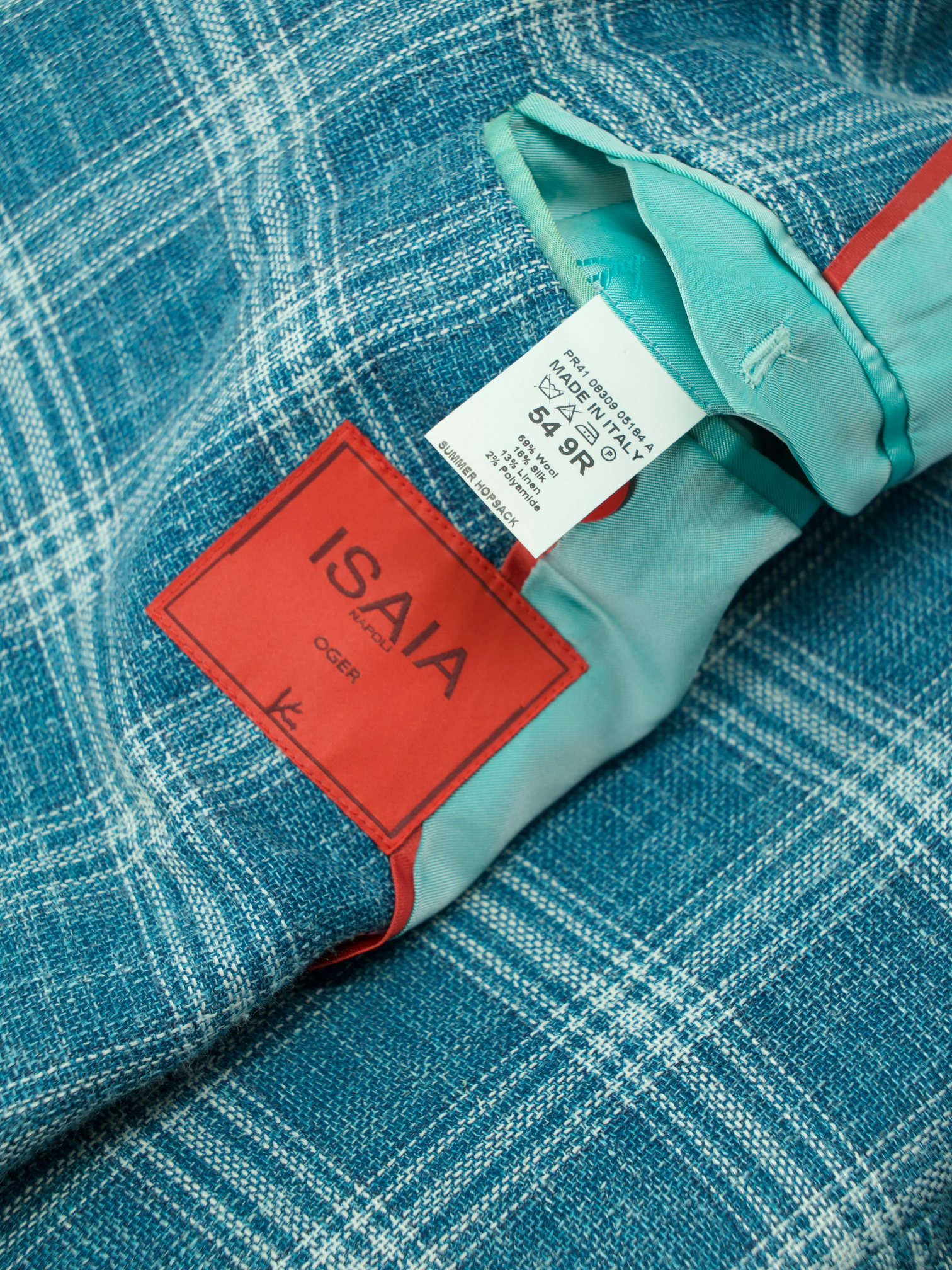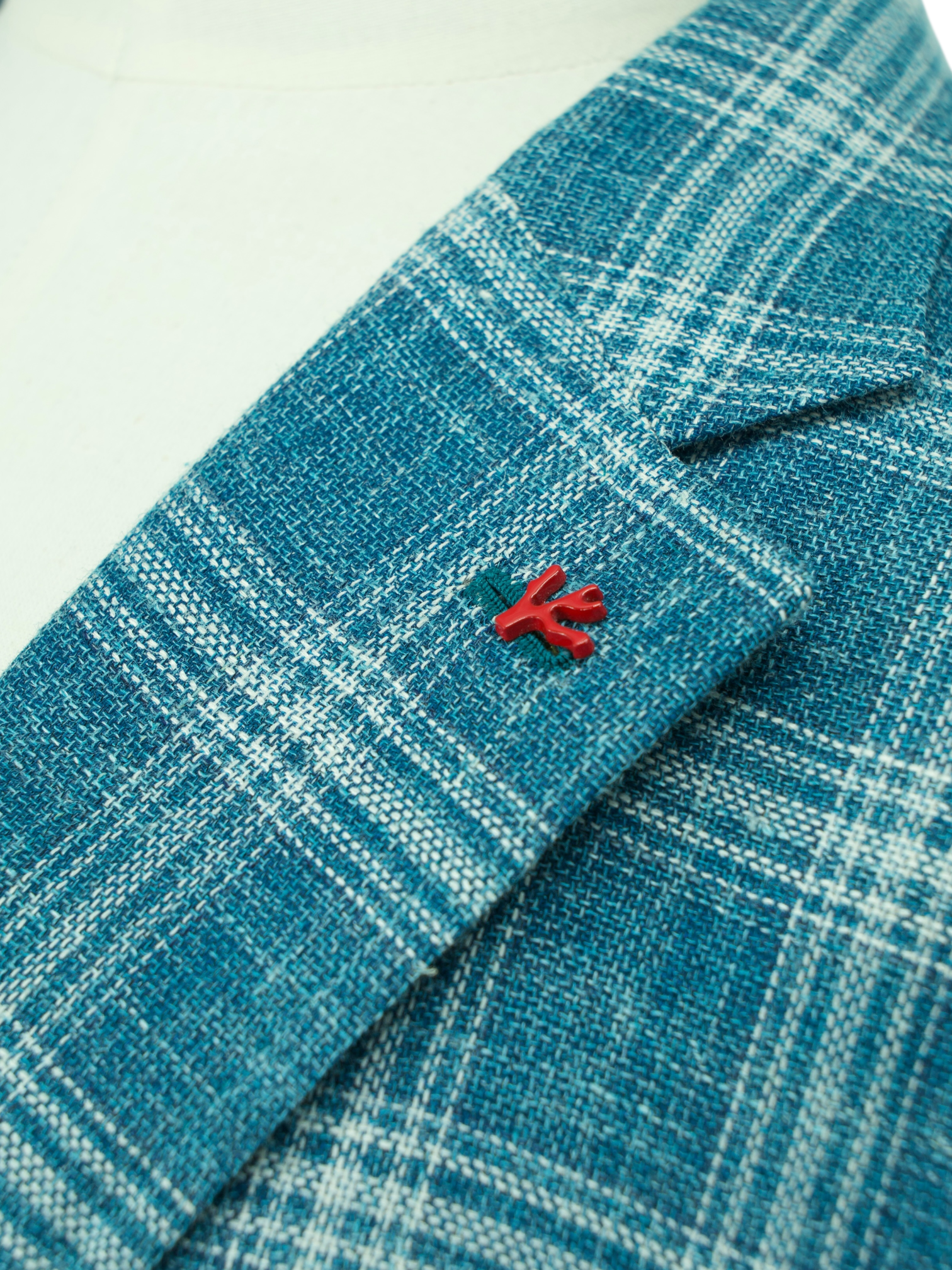 Discover the Isaia Turquoise Wool, Silk and Linen Summer Hopsack Windowpane Jacket, a vibrant yet refined option for warm-weather dressing. The bold turquoise base is tempered by a soft white windowpane check, woven into a breathable hopsack blend that balances structure with airiness. Cut with notch lapels, a two-button closure and patch pockets, it’s finished with white mother-of-pearl buttons and Isaia’s signature red coral lapel pin for a subtle nod to the brand’s Neapolitan roots.