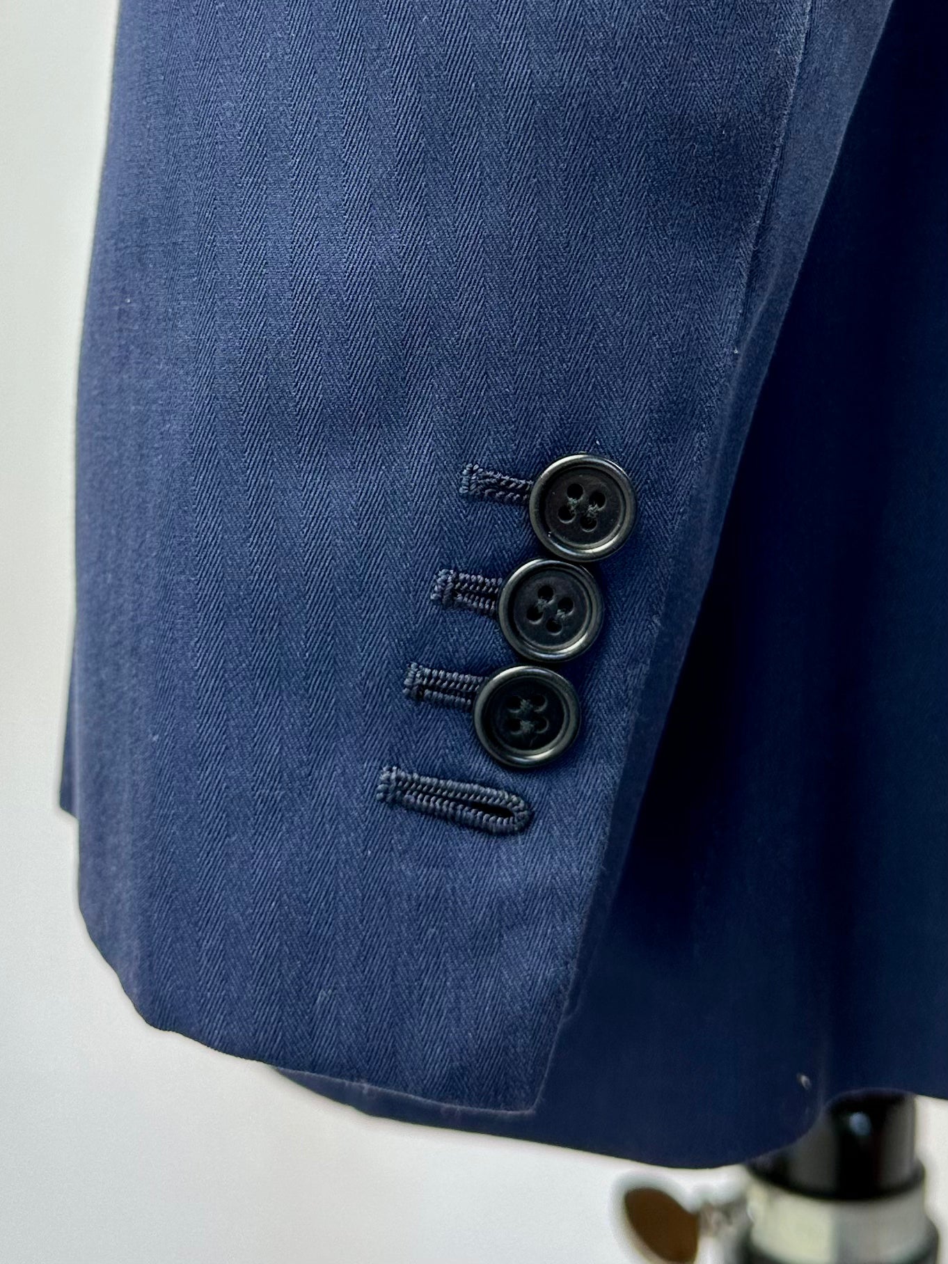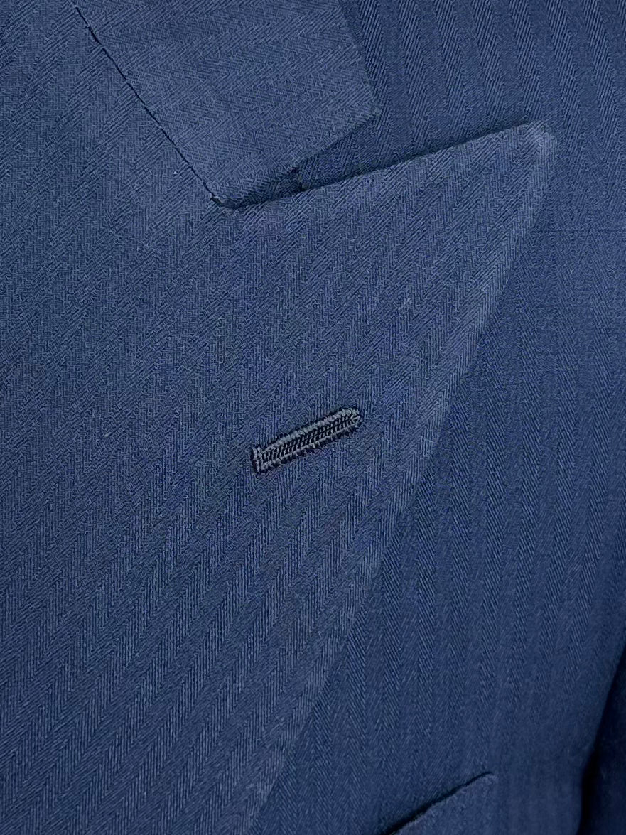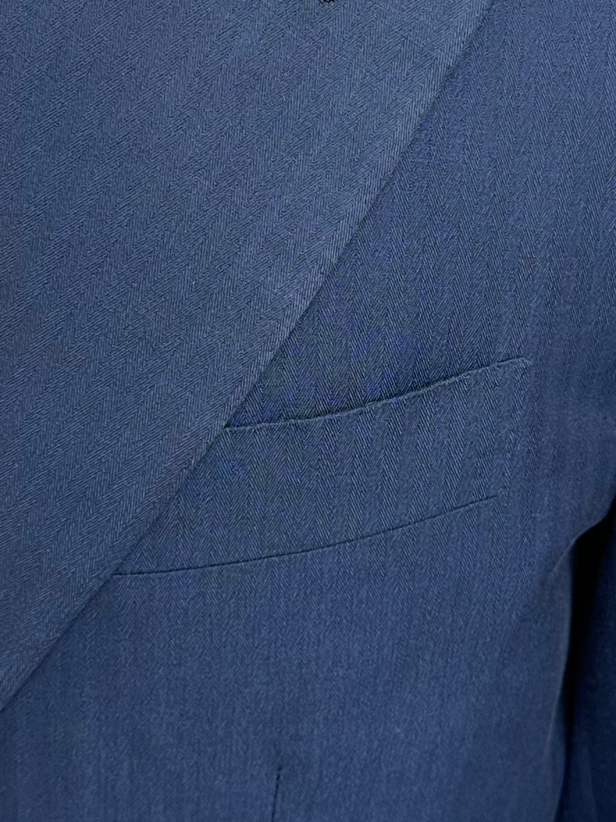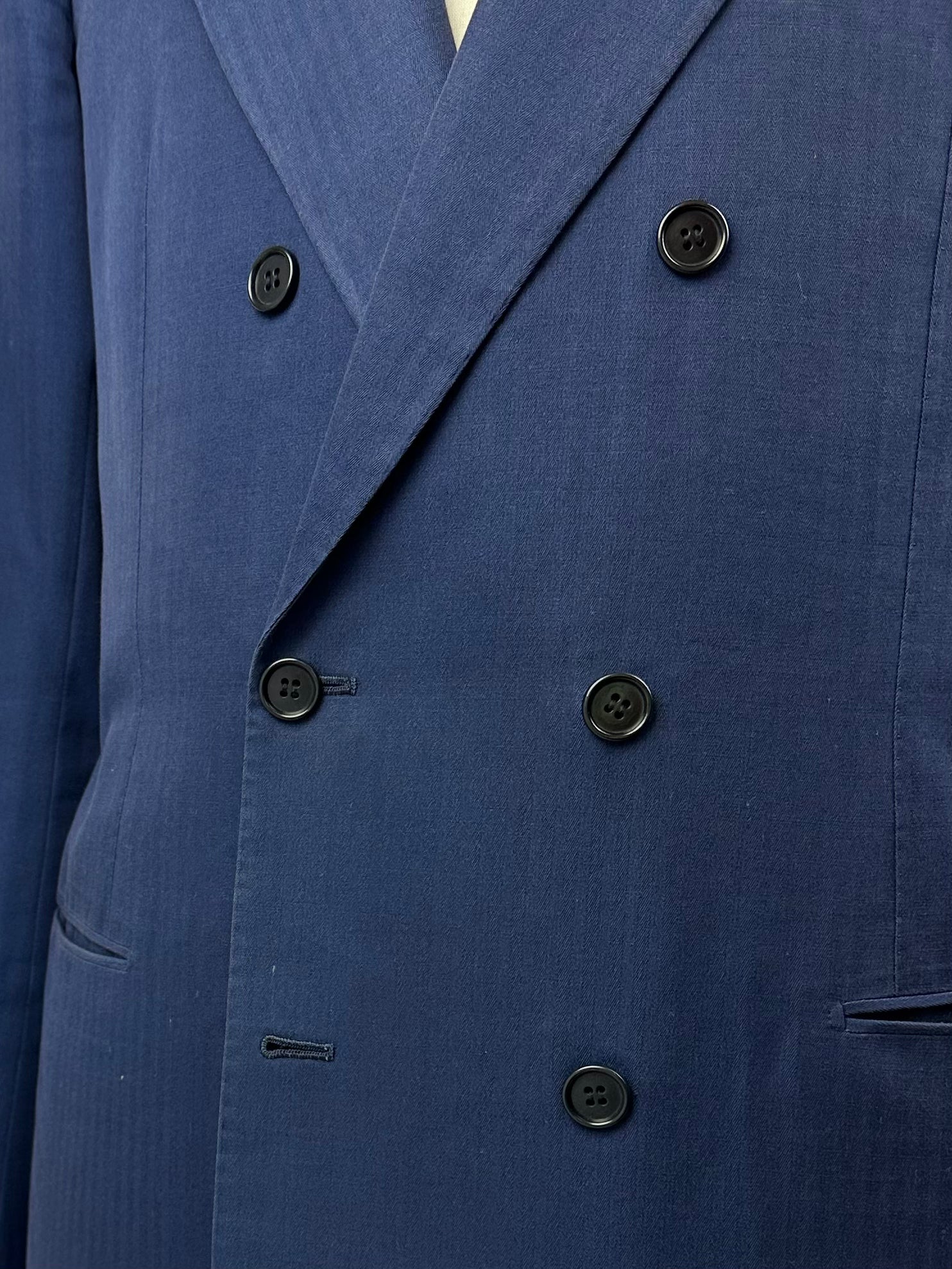 Donkerblauw handgemaakt pak met dubbele rij knopen, gesneden uit luxe katoen-, wol- en zijdemix met een visgraatmotief. Ontdek hieronder de uitgebreide kleermakersdetails.
