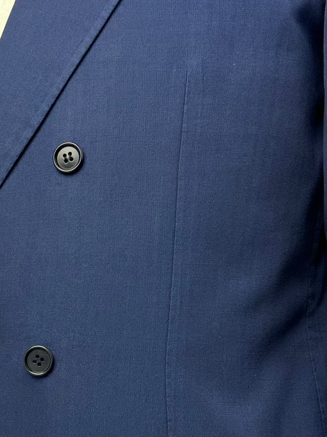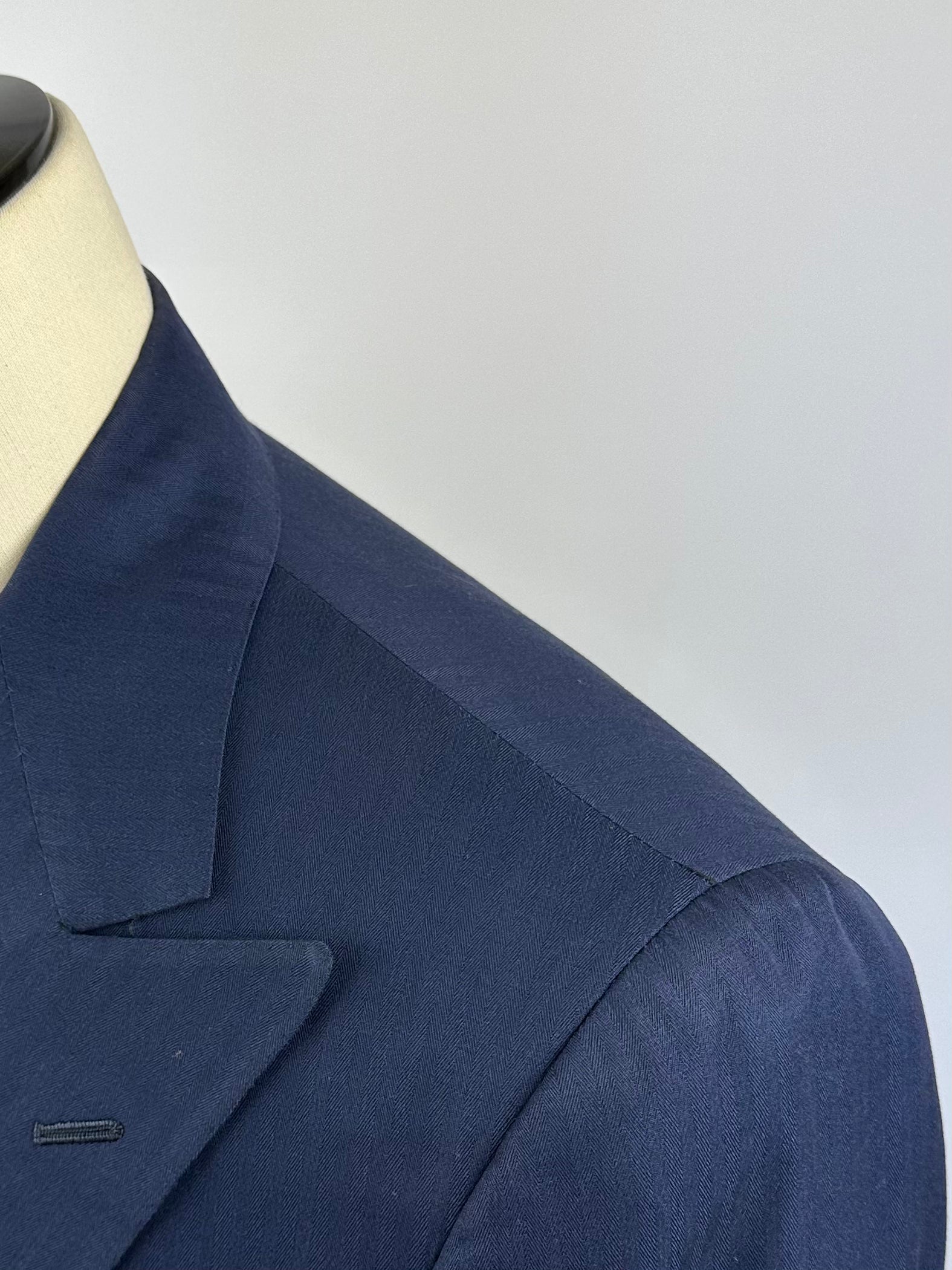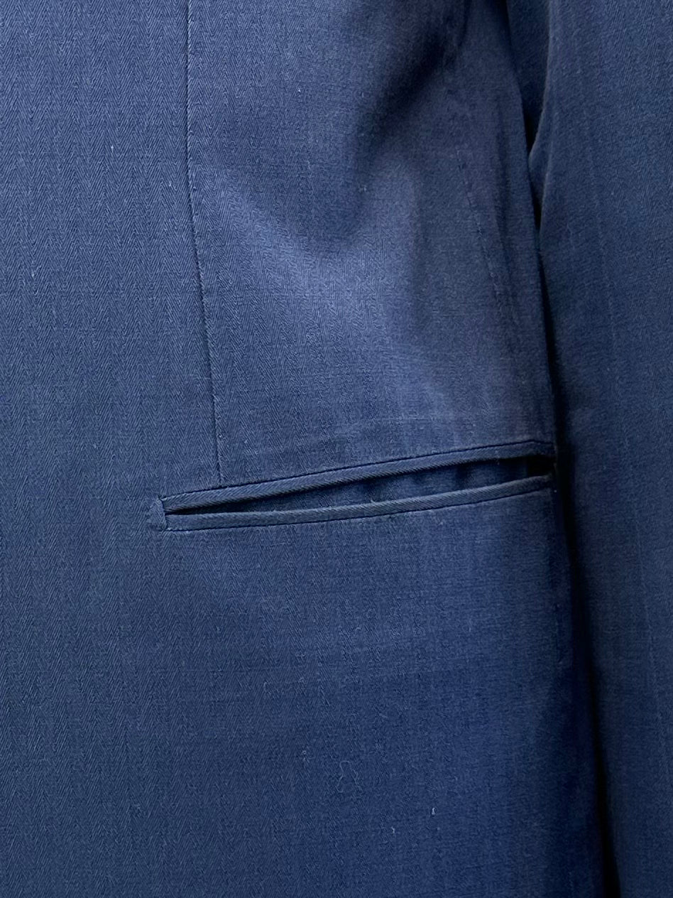 Donkerblauw handgemaakt pak met dubbele rij knopen, gesneden uit luxe katoen-, wol- en zijdemix met een visgraatmotief. Ontdek hieronder de uitgebreide kleermakersdetails.