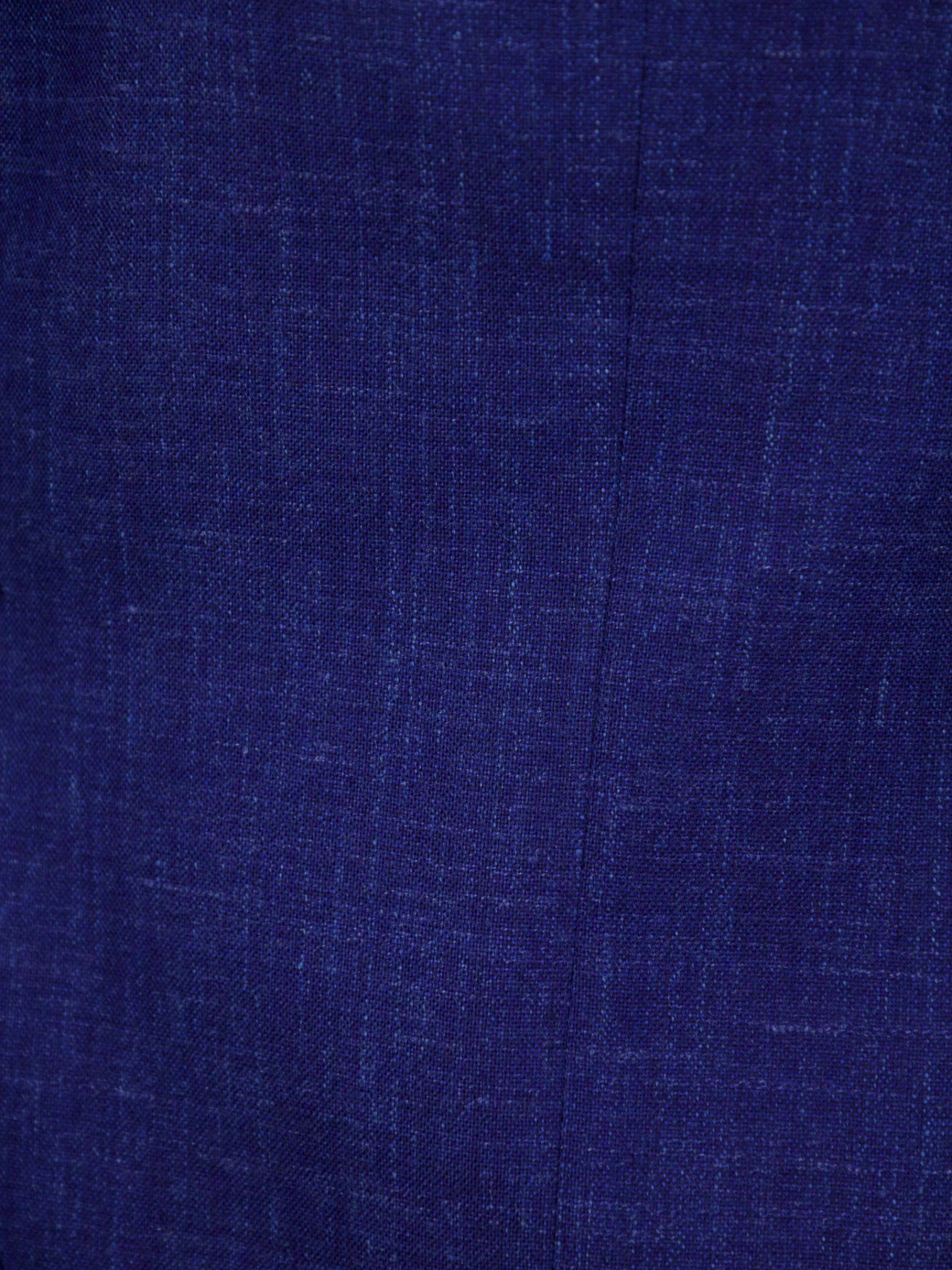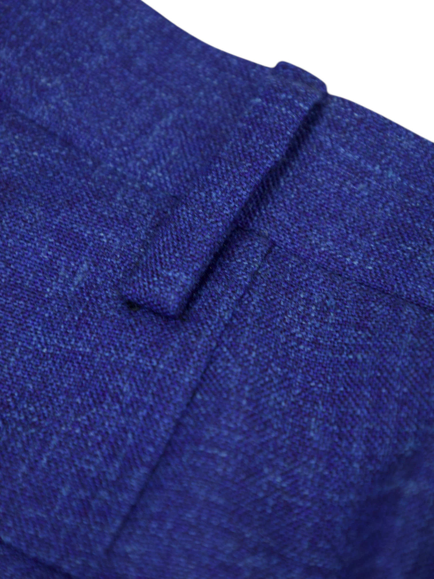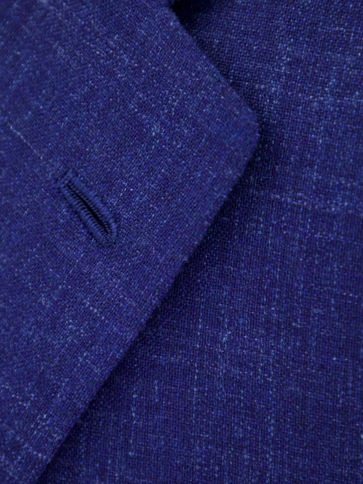 Kobaltblauw handgemaakt pak met één rij knopen, gesneden uit luxe wol-, zijde- en linnenmix met een gemêleerd patroon. Ontdek hieronder de uitgebreide kleermakersdetails.