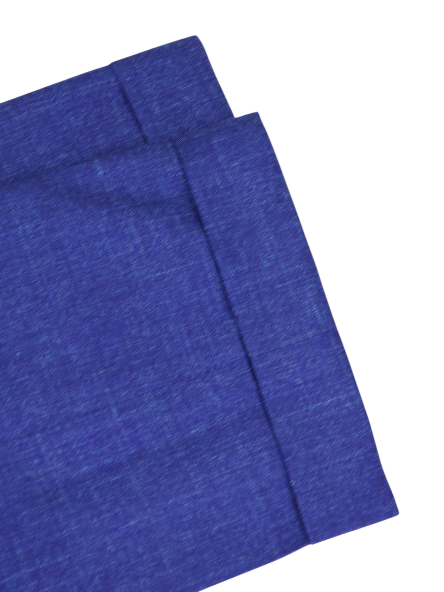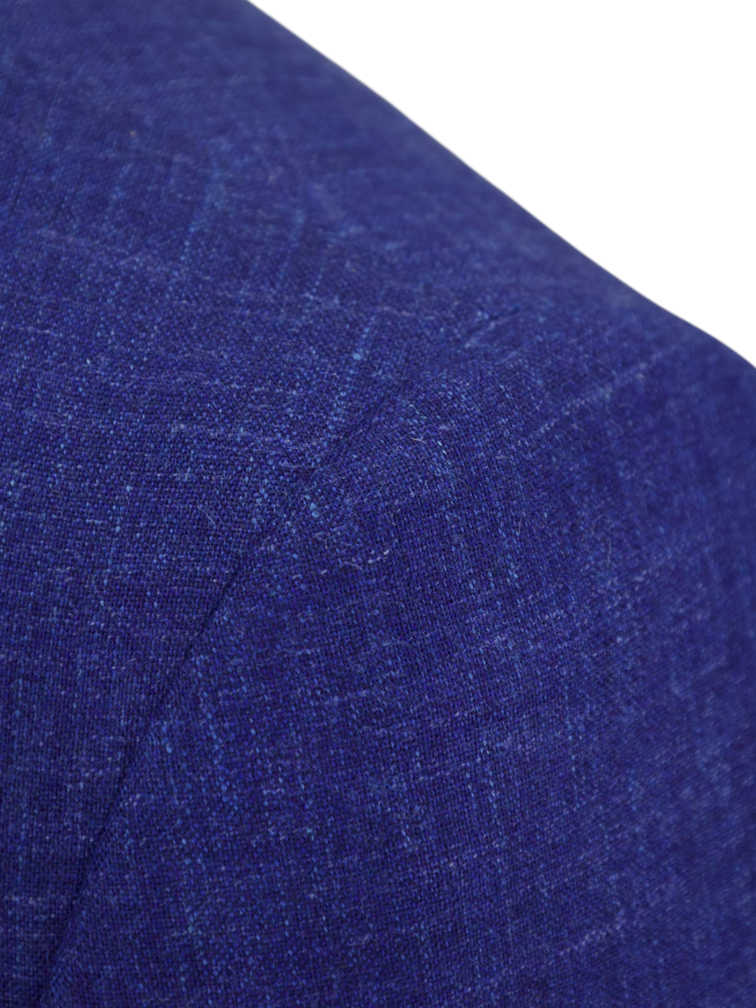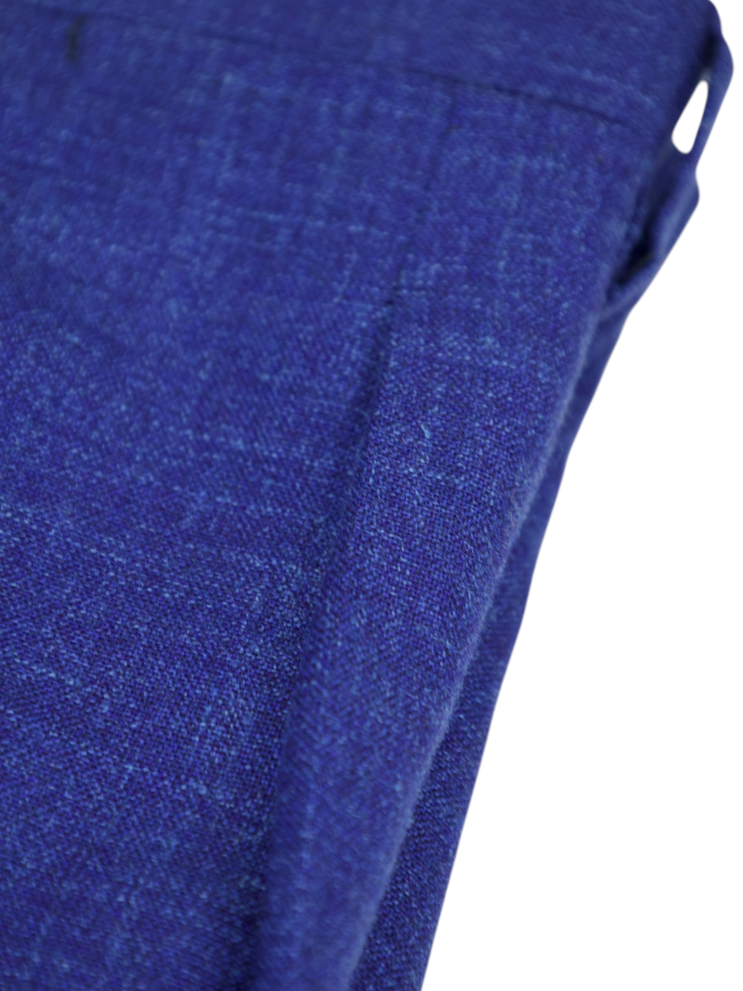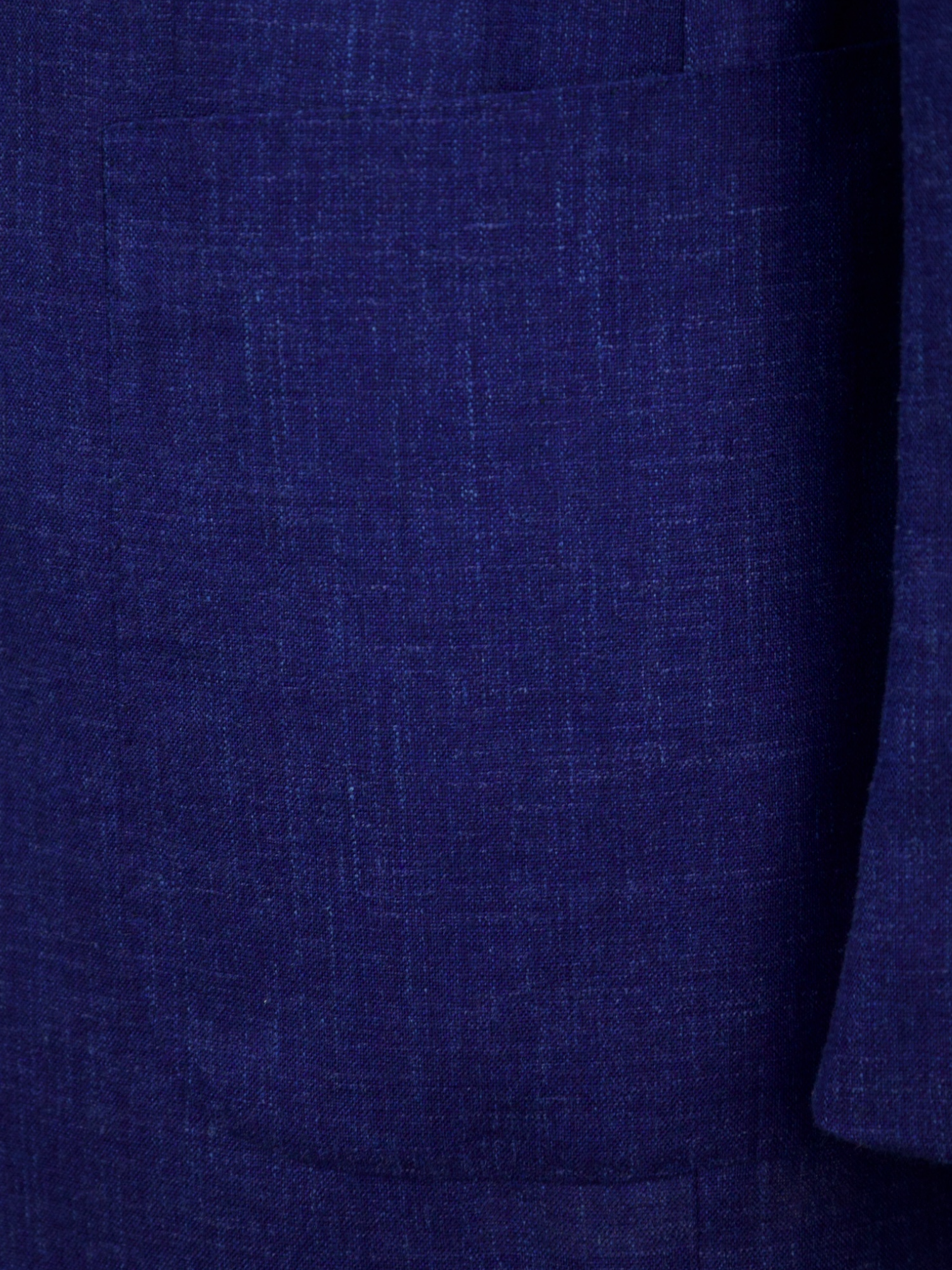 Kobaltblauw handgemaakt pak met één rij knopen, gesneden uit luxe wol-, zijde- en linnenmix met een gemêleerd patroon. Ontdek hieronder de uitgebreide kleermakersdetails.
