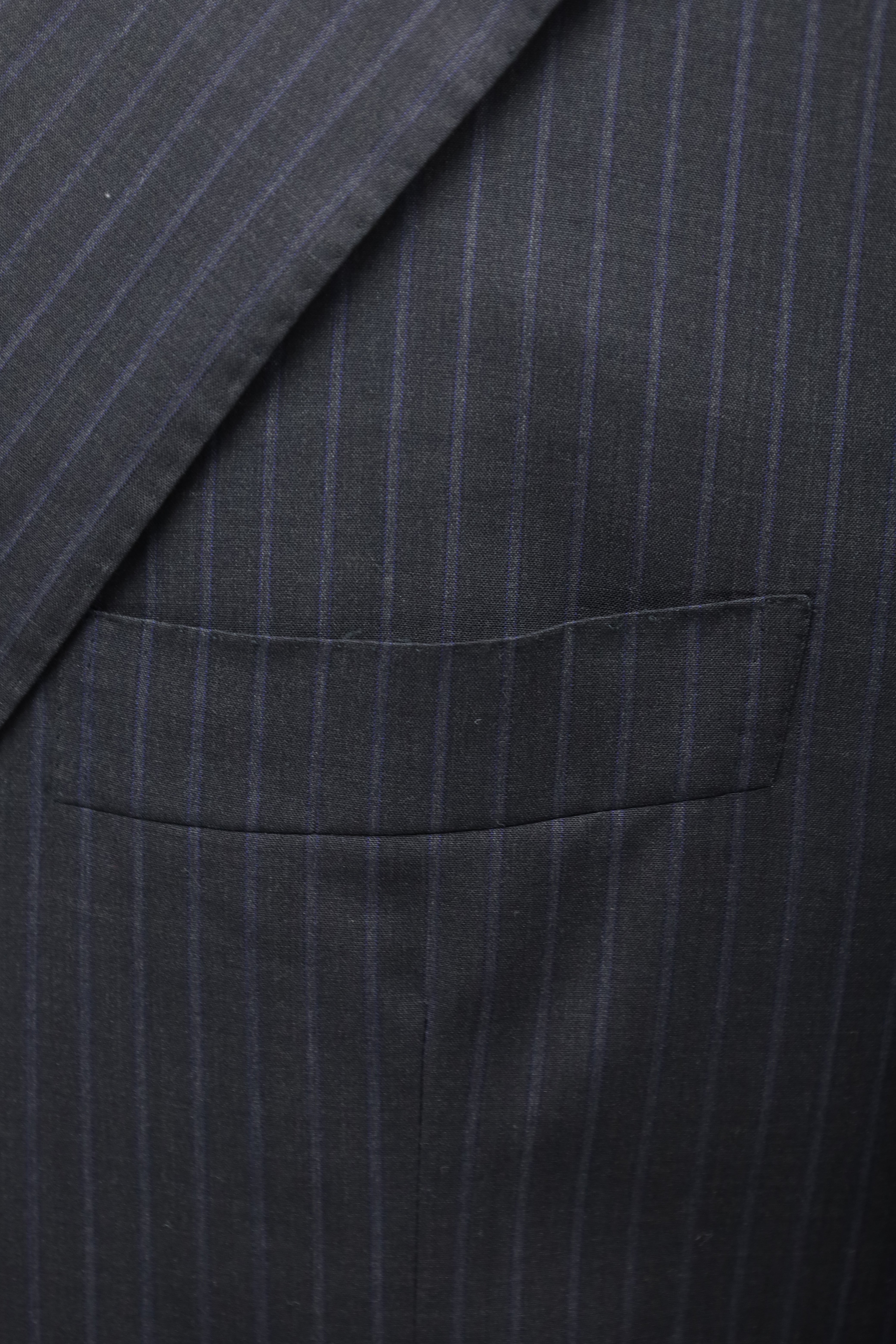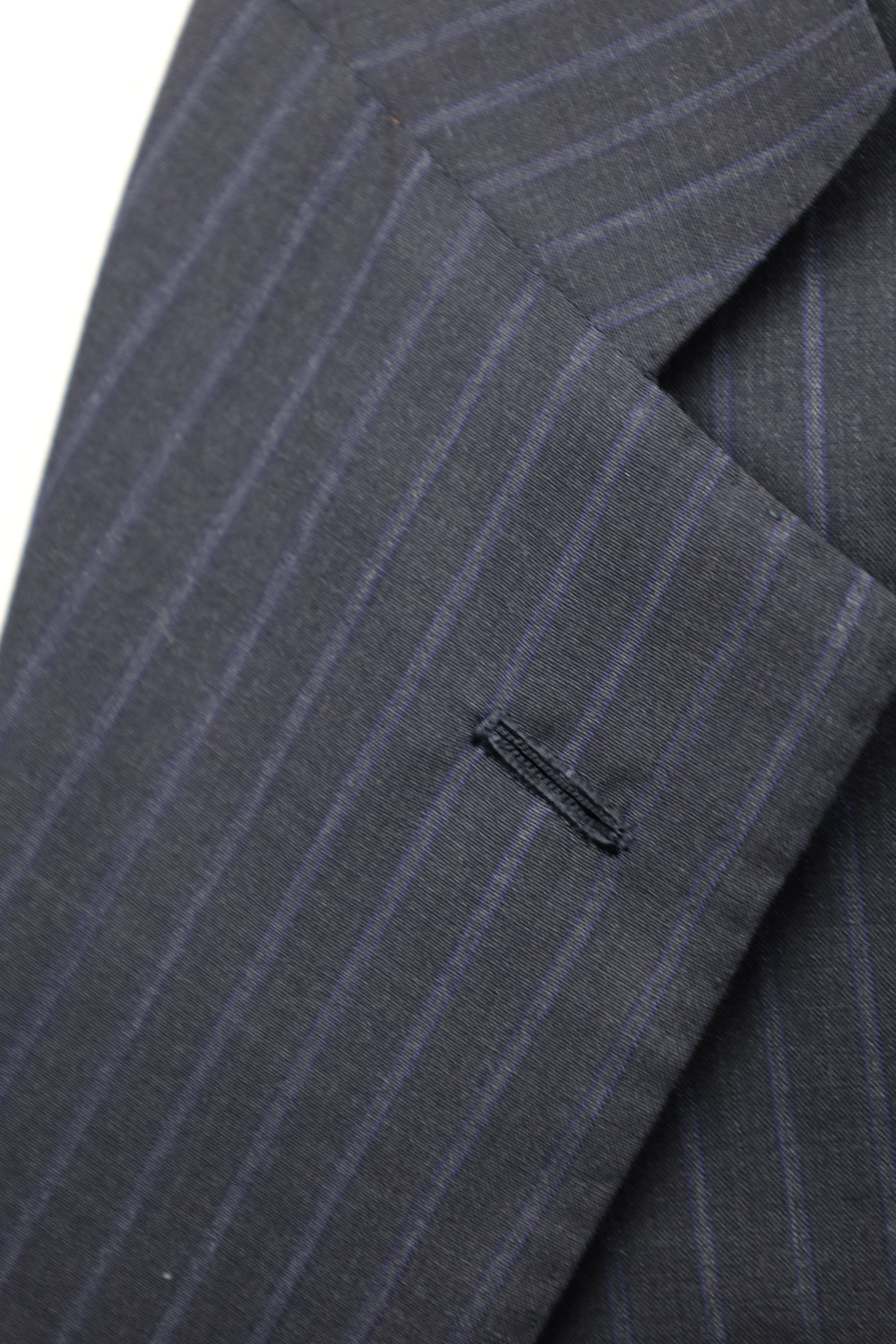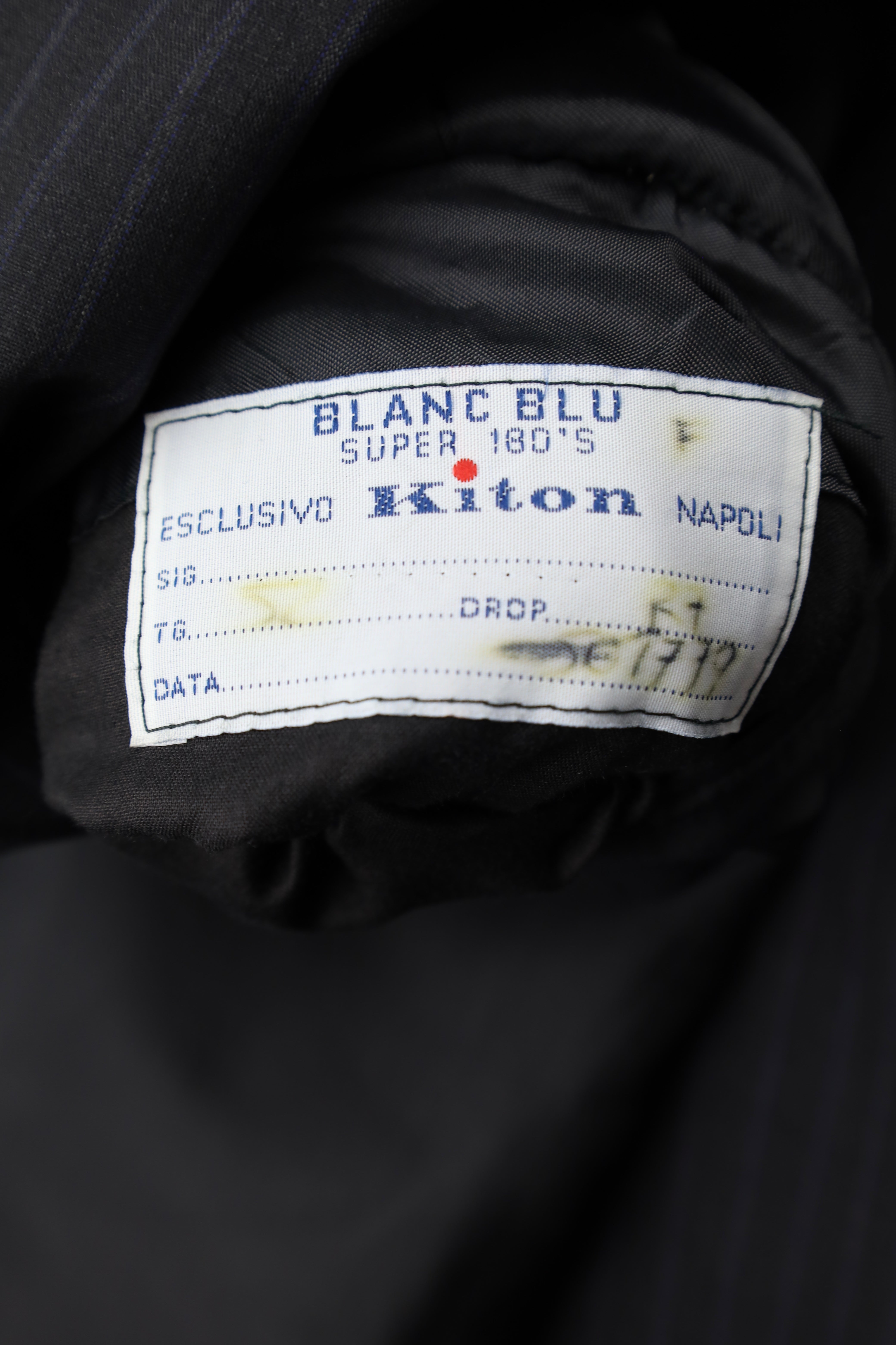 Onthulling van het Kiton donkergrijze Super 180's "Blanc Blu" krijtstreeppak: Dit kleermakersjuweel is ingewikkeld geweven van Super 180's (14 micron) wol, met krijtstrepen die de aandacht trekken en toch een sfeer van ingetogen elegantie behouden. De broek is op meesterlijke wijze op maat gemaakt met een frisse plooi en omgeslagen zoom, wat de samenhangende uitstraling van het pak versterkt. Op het Kiton-label staat "cucito a mano" (met de hand genaaid) van Grisal, wat dit ensemble markeert als een toppunt van ambachtelijke uitmuntendheid.