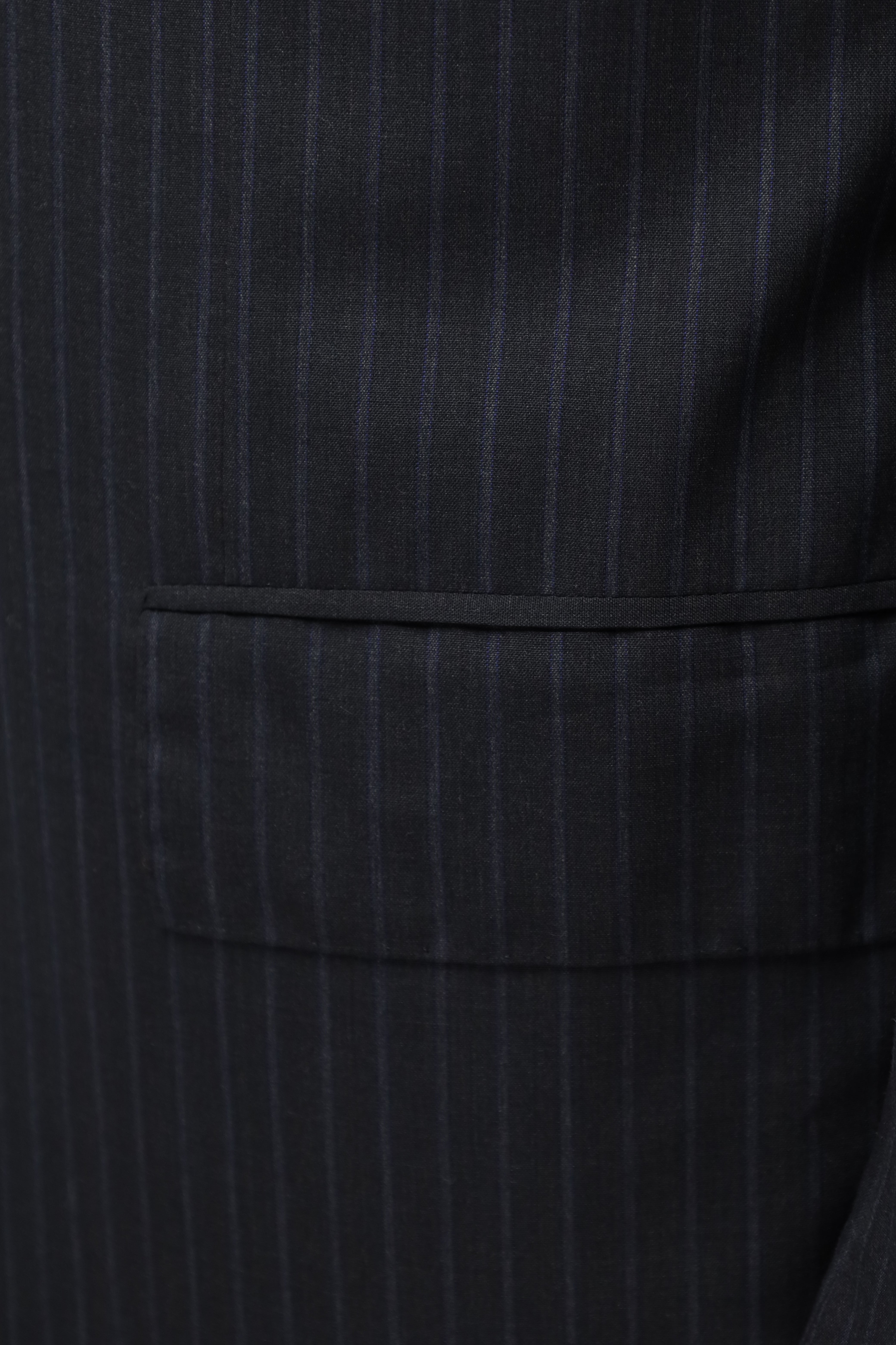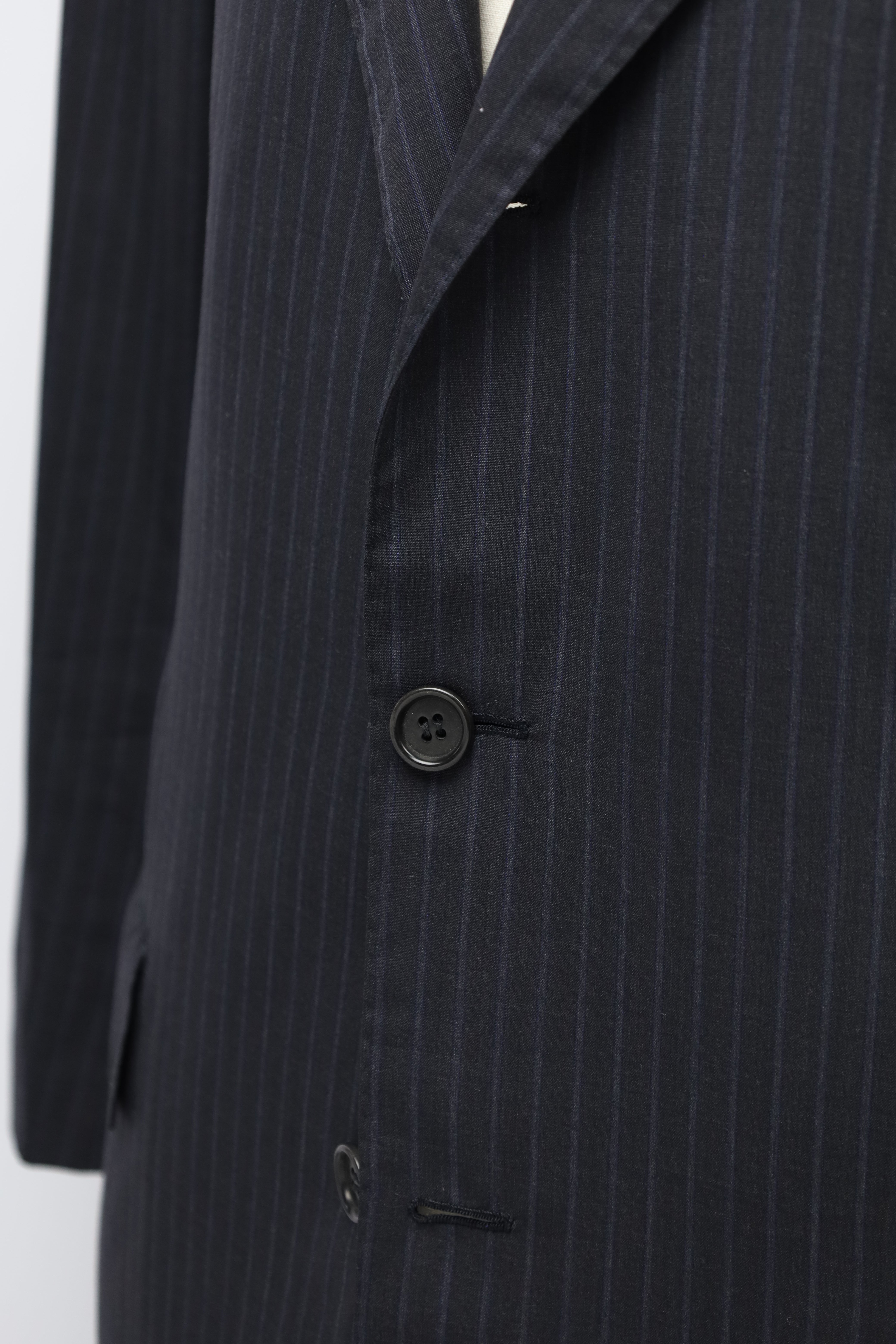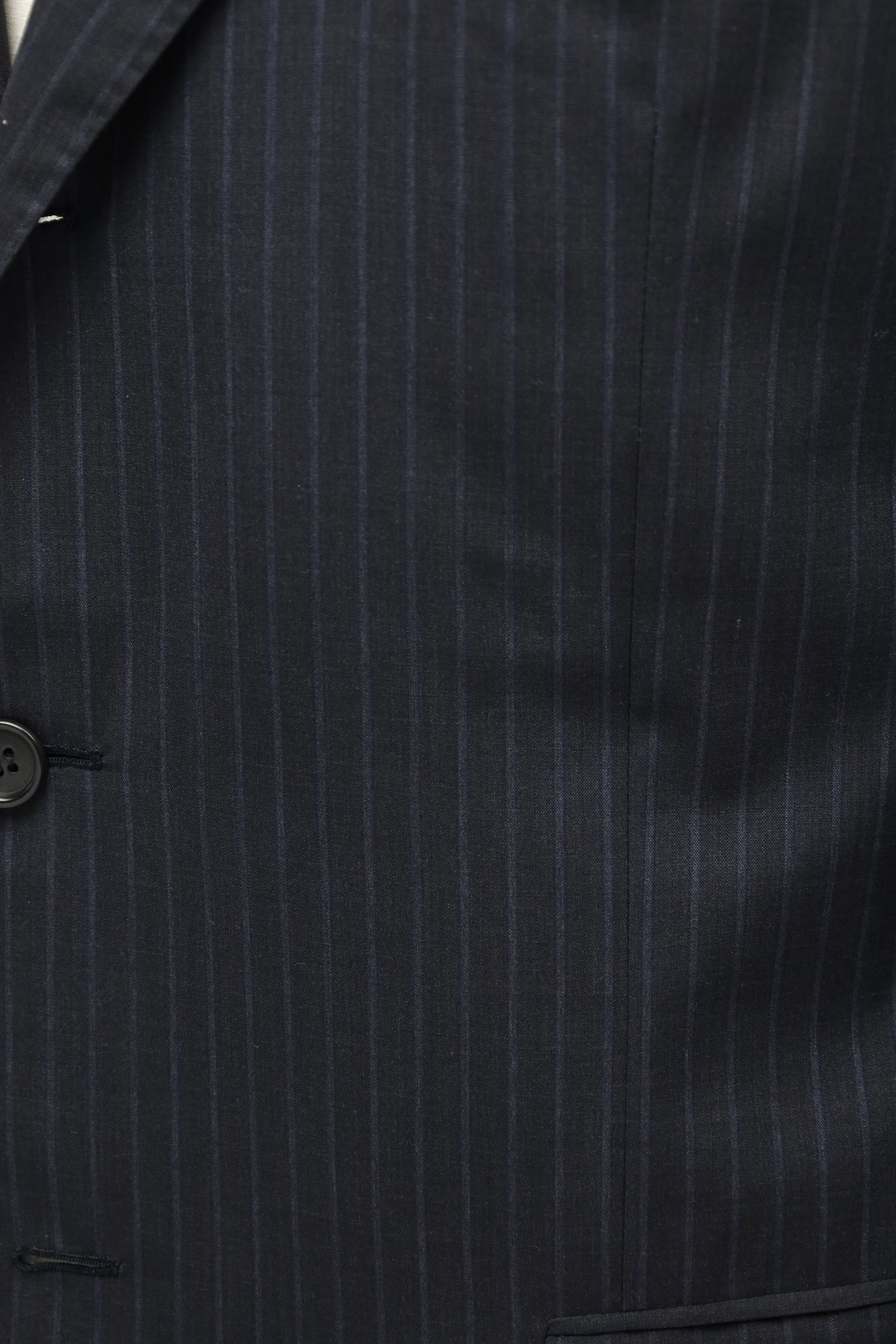 Onthulling van het Kiton donkergrijze Super 180's "Blanc Blu" krijtstreeppak: Dit kleermakersjuweel is ingewikkeld geweven van Super 180's (14 micron) wol, met krijtstrepen die de aandacht trekken en toch een sfeer van ingetogen elegantie behouden. De broek is op meesterlijke wijze op maat gemaakt met een frisse plooi en omgeslagen zoom, wat de samenhangende uitstraling van het pak versterkt. Op het Kiton-label staat "cucito a mano" (met de hand genaaid) van Grisal, wat dit ensemble markeert als een toppunt van ambachtelijke uitmuntendheid.
