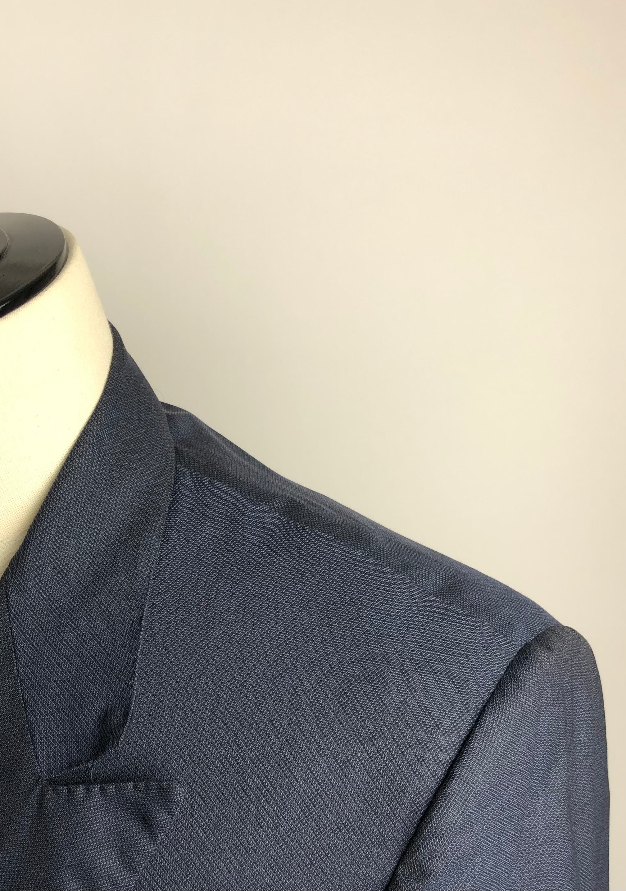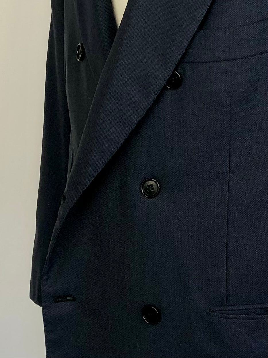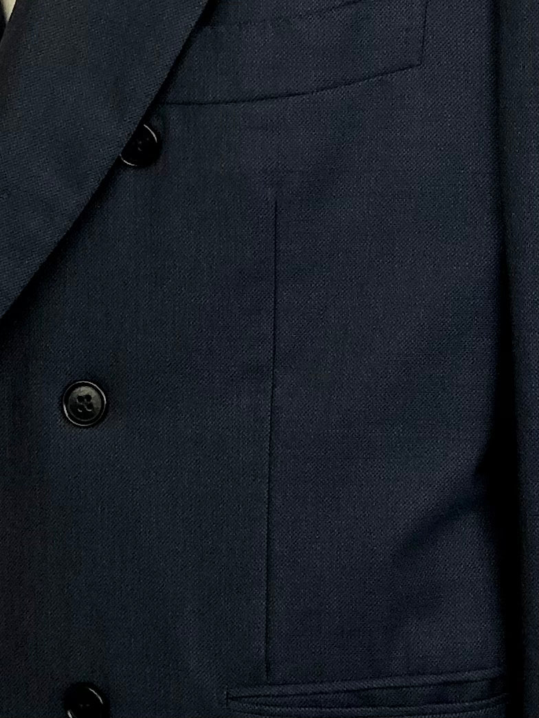 Marineblauw double-breasted jack van zachte scheerwol Super 110 met een birdseye-patroon. Ontdek hieronder de uitgewerkte kleermakersdetails.