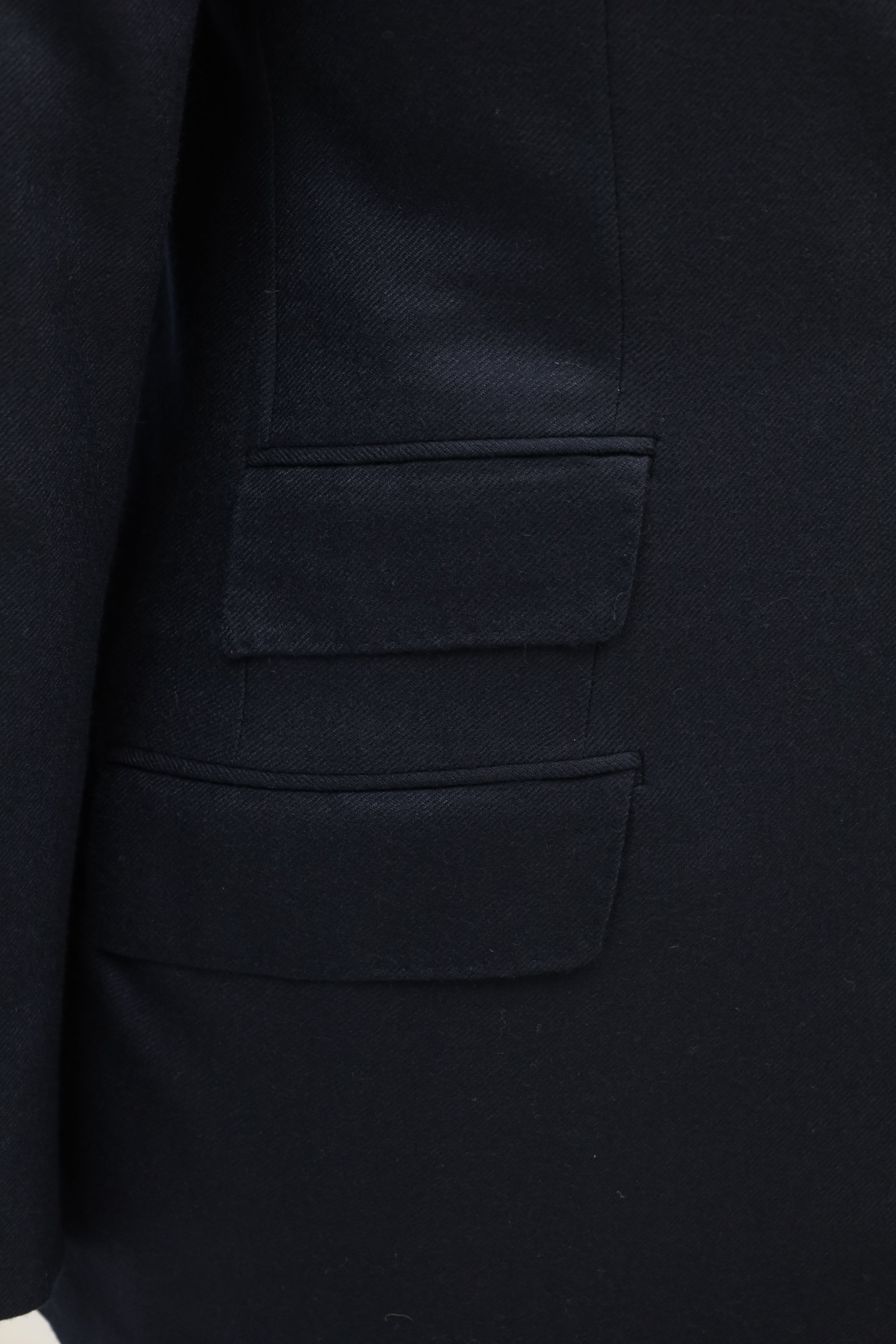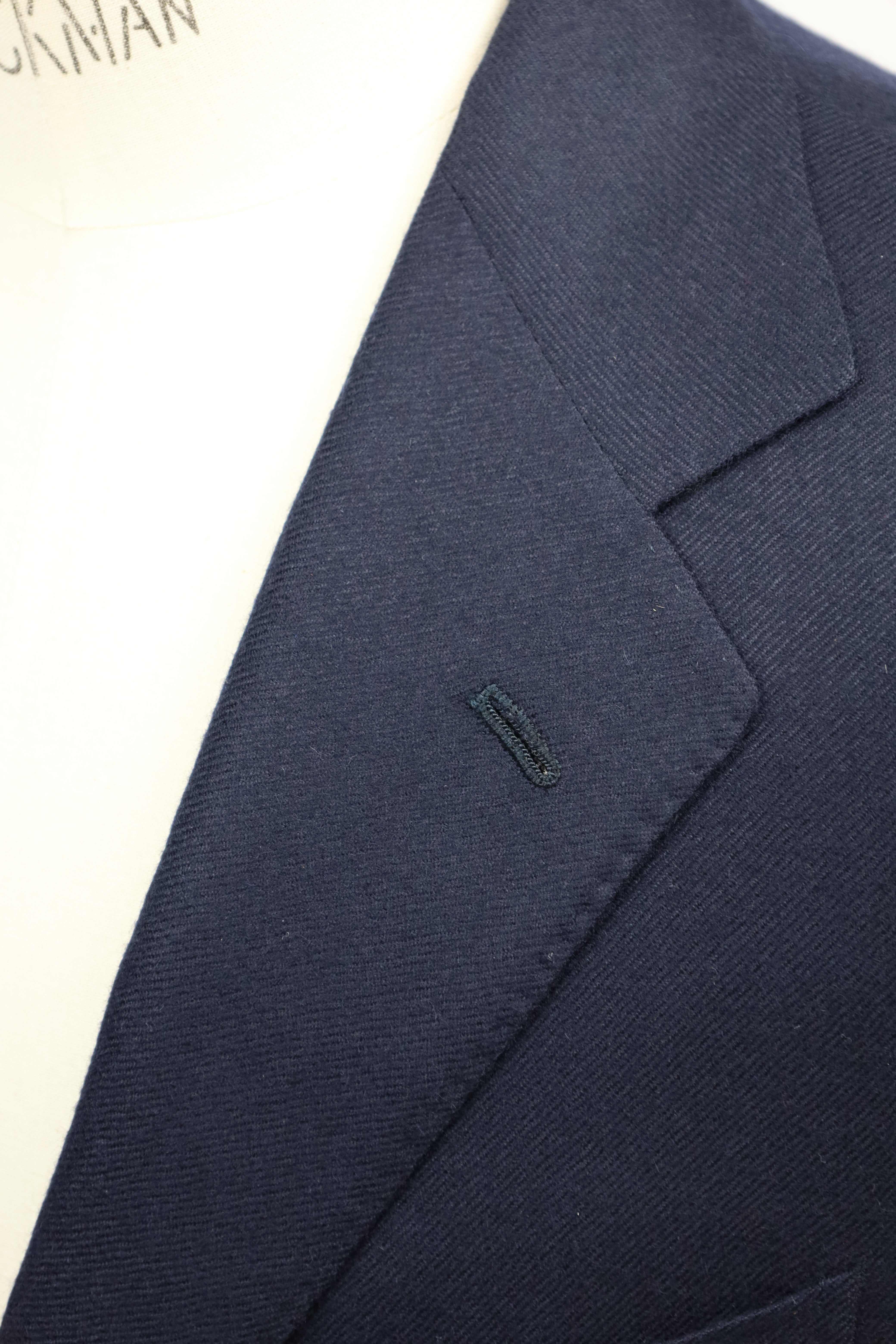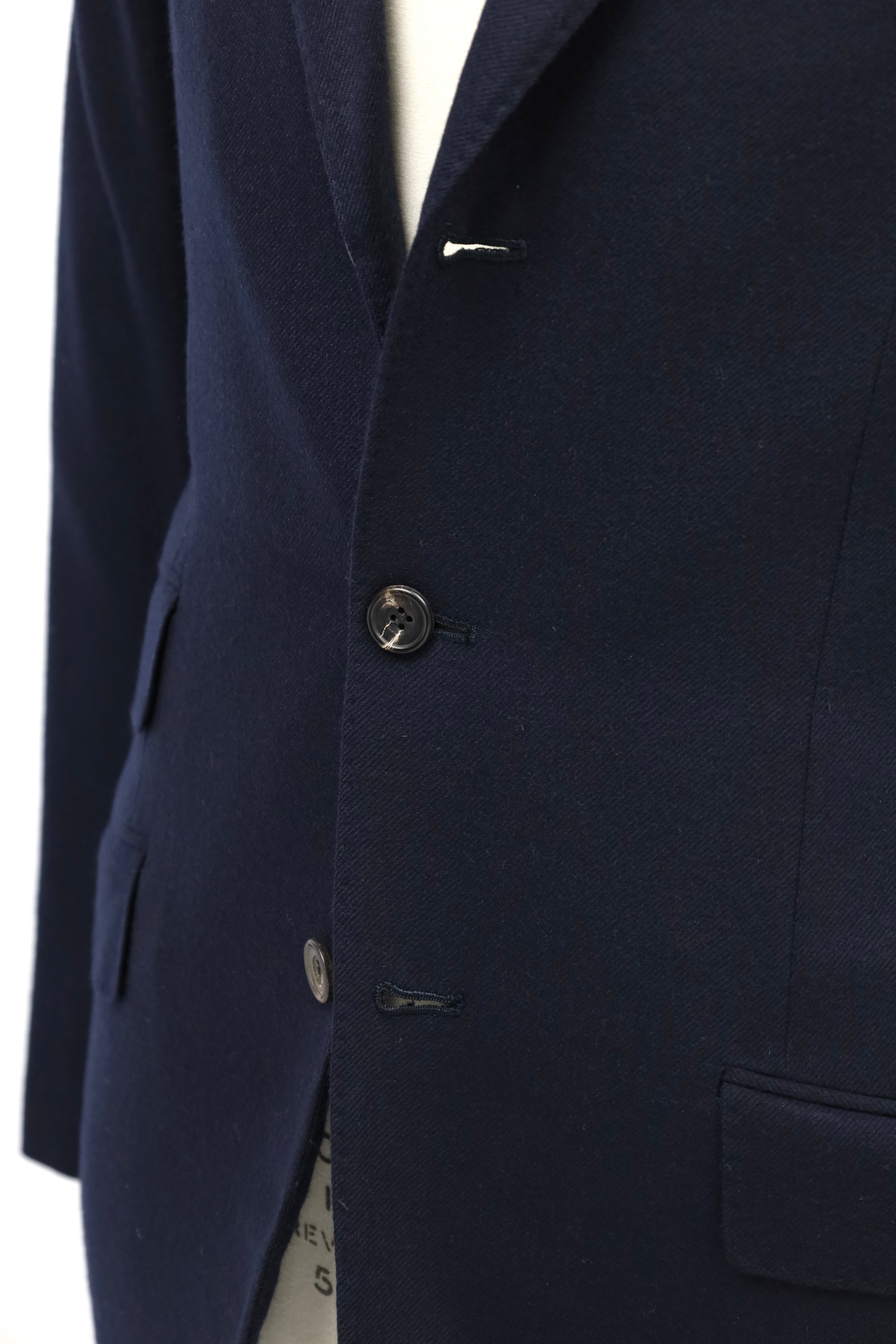 Handgemaakt jasje in twill-motief. Notch-revers, half gevoerd, vakkundig vervaardigd uit extrafijn kasjmier met dubbele zijsplitten aan de achterkant en 2,5-knoopssluiting. De ingekeepte revers en de paspelzak op de borst zijn onmiskenbaar klassiek. Ontdek hieronder de uitgebreide kleermakersdetails.