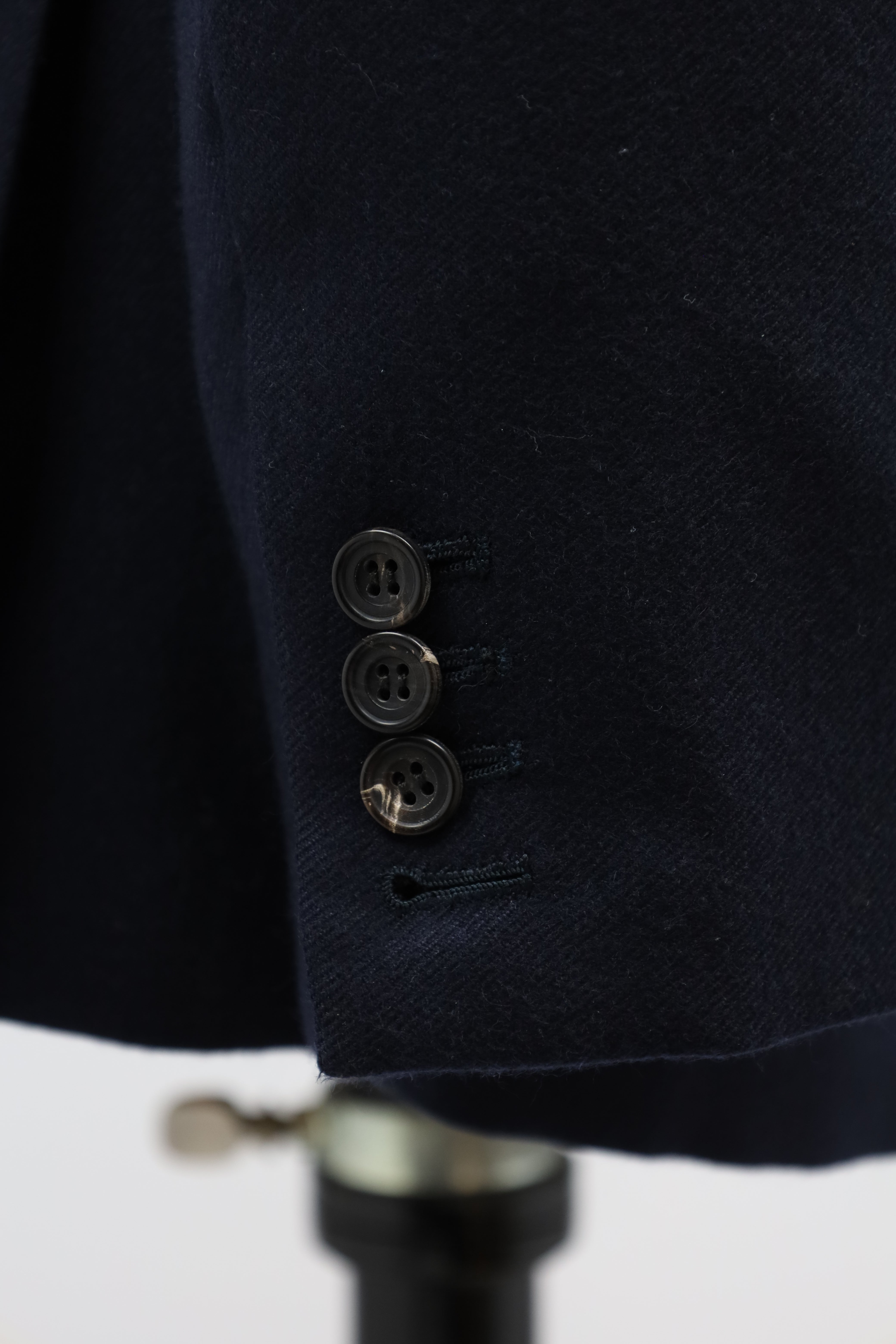 De 'tre bottoni stirato a due', ook bekend als de drie rollend op twee reversstijl, is misschien wel het meest beruchte kenmerk van het Neapolitaanse stijl jasje. De bovenste knoop en knoopsgat zijn decoratief, dus blijven ongeknoopt. Terwijl de revers omlaag rolt, vouwt het elegant over de bovenste knoop en stopt net 4 cm boven de tweede knoop, wat de kenmerkende rol van de revers creëert waar de stijl om bekend staat. Omdat het bedoeld is om ongeknoopt te blijven, wordt het bovenste knoopsgat eigenlijk binnenstebuiten gemaakt, zodat de mooie kant nog steeds zichtbaar is.