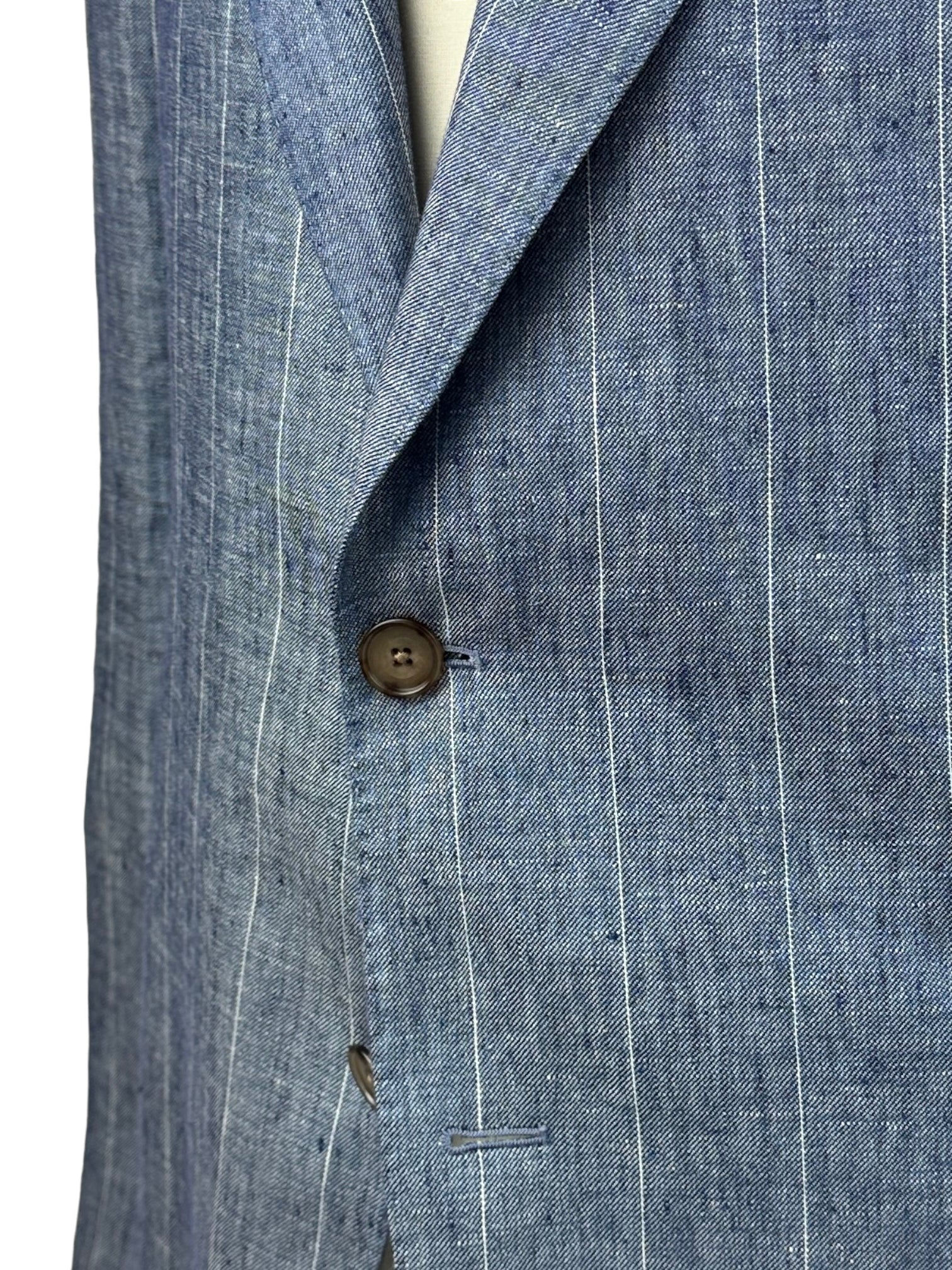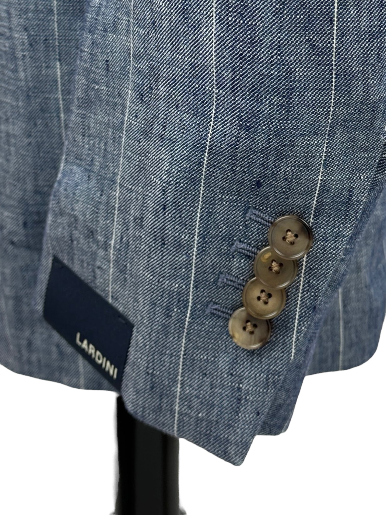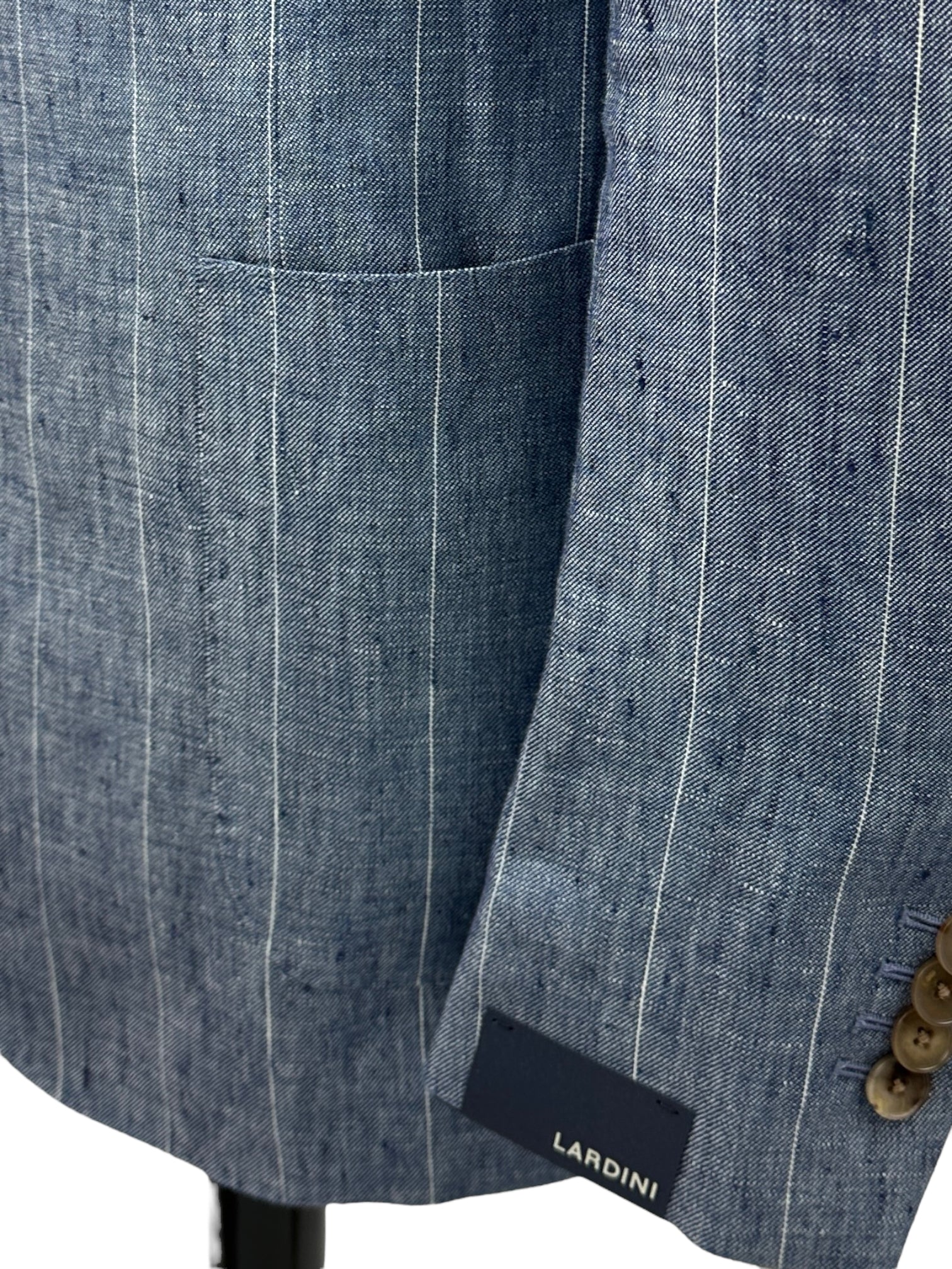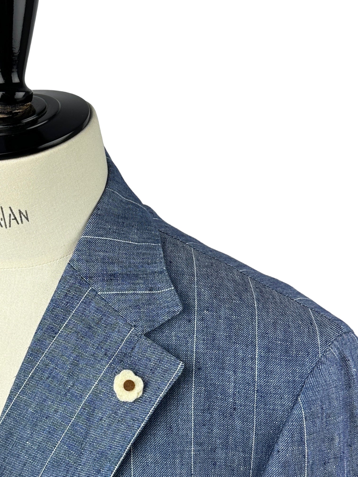Het Lardini Denim Blue Pinstripe Jacket, gemaakt van 100% linnen, straalt een mix uit van casual elegantie en verfijnde charme. Dit stuk valt op als een belichaming van Lardini's toewijding aan kwaliteit en stijl, op maat gemaakt voor de moderne heer die zowel comfort als uitmuntende kleding waardeert.