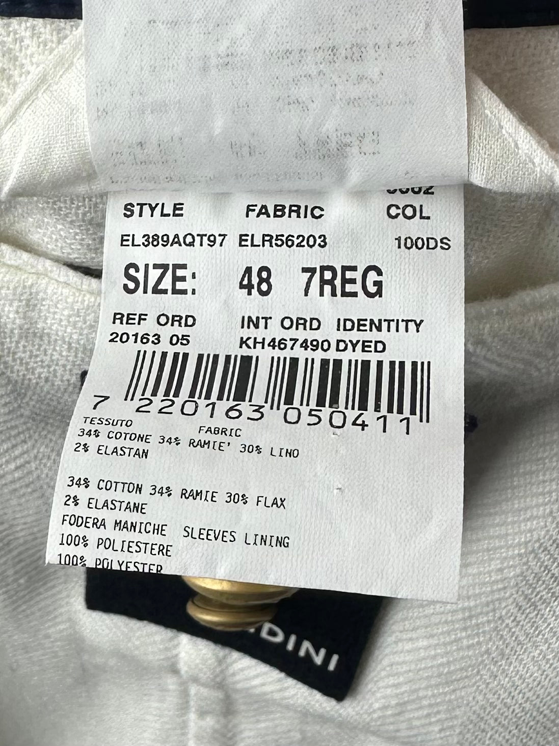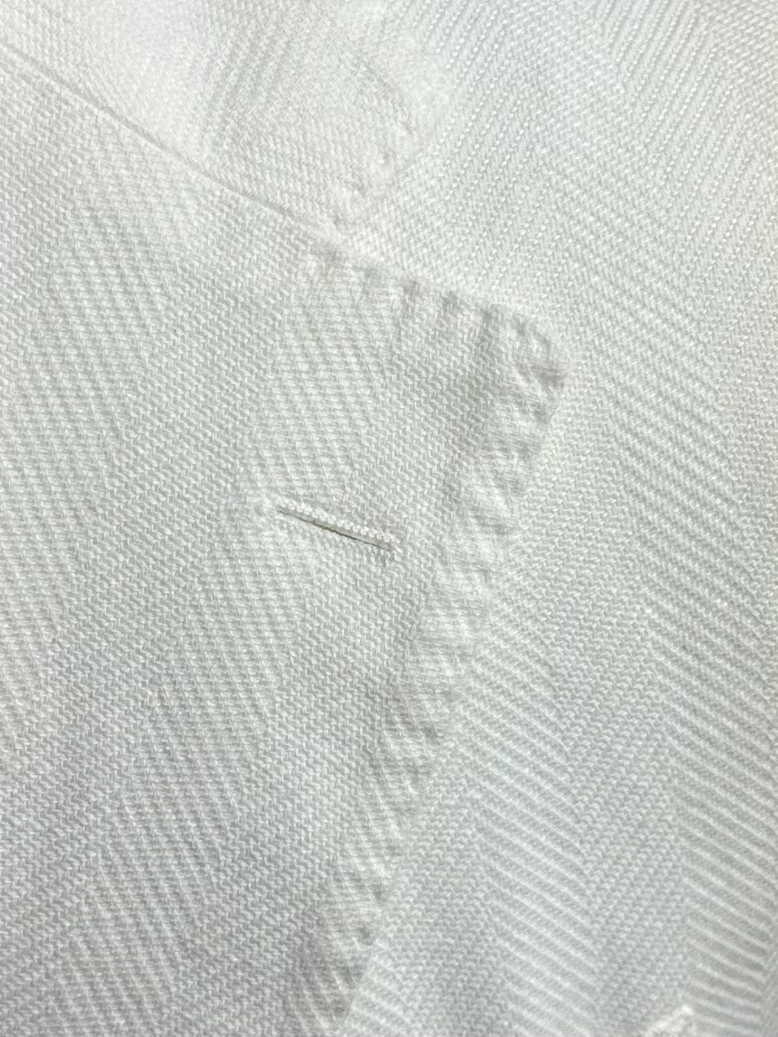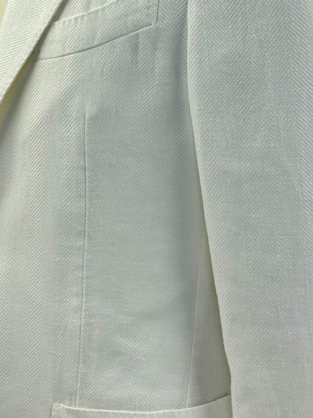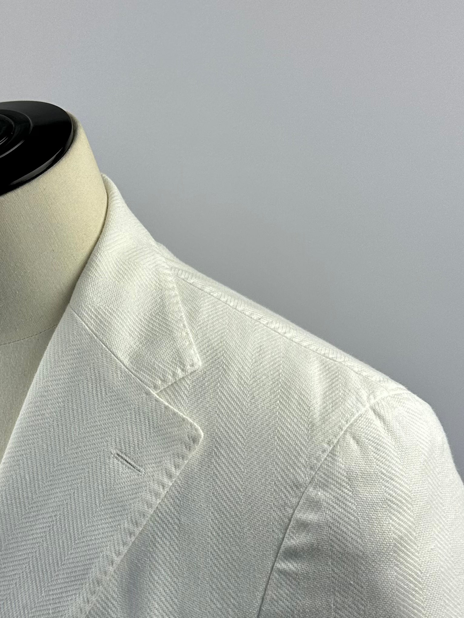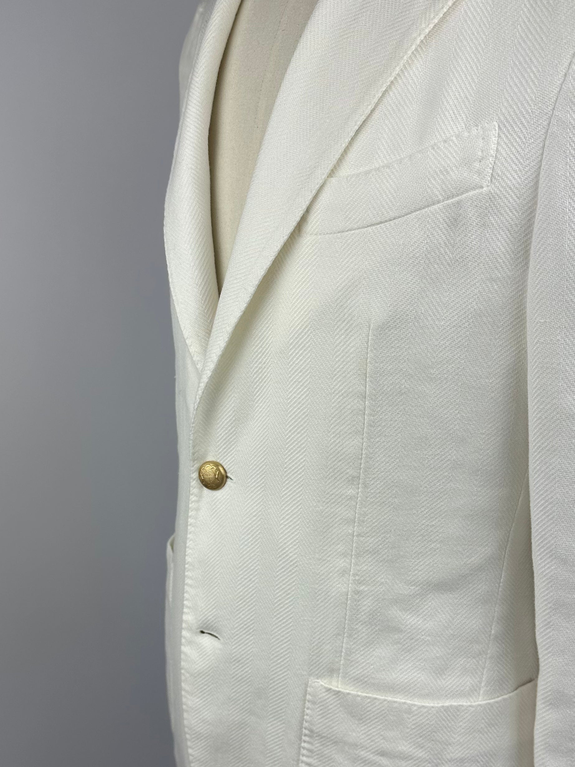 Ongeconstrueerd zomerjack gemaakt van een lichtgewicht katoen-, ramee- en linnenmix met notch-revers, opgestikte zakken en afgewerkt met gouden knopen - wat het extra flair geeft. Ontdek hieronder de uitgebreide kleermakersdetails.