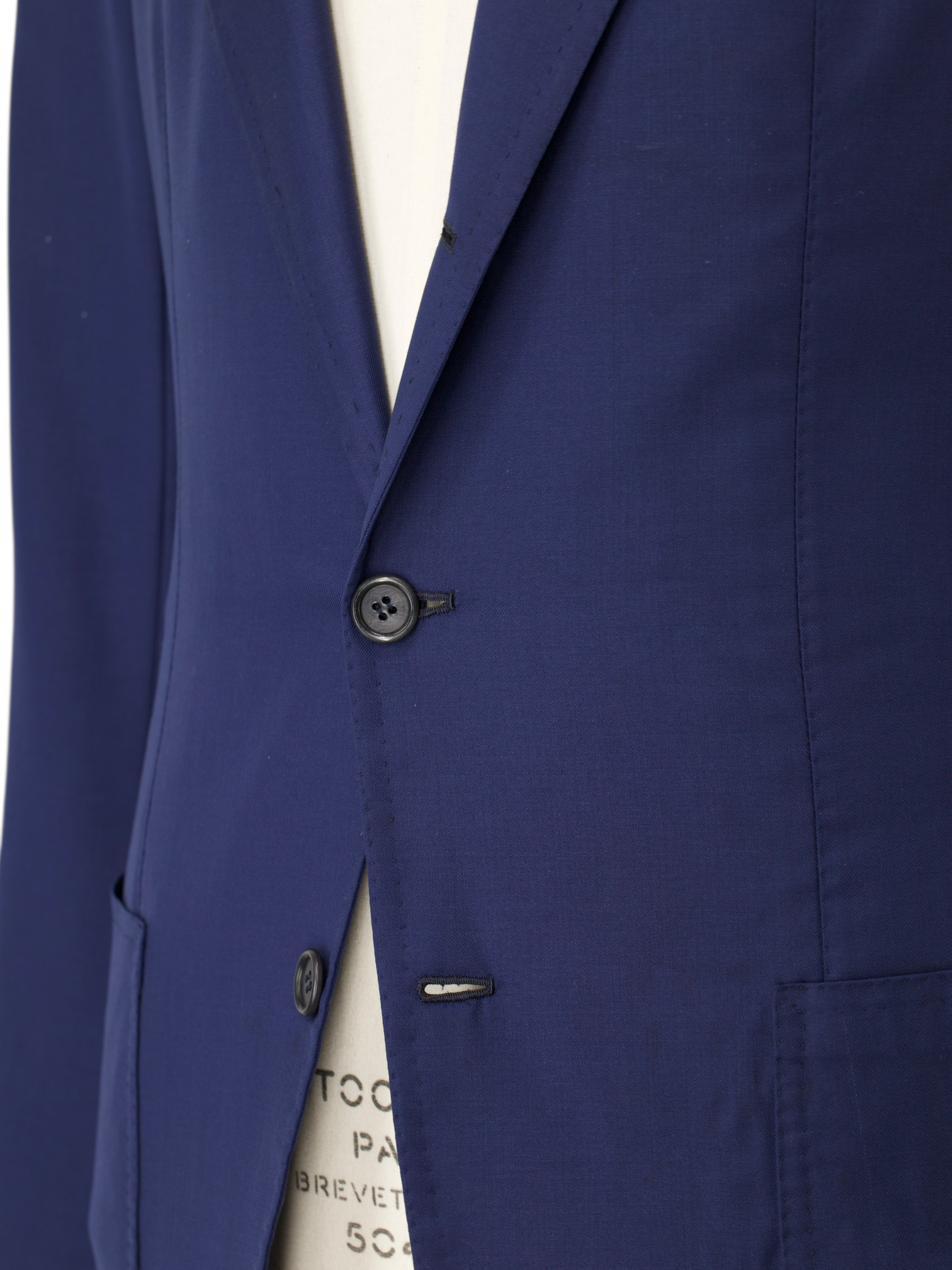 De 'tre bottoni stirato a due', ook bekend als de drie rollend op twee reversstijl, is misschien wel het meest beruchte kenmerk van het Neapolitaanse stijl jasje. De bovenste knoop en knoopsgat zijn decoratief, dus blijven ongeknoopt. Terwijl de revers omlaag rolt, vouwt het elegant over de bovenste knoop en stopt net 4 cm boven de tweede knoop, wat de kenmerkende rol van de revers creëert waar de stijl om bekend staat. Omdat het bedoeld is om ongeknoopt te blijven, wordt het bovenste knoopsgat eigenlijk binnenstebuiten gemaakt, zodat de mooie kant nog steeds zichtbaar is.