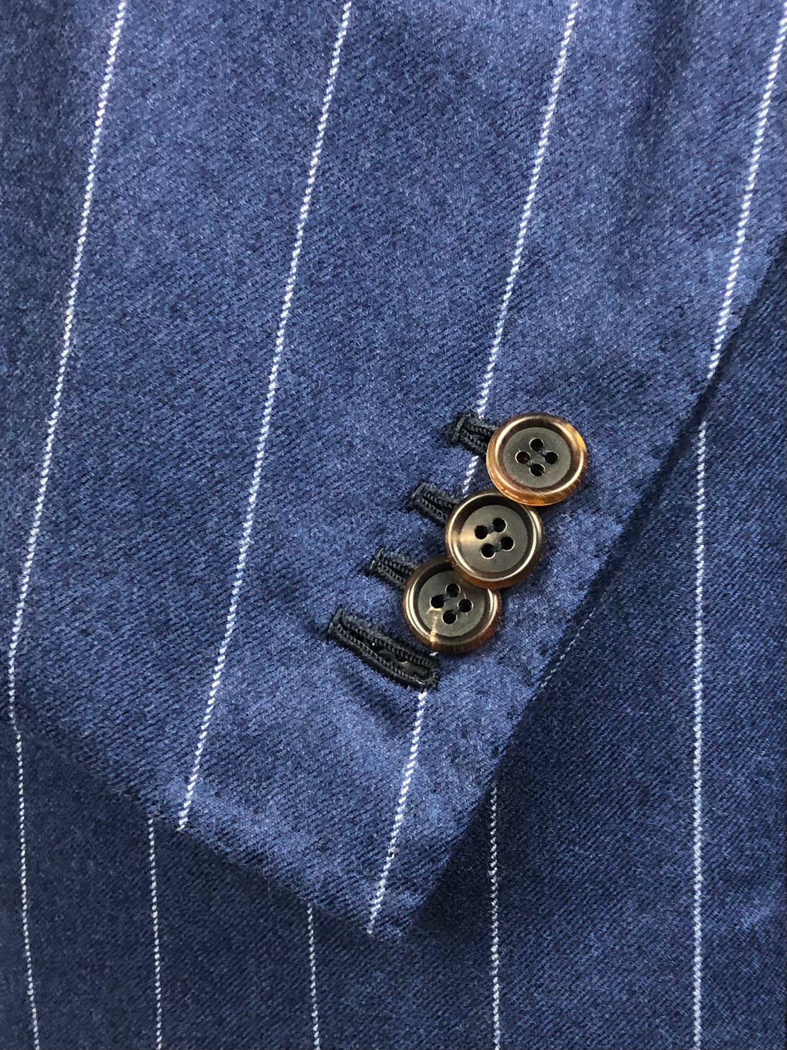 Diagonaal geplaatste knoopsgaten - een typisch detail van Brunello Cucinelli. Functionele kissing buttons - Ook bekend als gestapelde knopen of watervalknopen, kissing buttons worden geassocieerd met Italiaans kleermakerswerk omdat Italiaanse kleermakers hun knoopsgaten op de mouw van het jasje maken in de kissing-stijl. In deze stijl raken de knopen elkaar en overlappen ze elkaar.